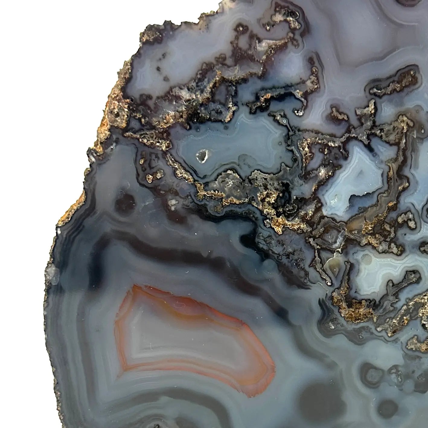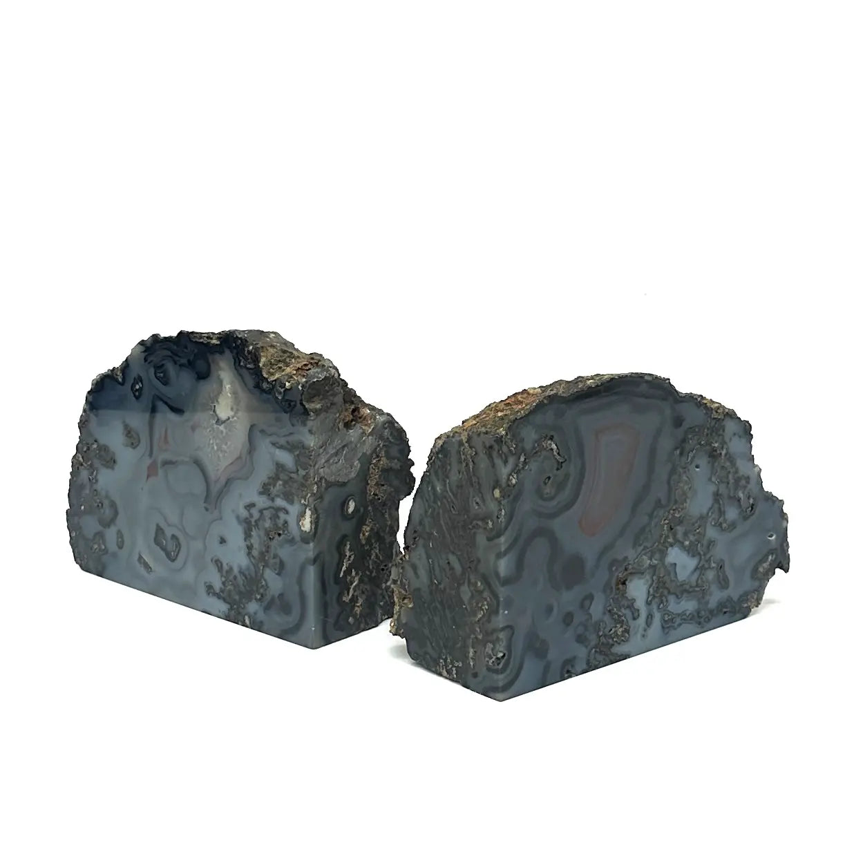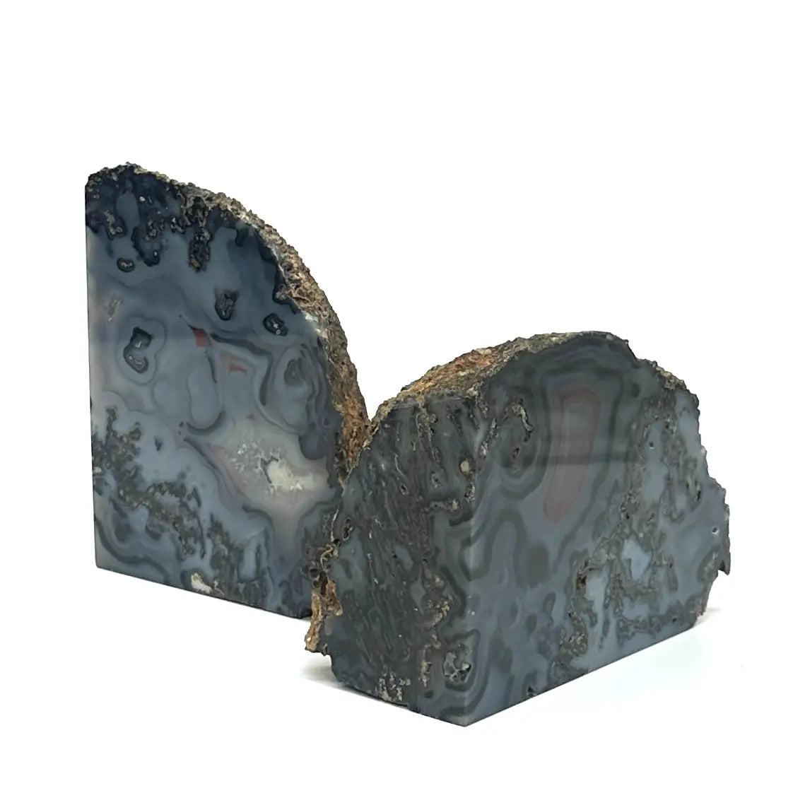 These polished natural, large blue-grey and brown agate bookends feature beautiful banding, organic lacing, and textured edges. A gorgeous, unique piece for your home library, office, or living space.