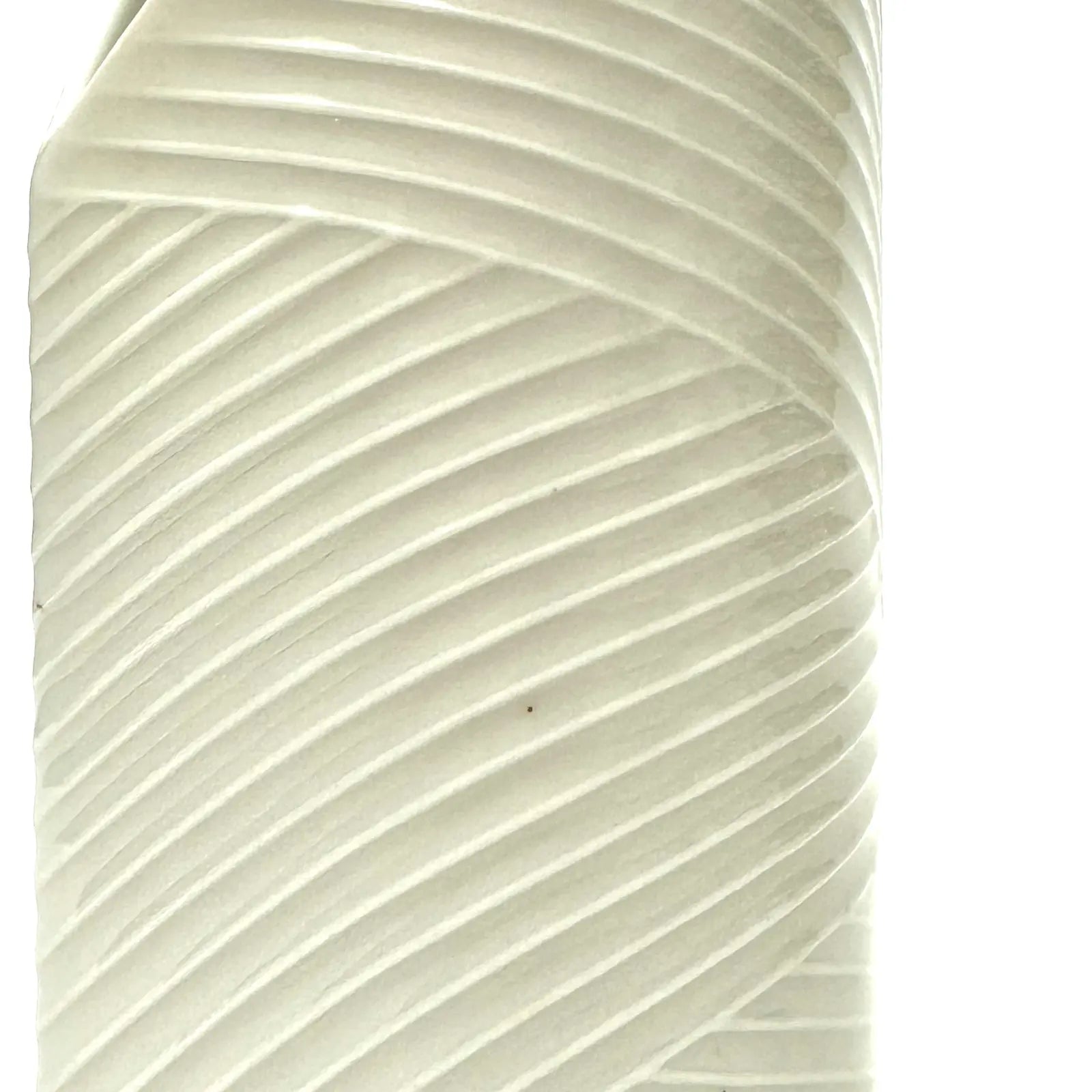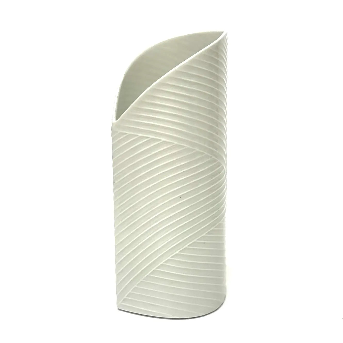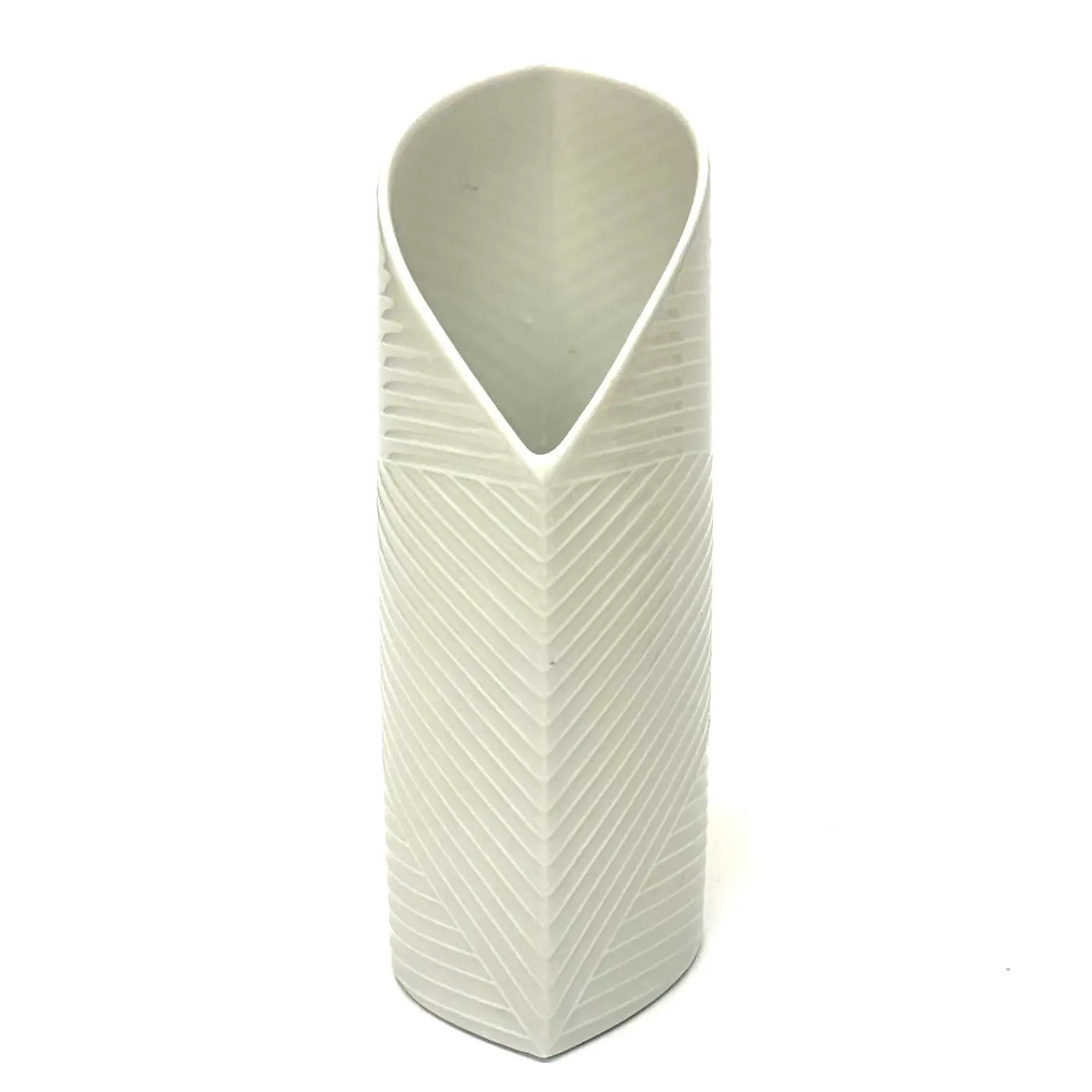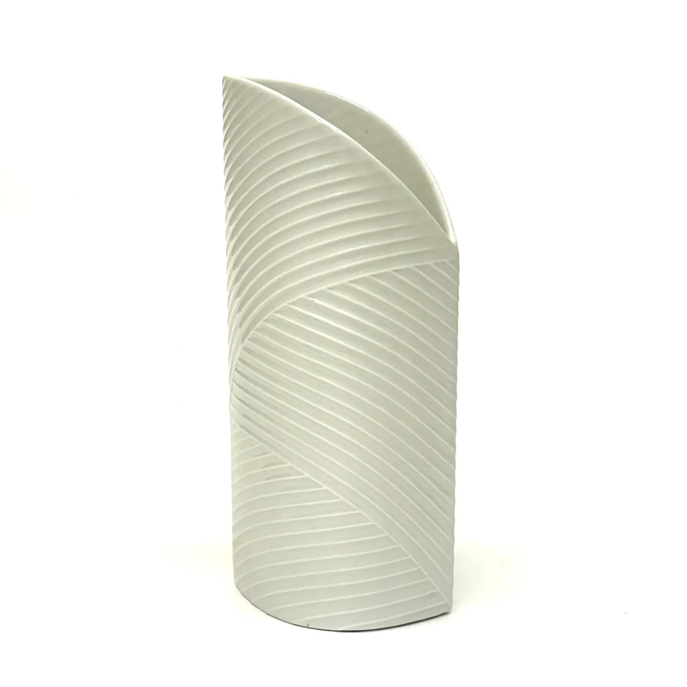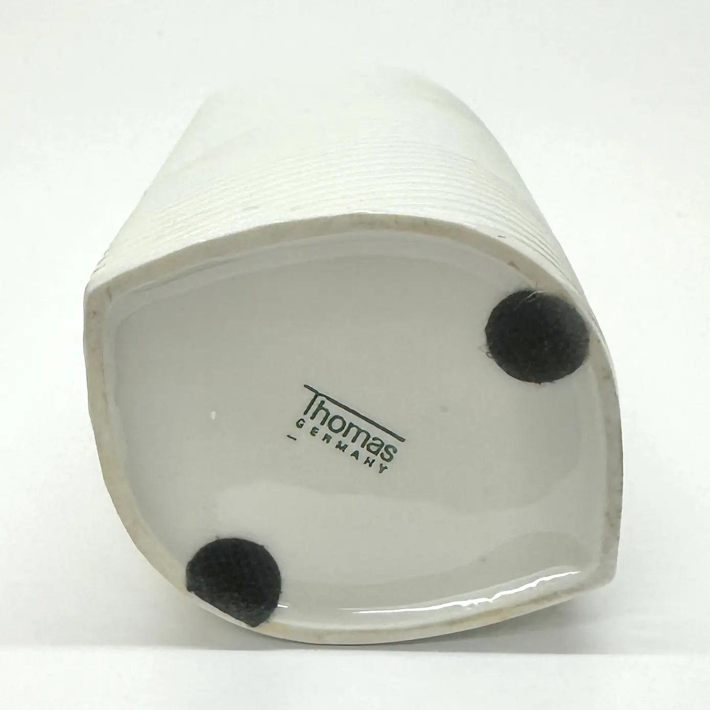 This is a chic 1970s white porcelain asymmetrical vase by Thomas Germany. This beautiful, rare, minimal vase features a glossy finish and a textured ribbed design. In excellent vintage condition, a minor crack on the rim could be a manufacturing defect.