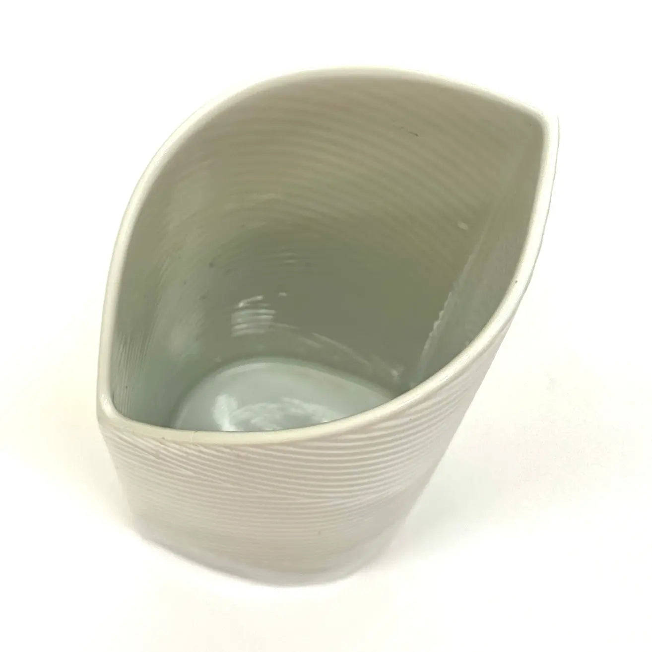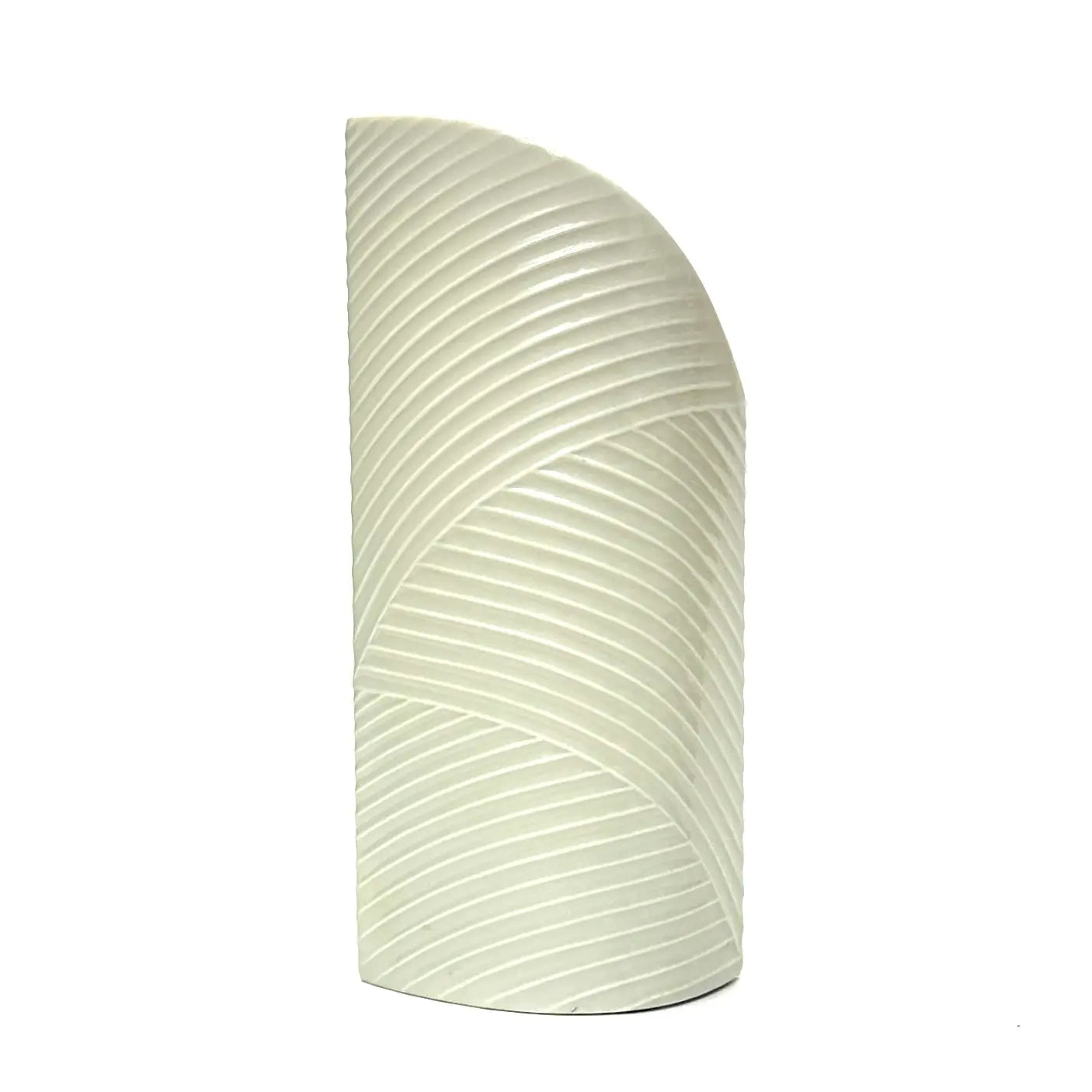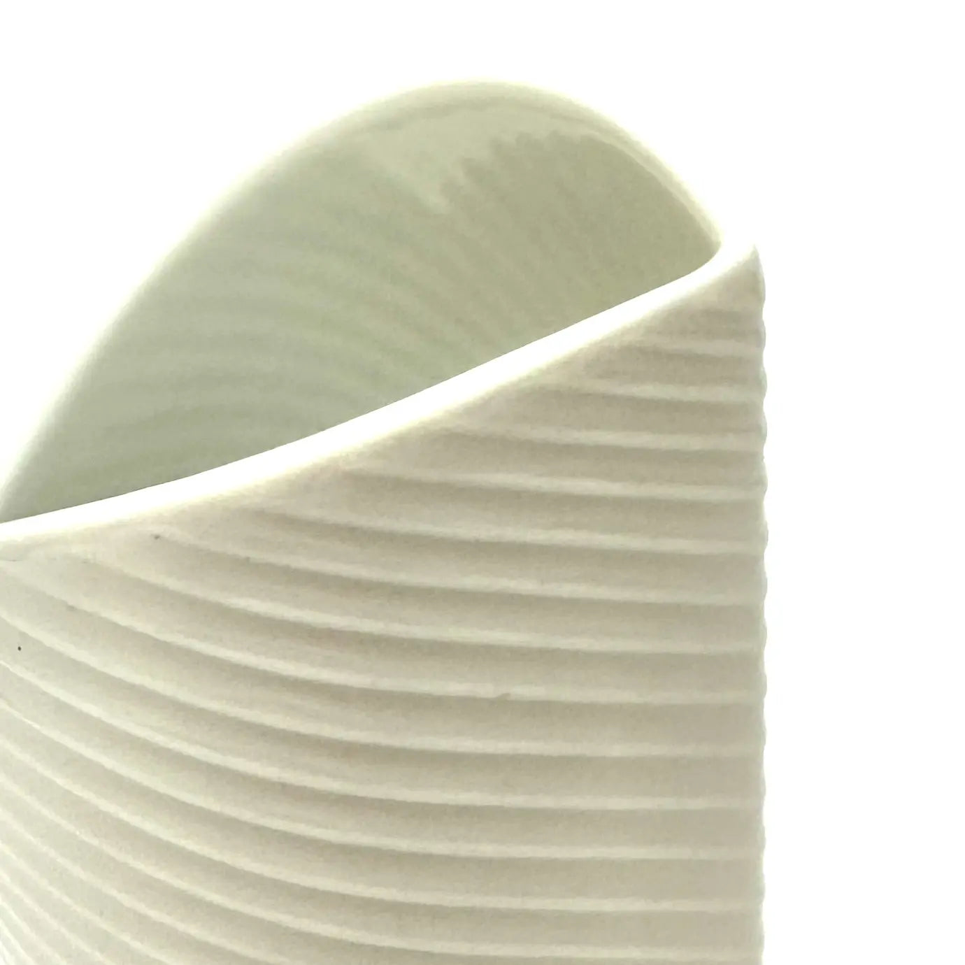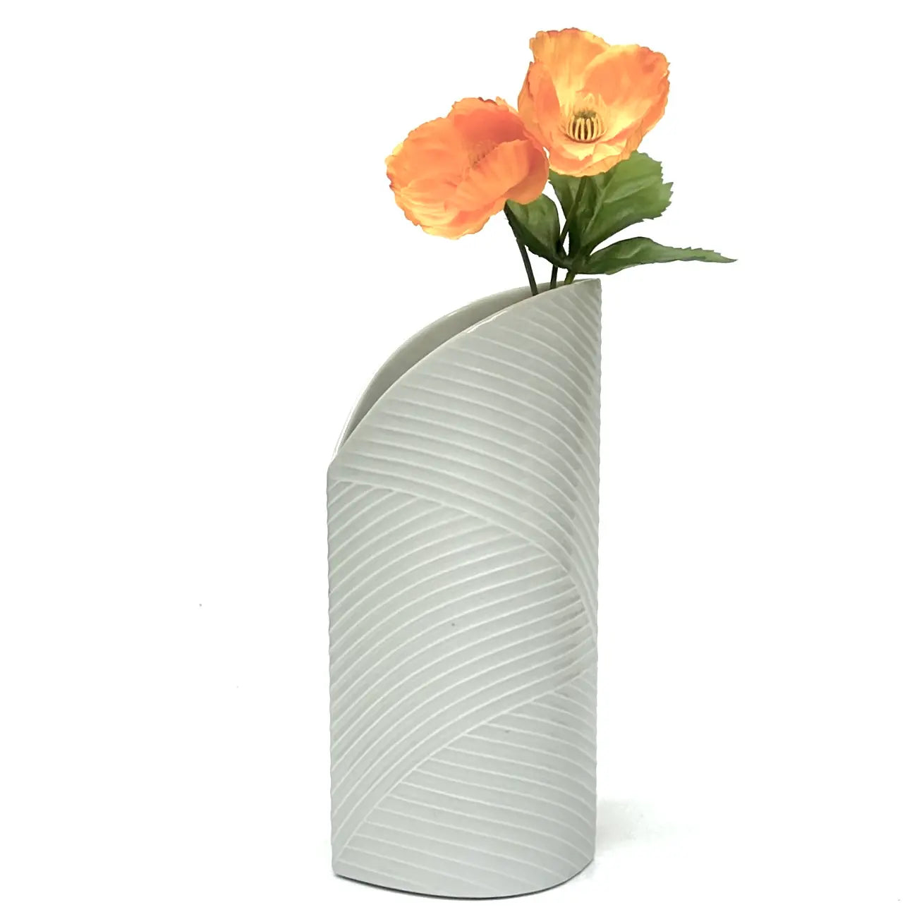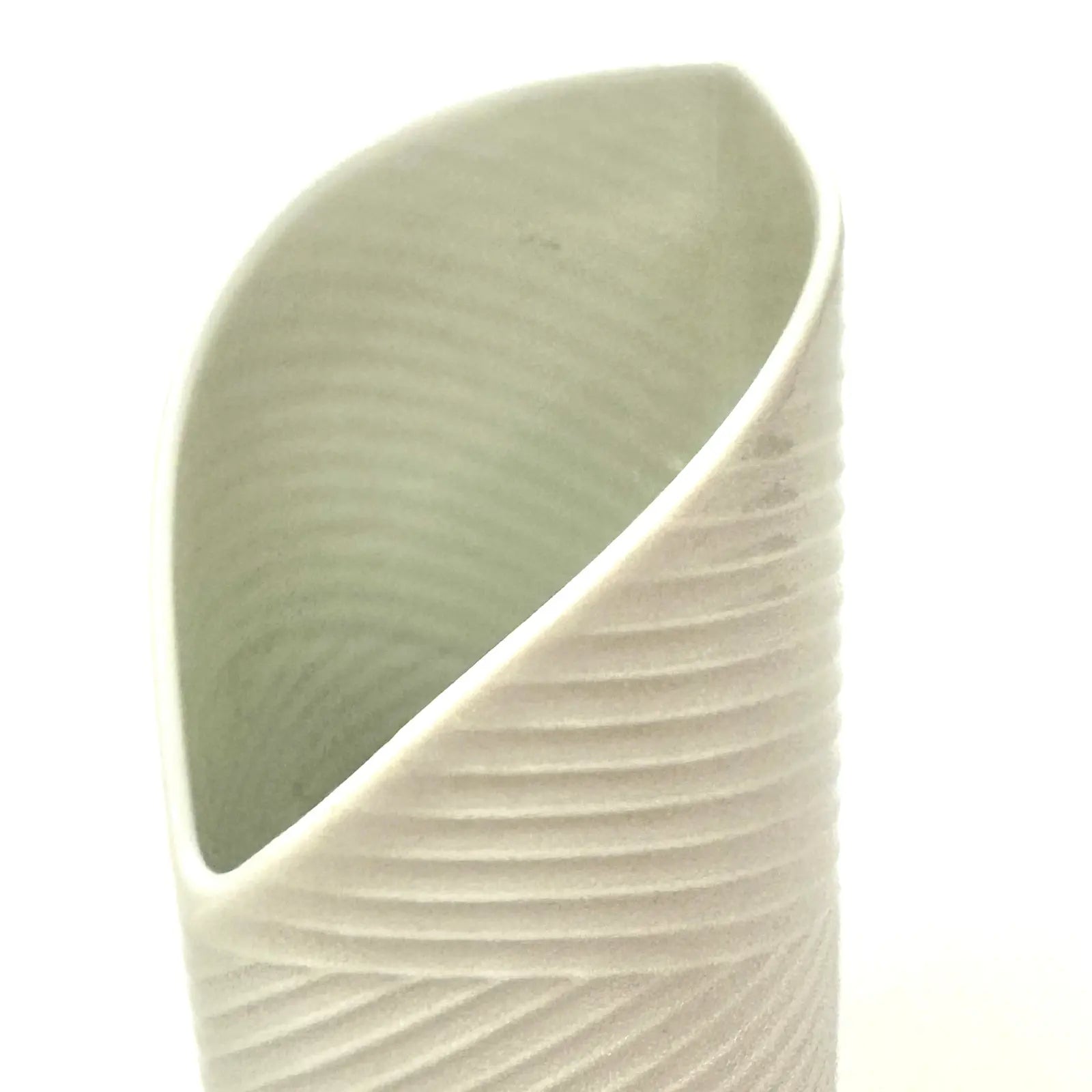 This is a chic 1970s white porcelain asymmetrical vase by Thomas Germany. This beautiful, rare, minimal vase features a glossy finish and a textured ribbed design. In excellent vintage condition, a minor crack on the rim could be a manufacturing defect.