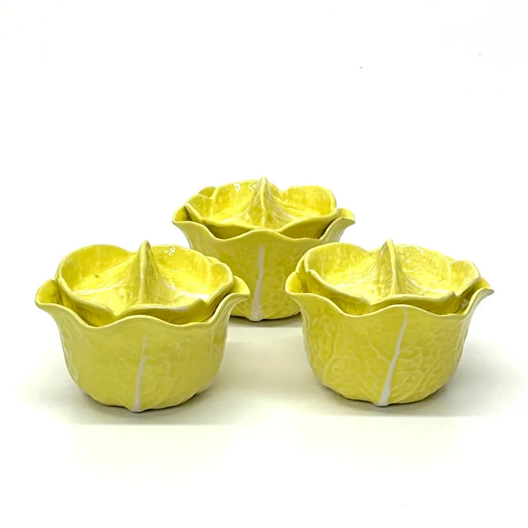 A charming and quirky set of yellow mid-century ceramic cabbage-themed lidded ramekins by Secla, made in Portugal.
