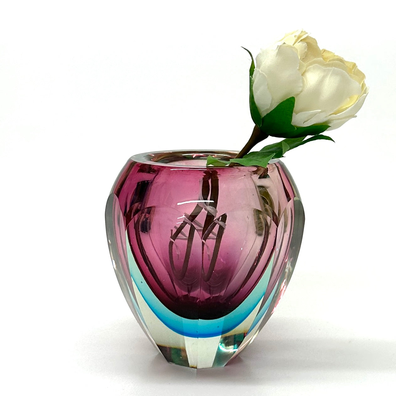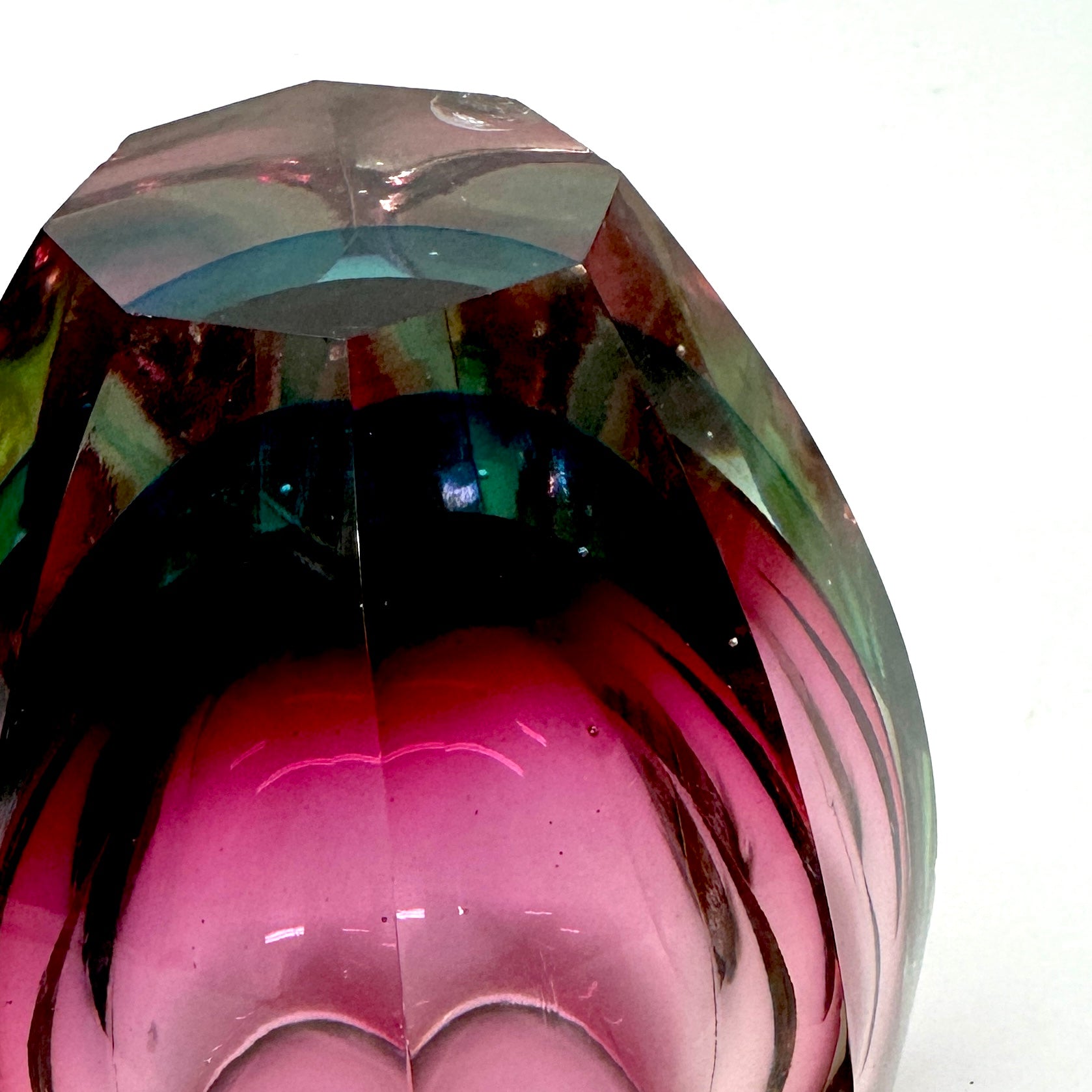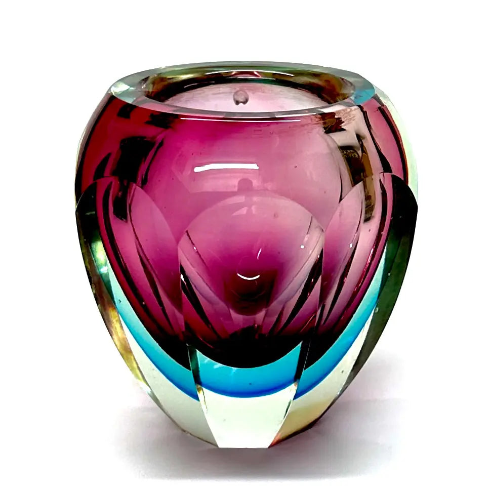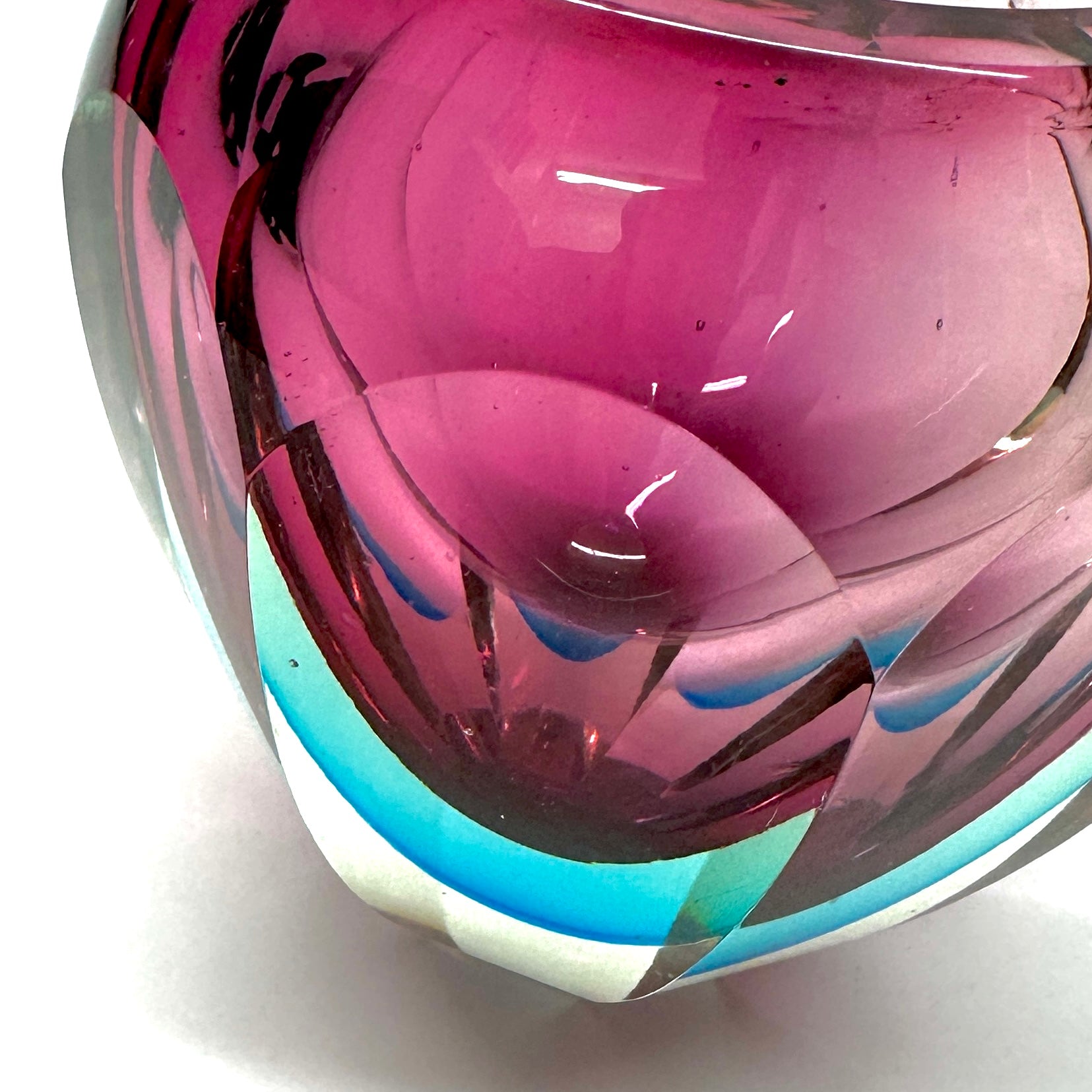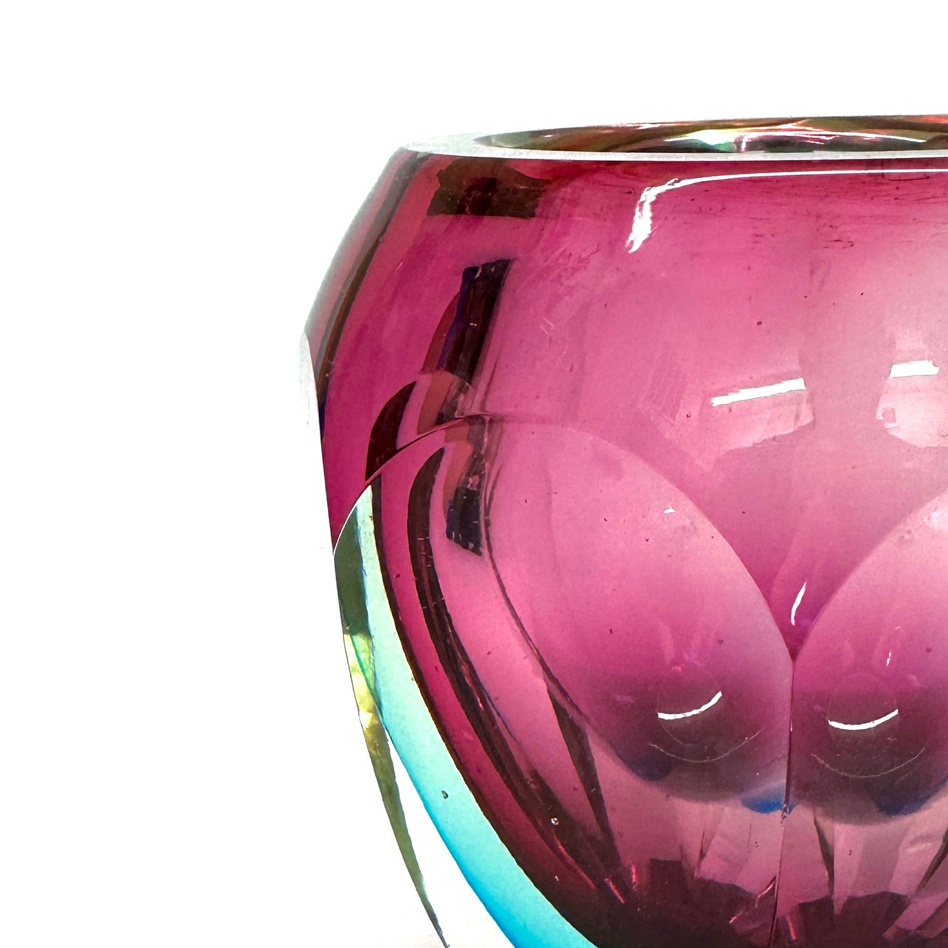 This stunning Murano Sommerso faceted glass vase features a heavy, decorative design in clear amethyst purple and aqua blue hues, attributed to Flavio Poli for Seguso.