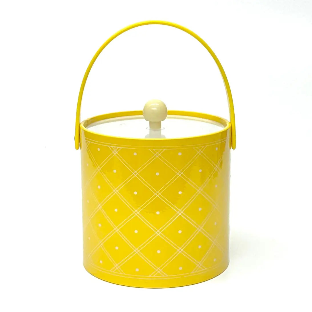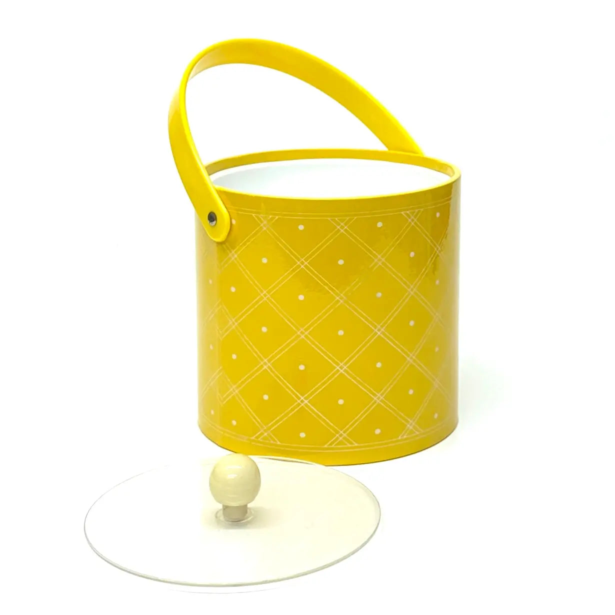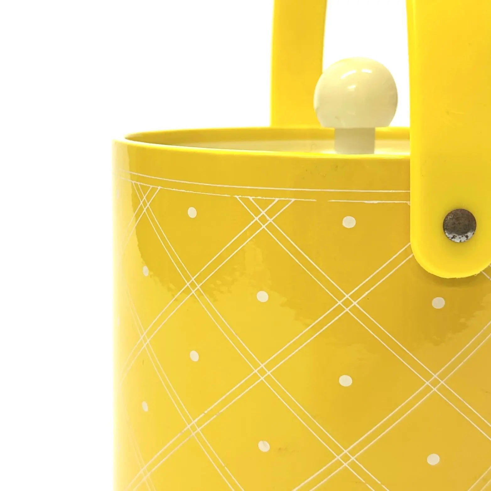 This is an eccentric vinyl and lucite bright yellow and white lidded ice bucket in a cylindrical shape with a diamond pattern, circa 1970s.