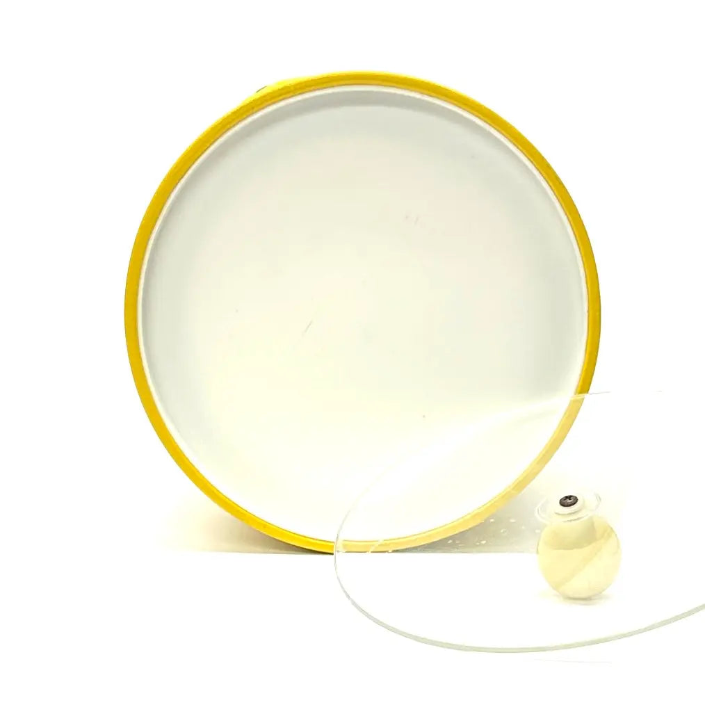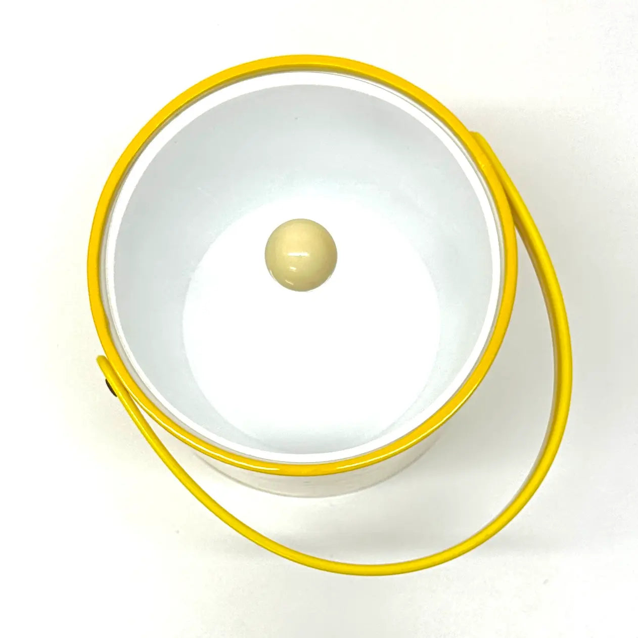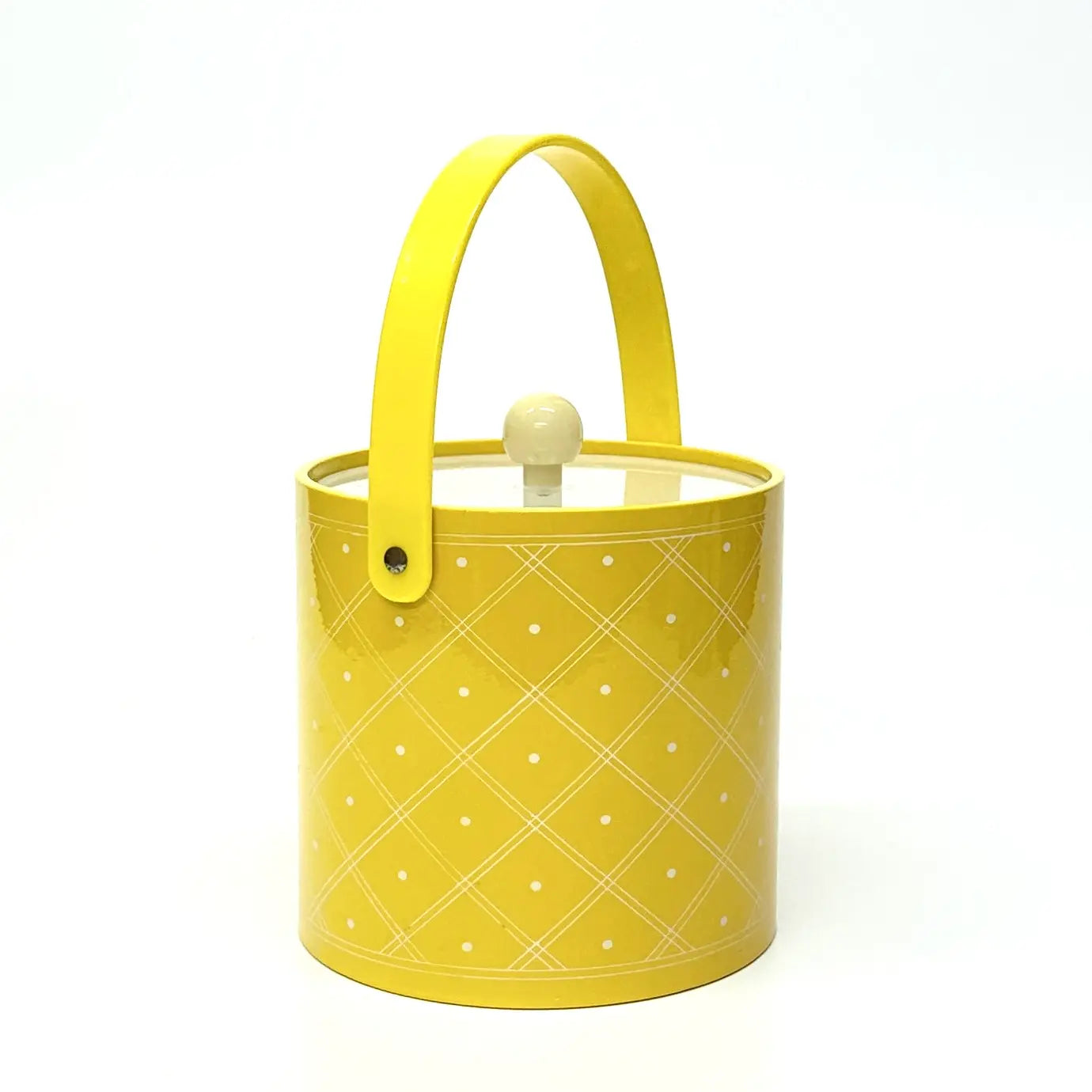 This is an eccentric vinyl and lucite bright yellow and white lidded ice bucket in a cylindrical shape with a diamond pattern, circa 1970s.