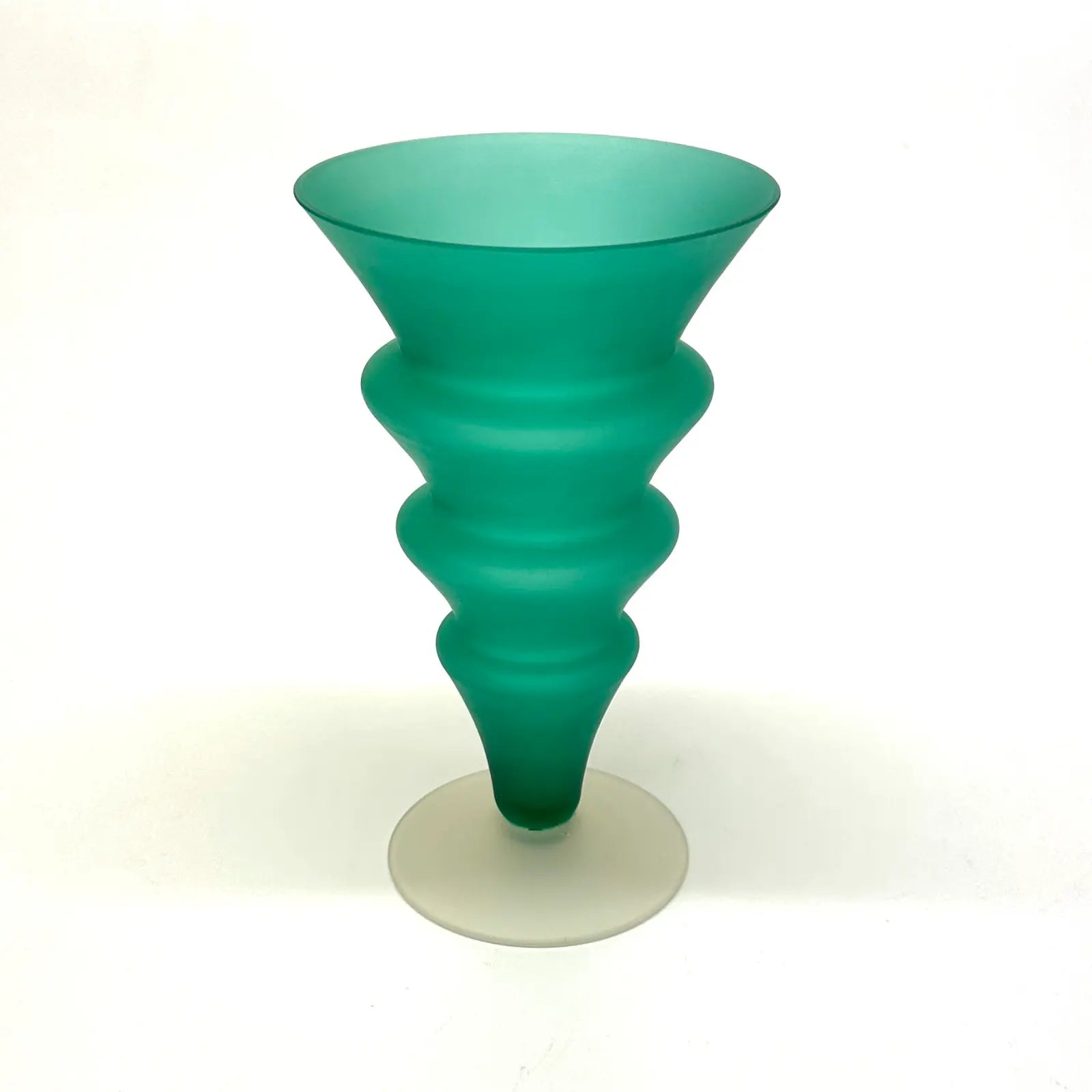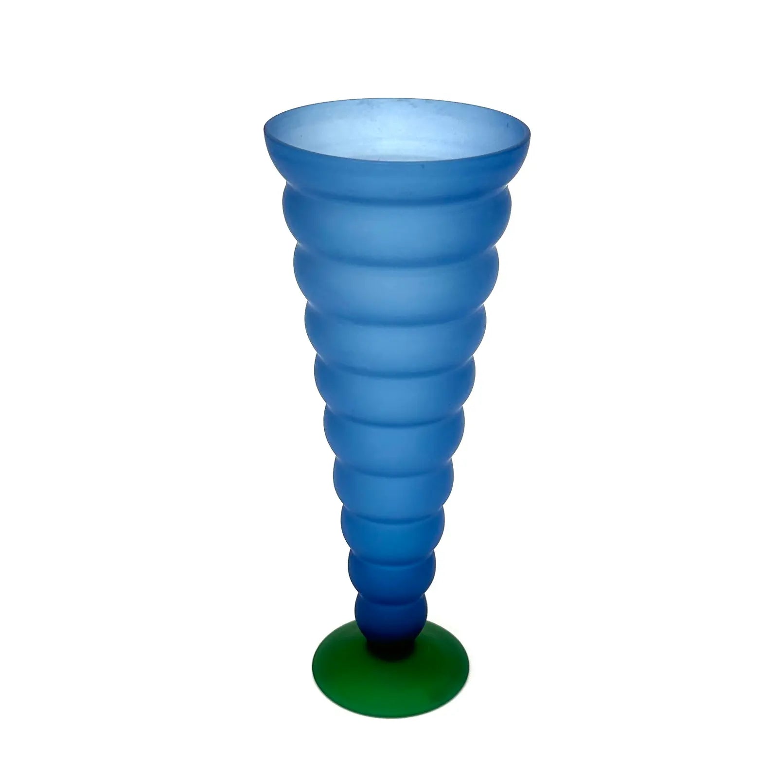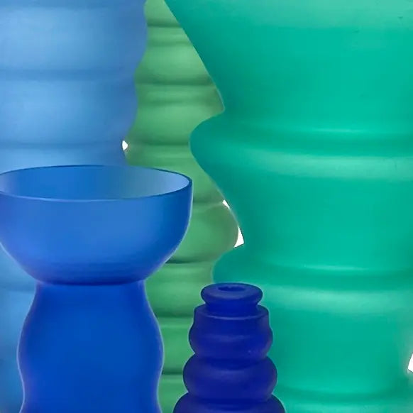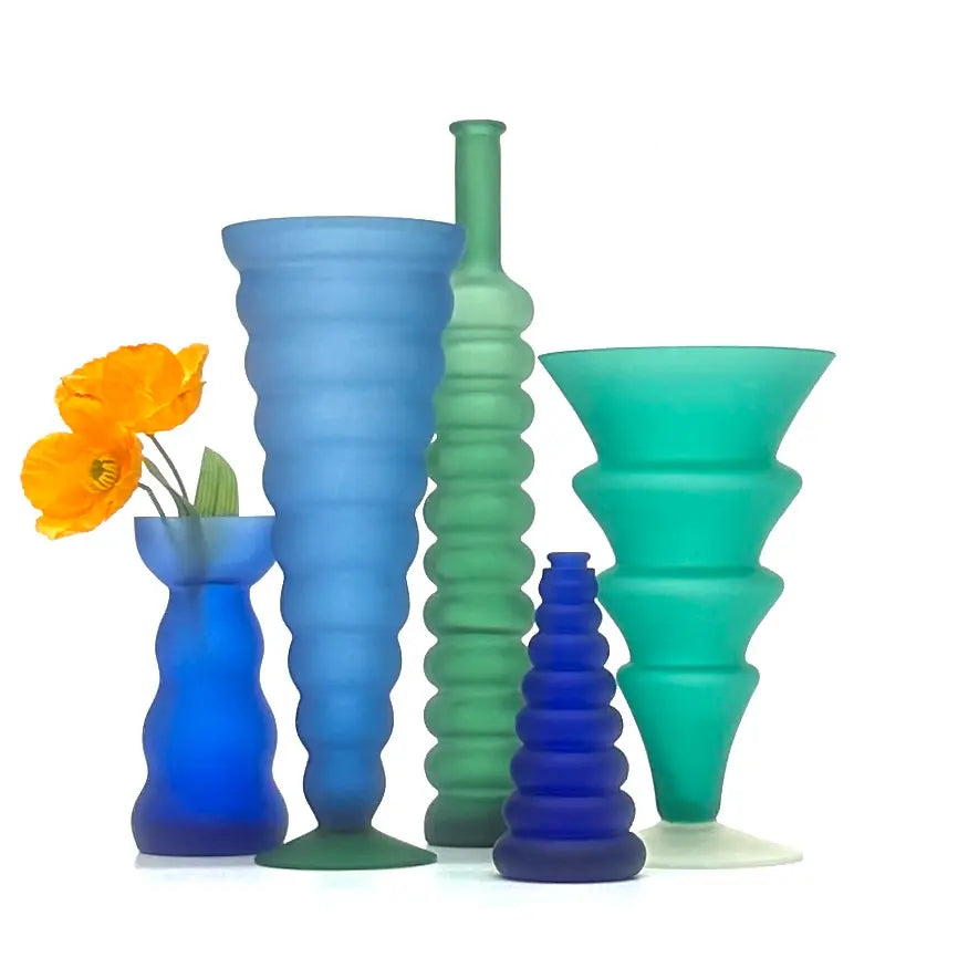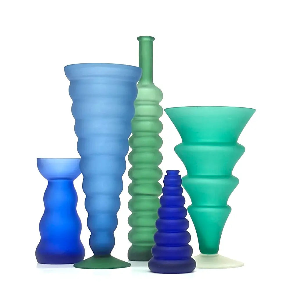 A striking group of Memphis-style curvy cobalt blue and forest green frosted glass vessels from the 1980s.