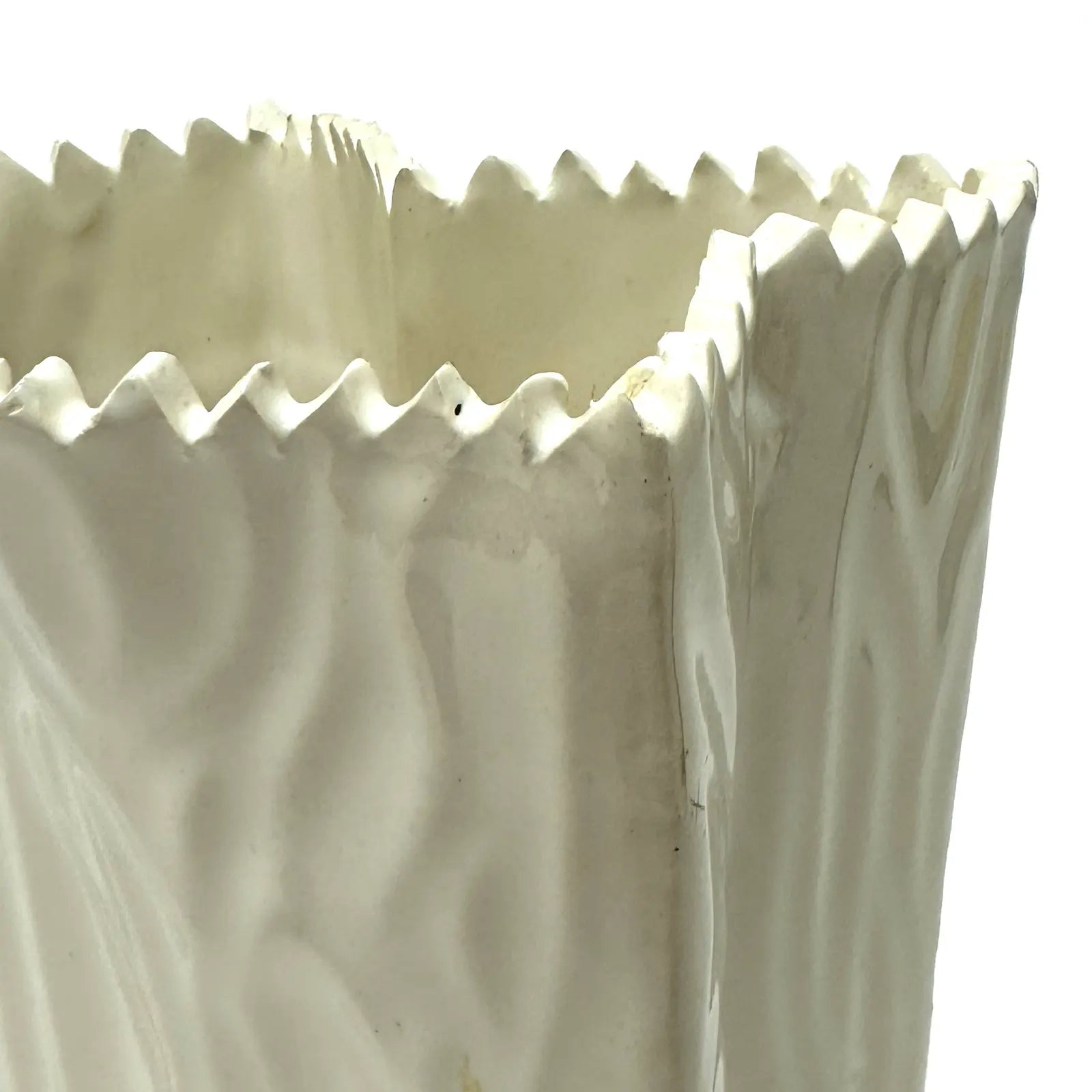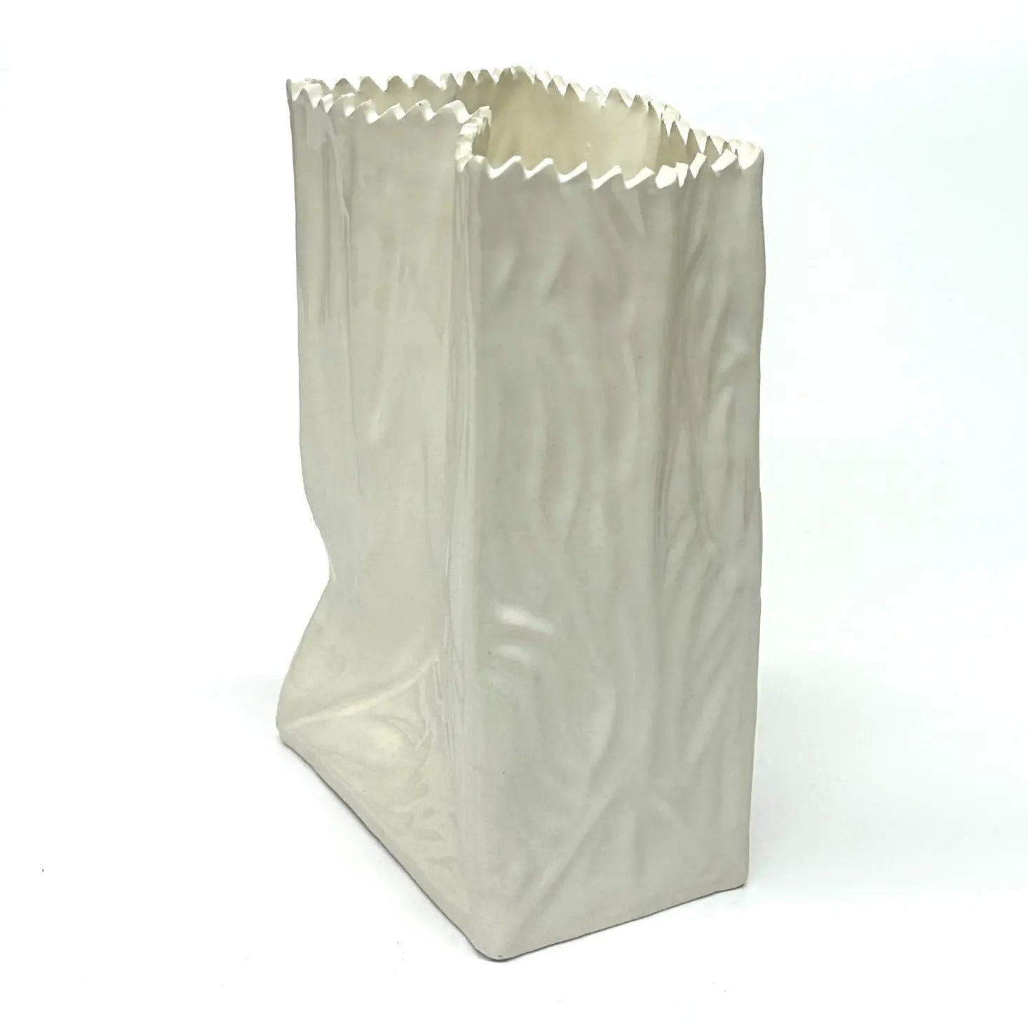 This is a chic 1970s white ceramic crinkled paper bag vase in the style of Tapio Wirkkala by Rosenthal. This beautiful, minimal vase features a glossy finish and a curved, rounded design. In excellent vintage condition.
