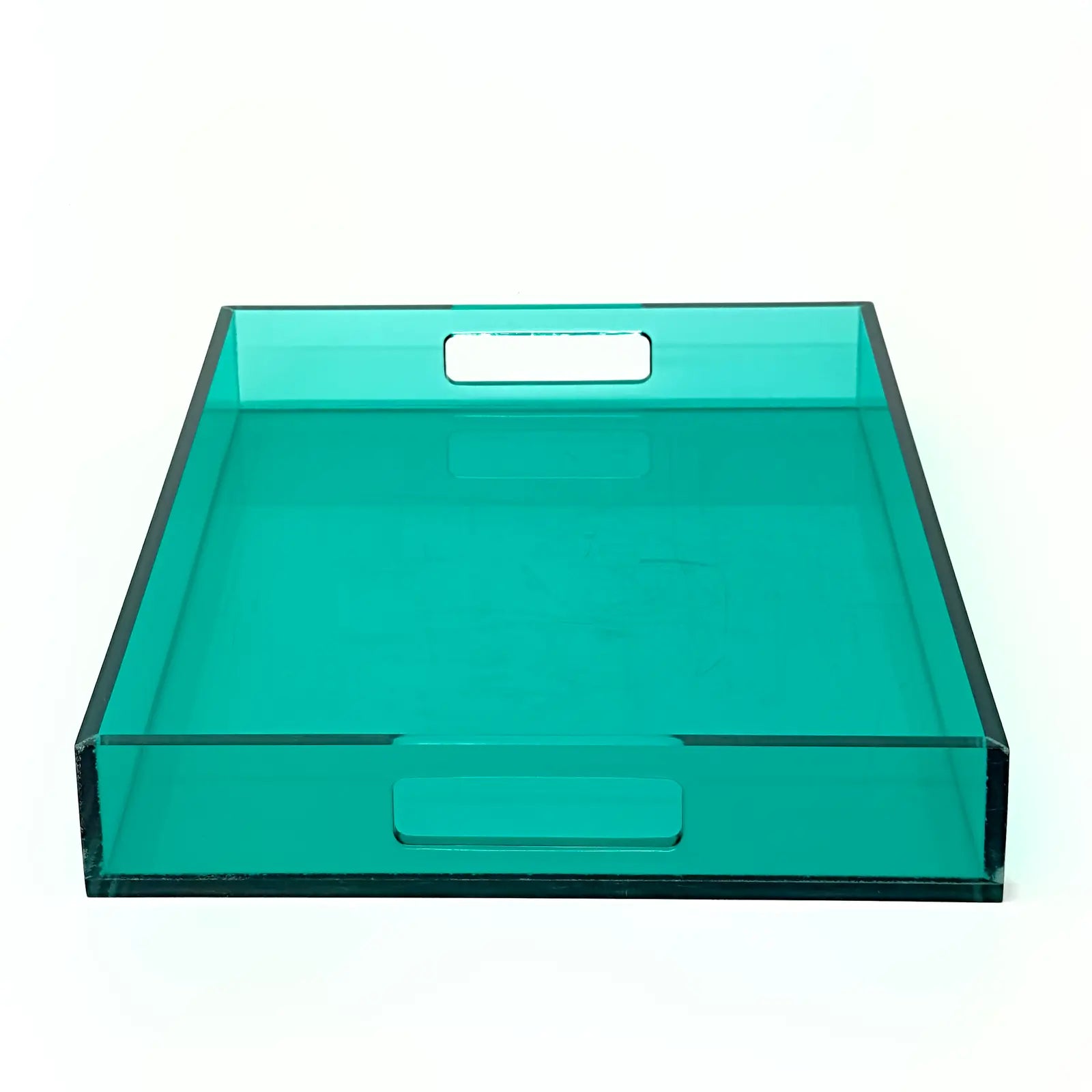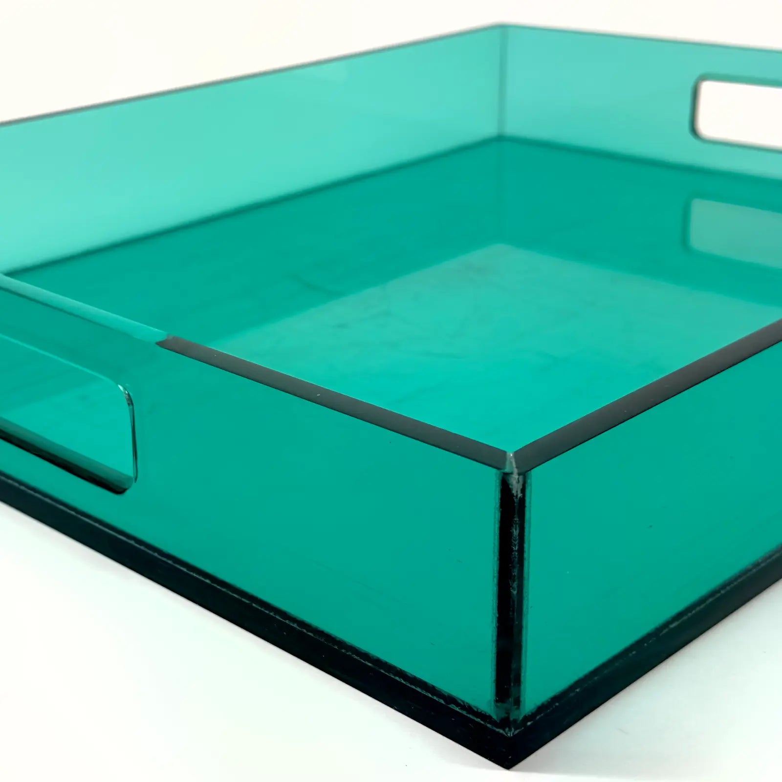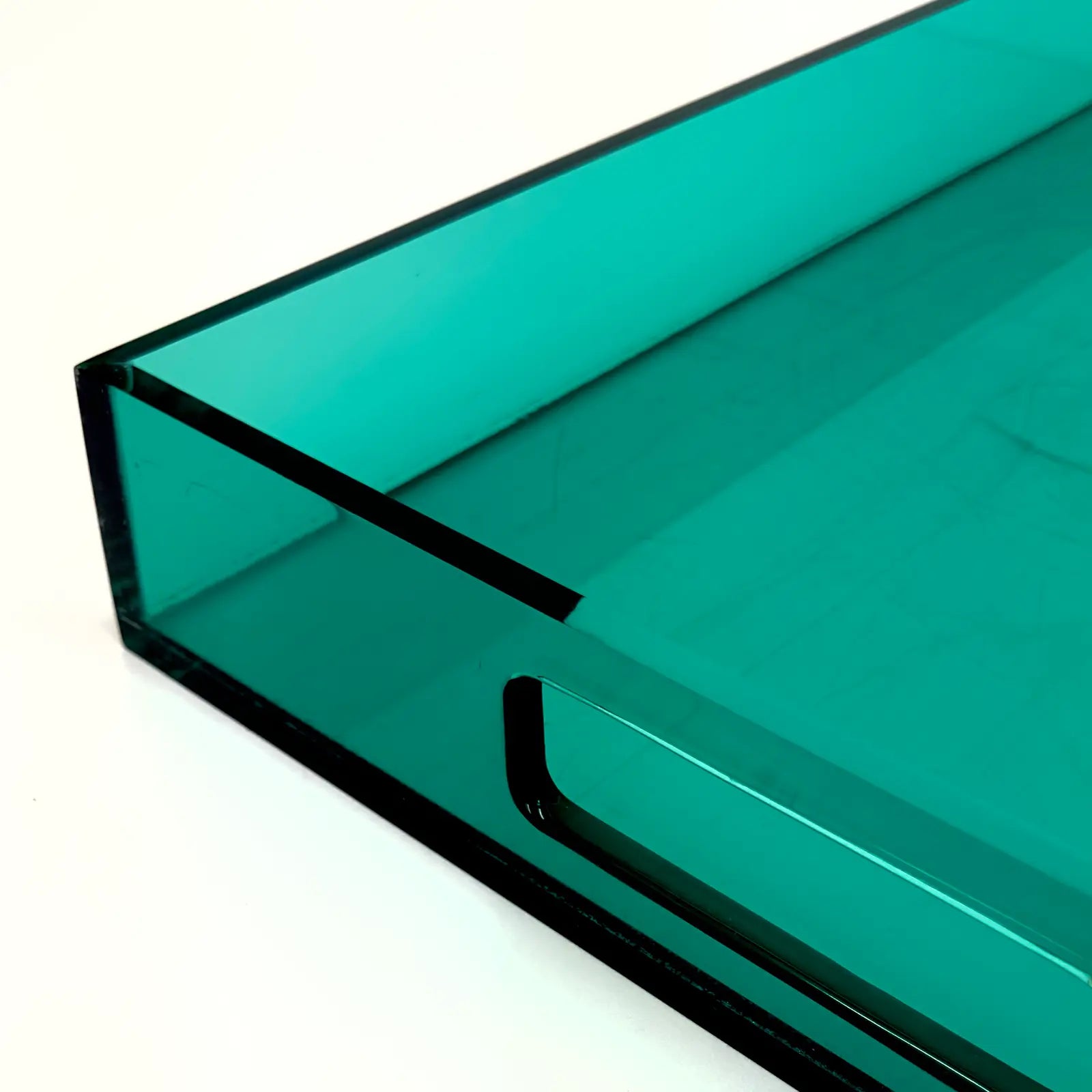 This is a stunning oversized mid-century jade-green transparent thick lucite rectangular tray with handles. A rare statement piece.