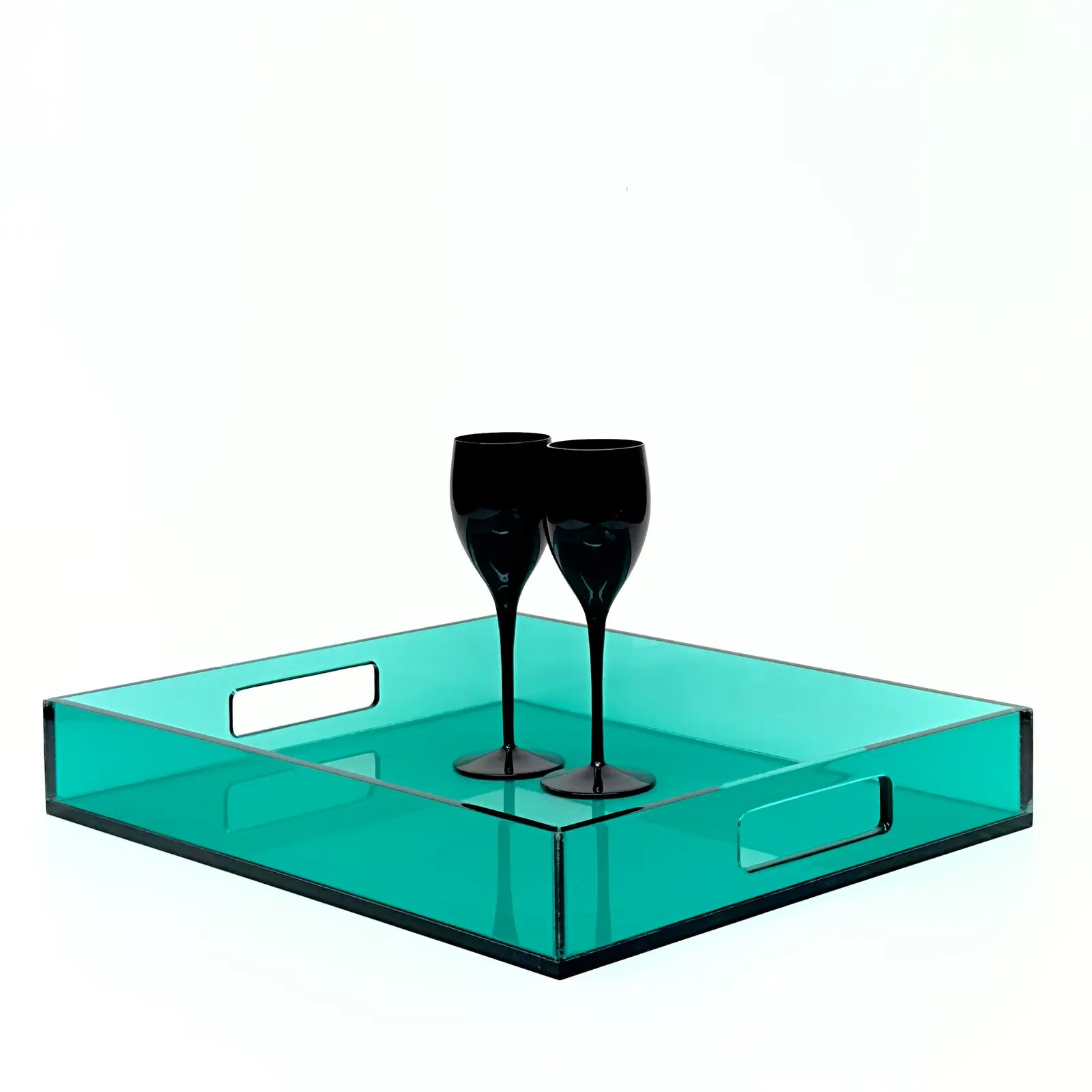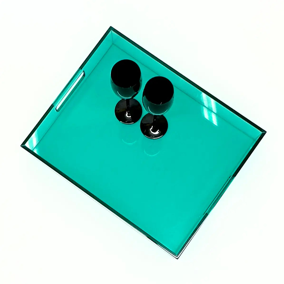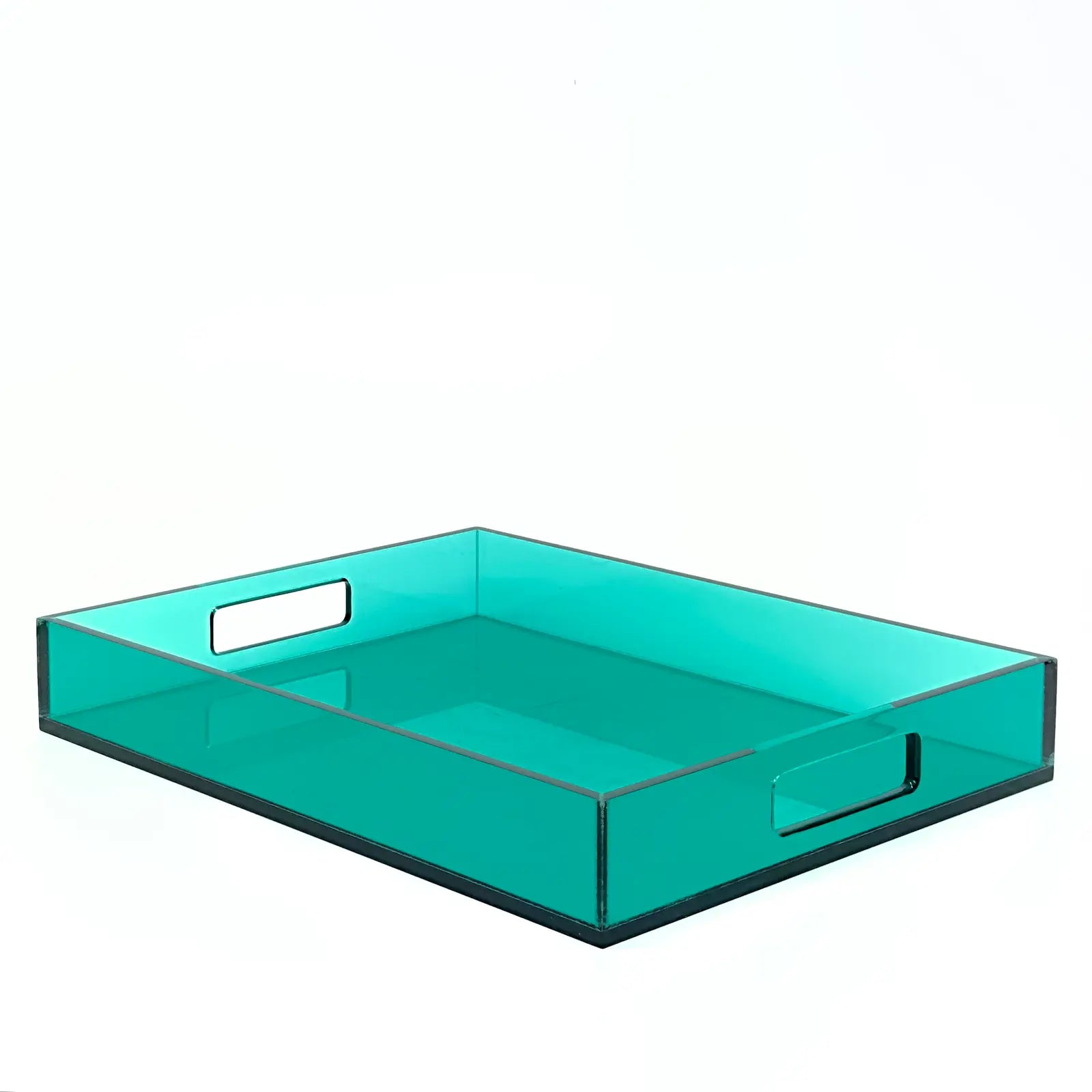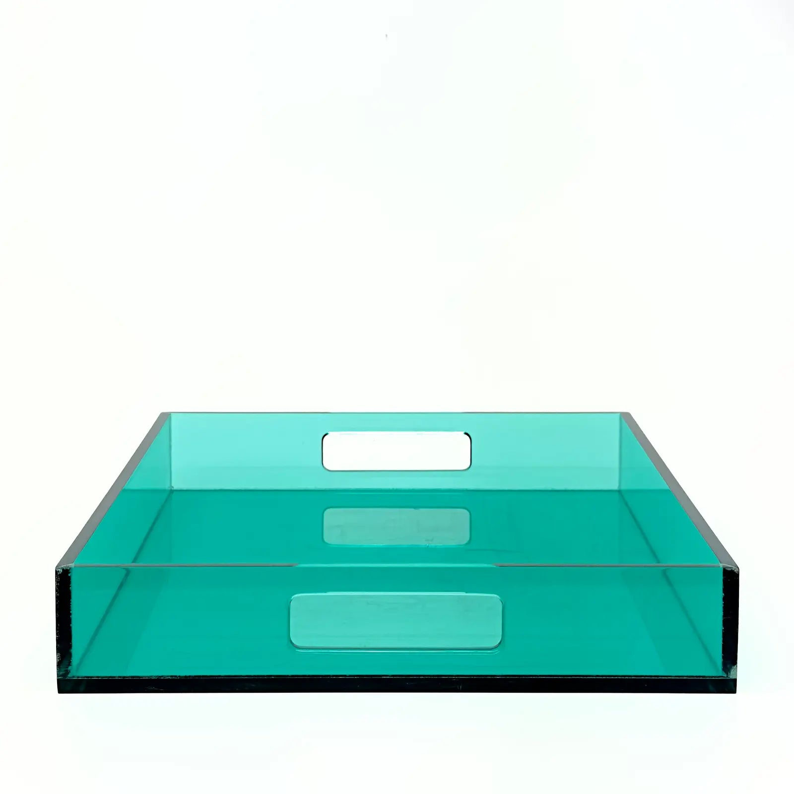 This is a stunning oversized mid-century jade-green transparent thick lucite rectangular tray with handles. A rare statement piece.
