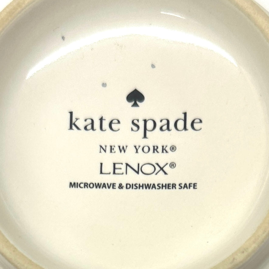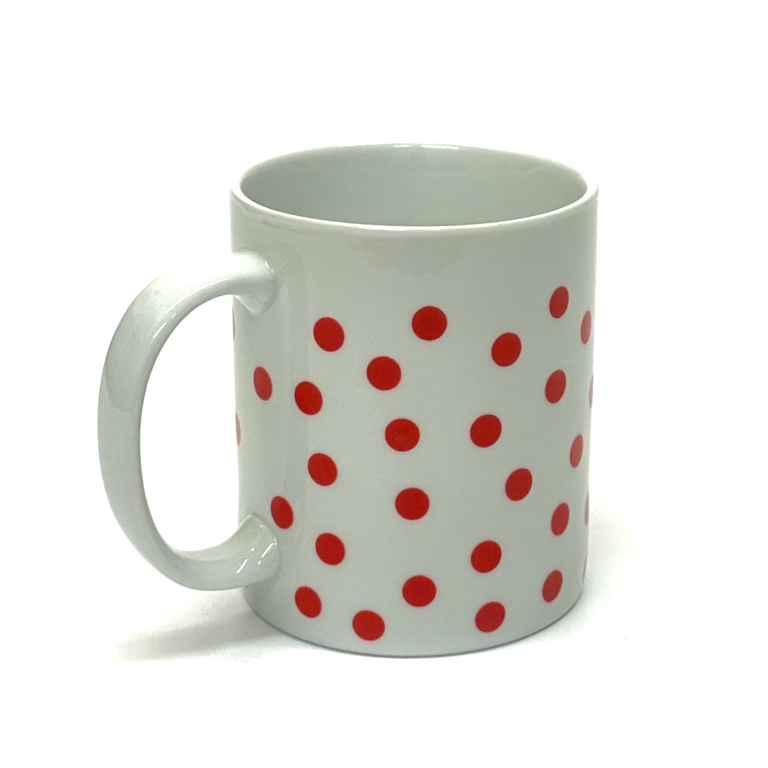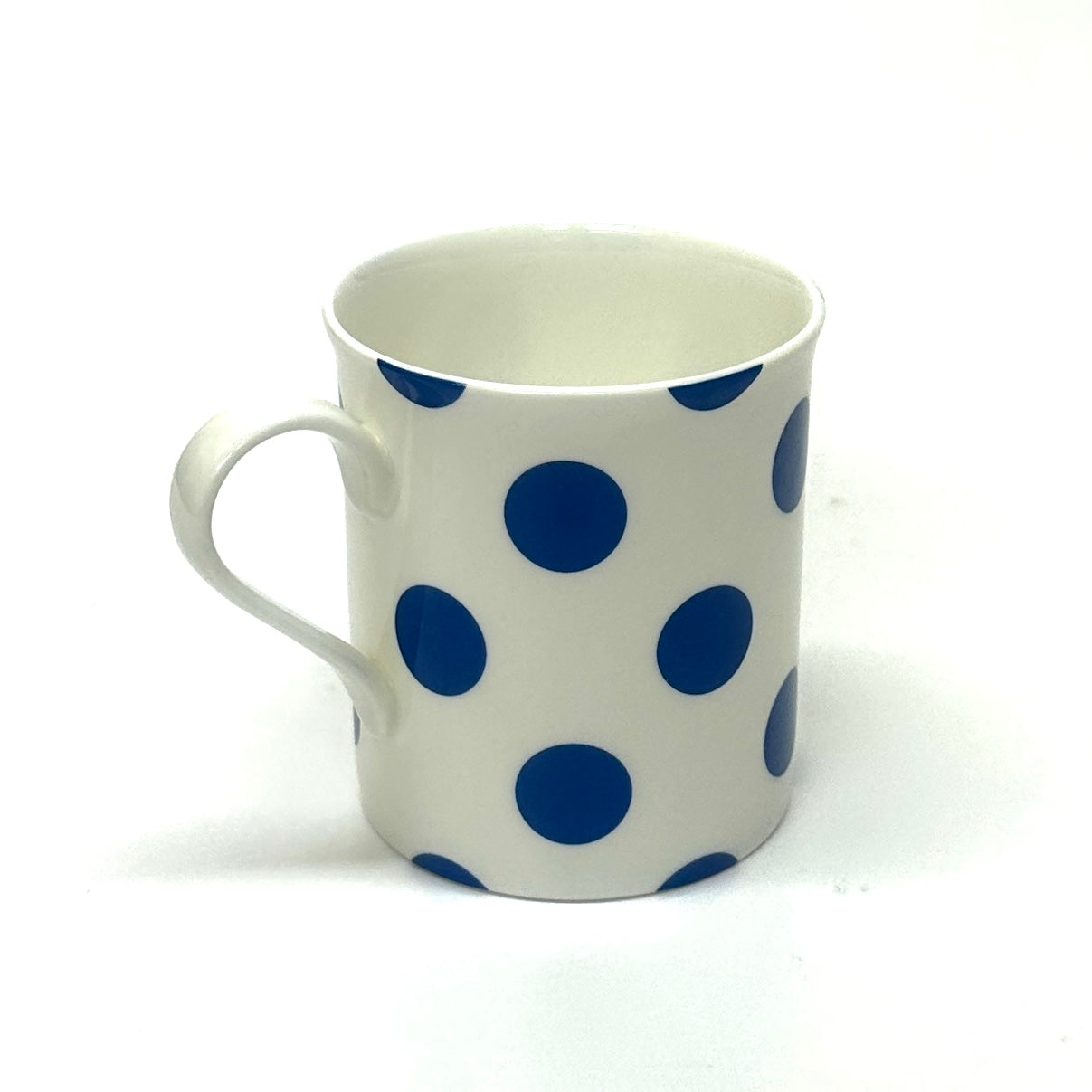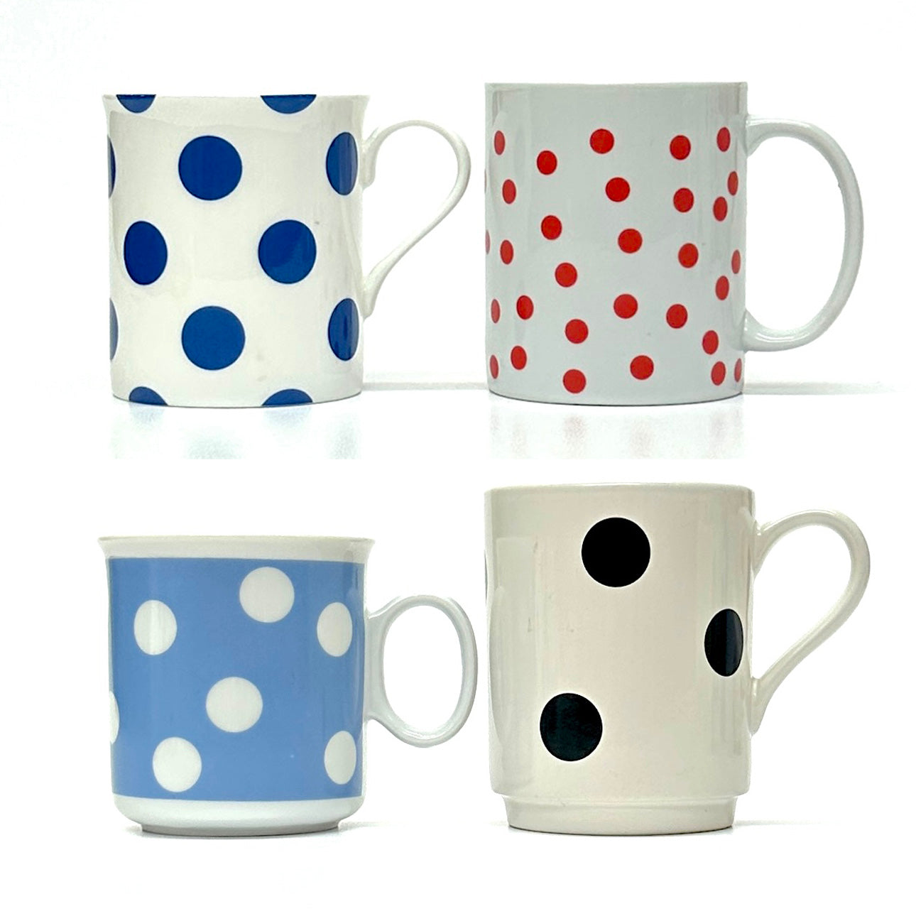 A charming set of vintage ceramic mugs with assorted multicolored polka dots. The set includes a piece by Kate Spade, adding a touch of designer flair. Each mug features a crisp white base with playful black, navy, red, and light blue dot details. A fun, stylish, and chic addition to any mug collection.