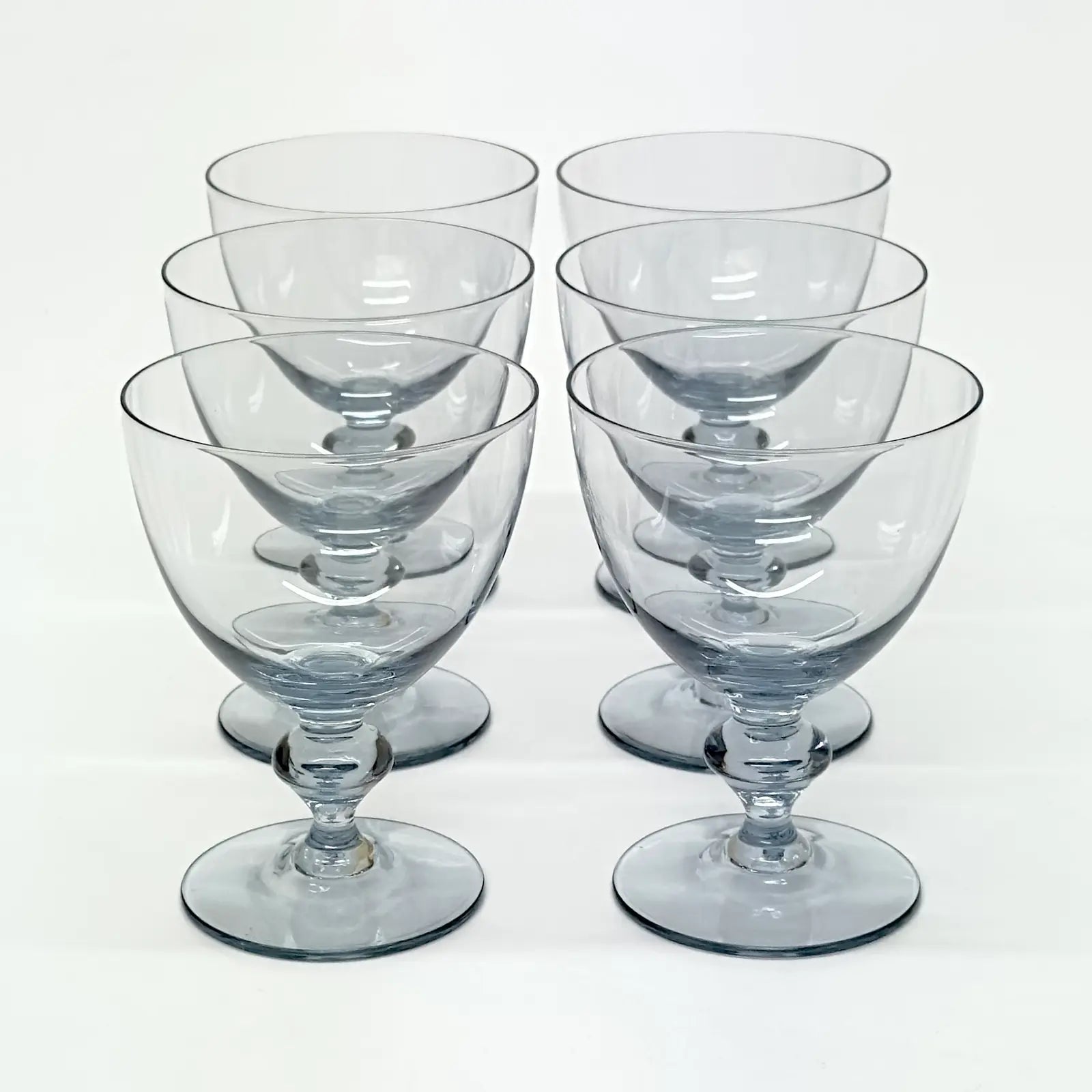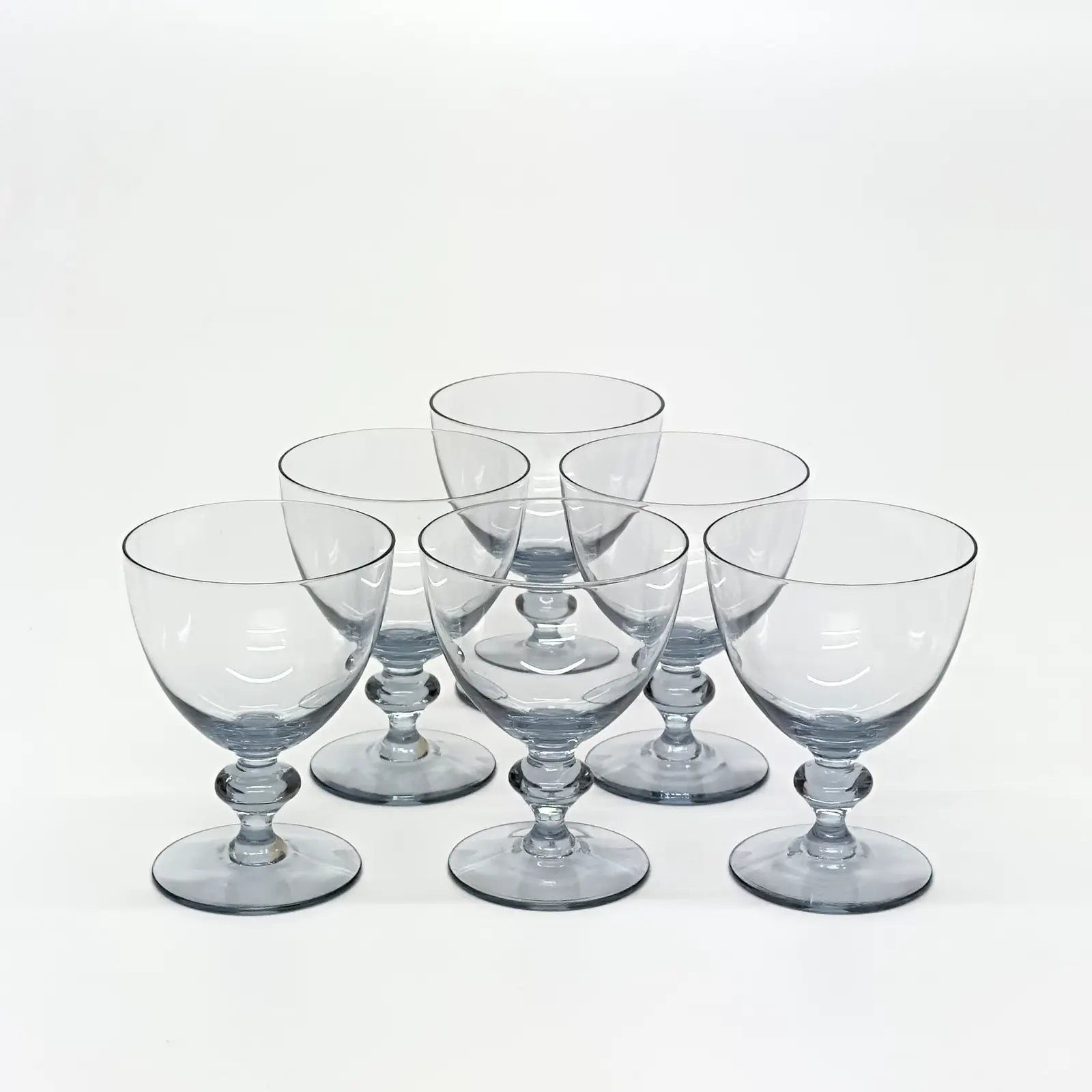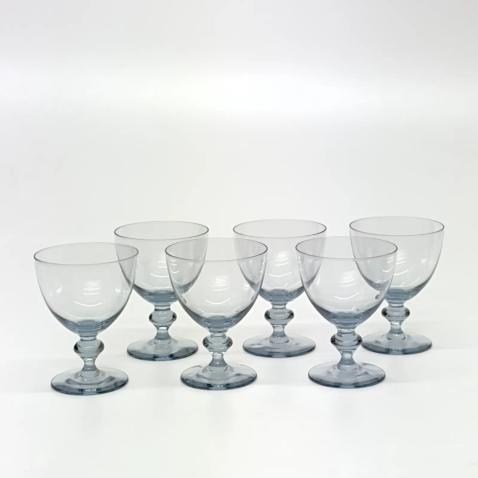 A delicate set of light dove-grey goblet wine glasses with a diamond stem detail.