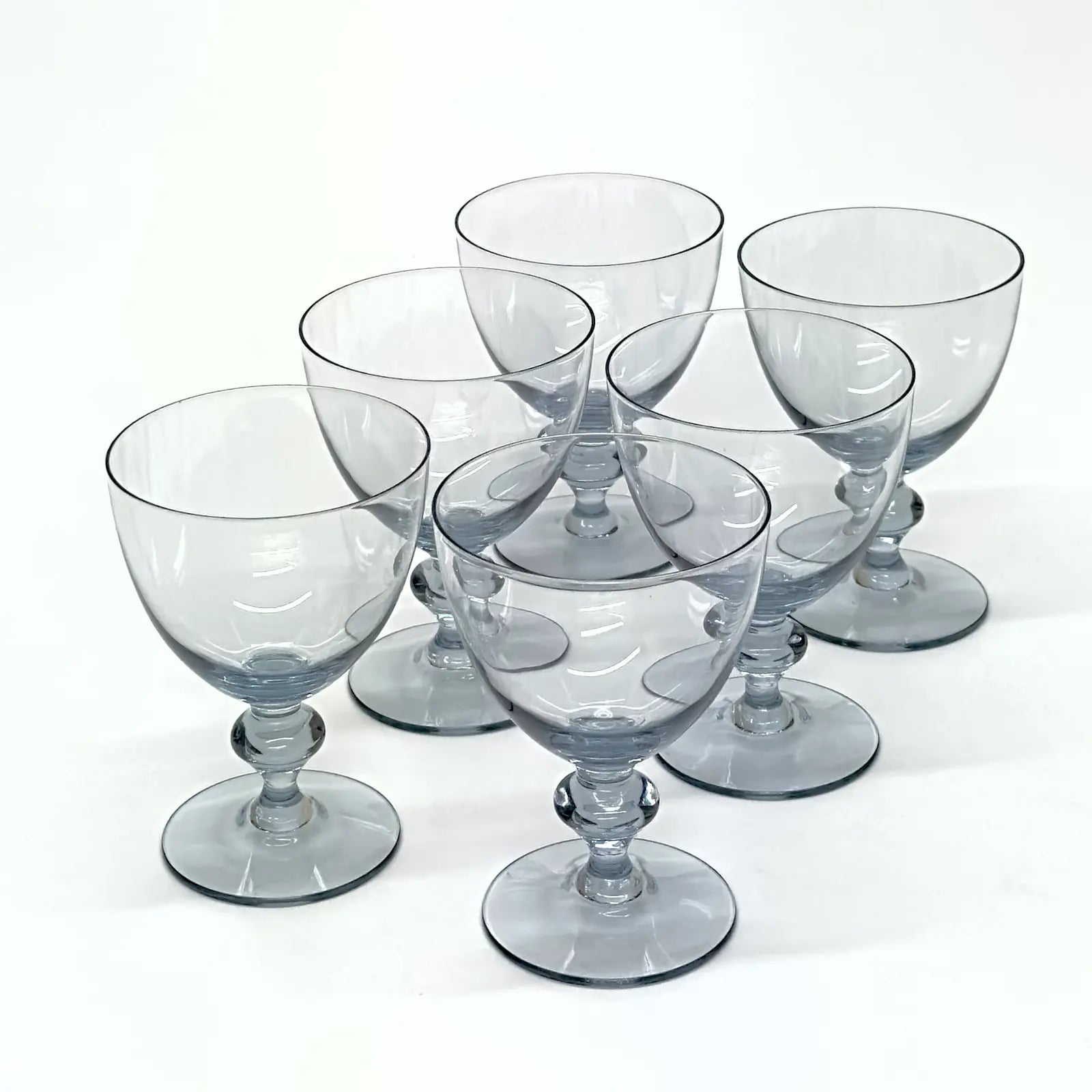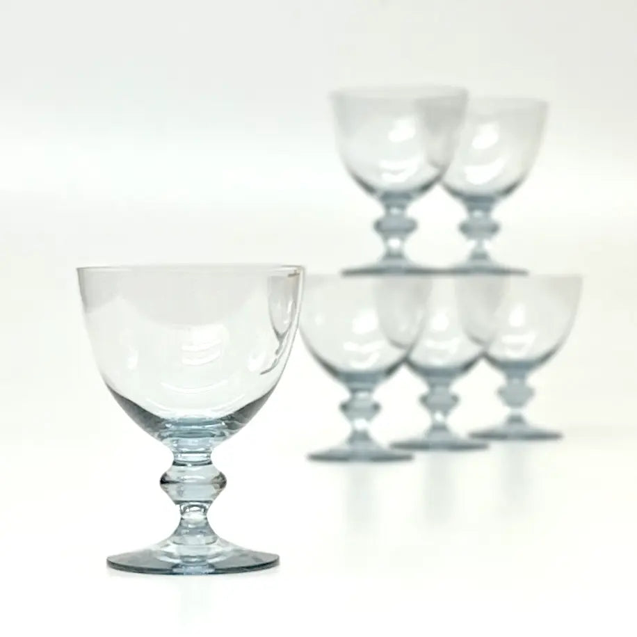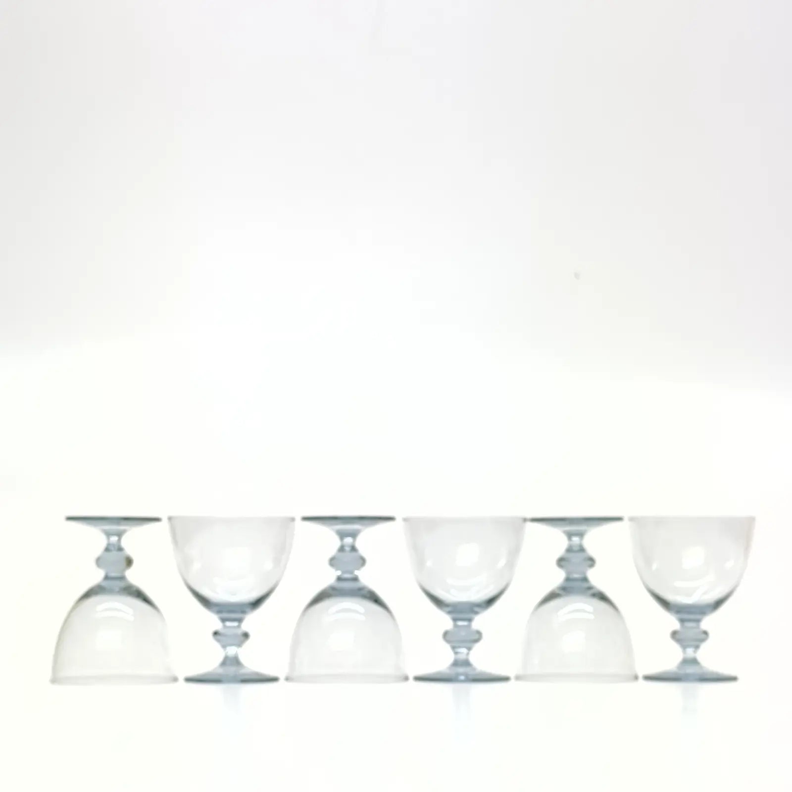 A delicate set of light dove-grey goblet wine glasses with a diamond stem detail.