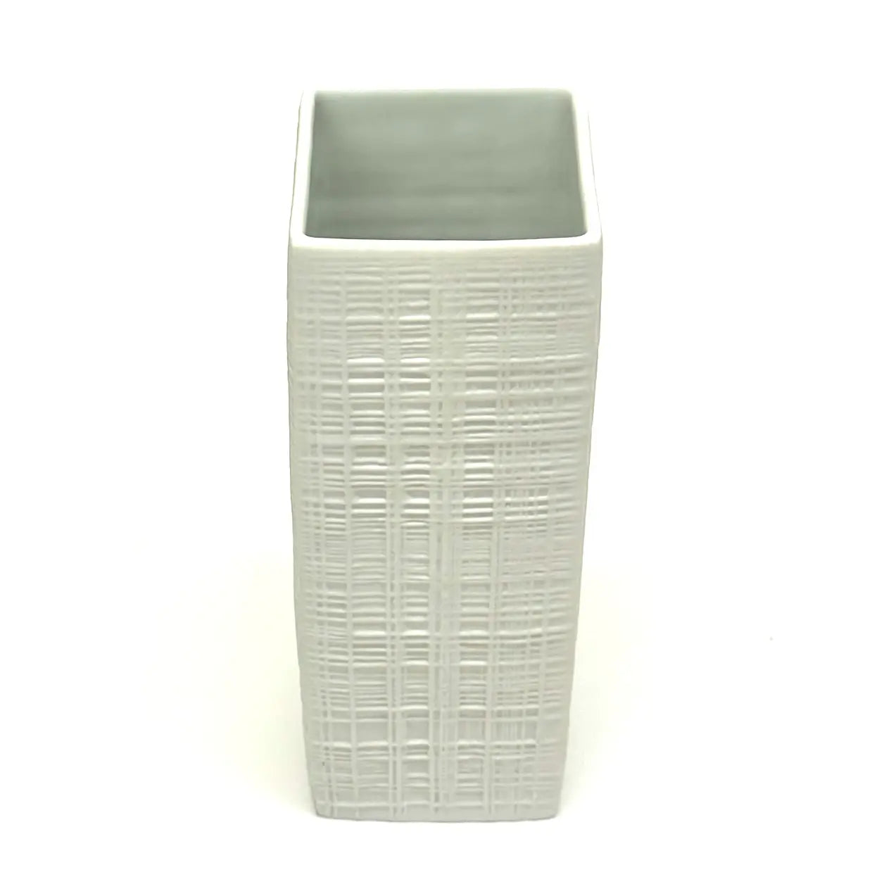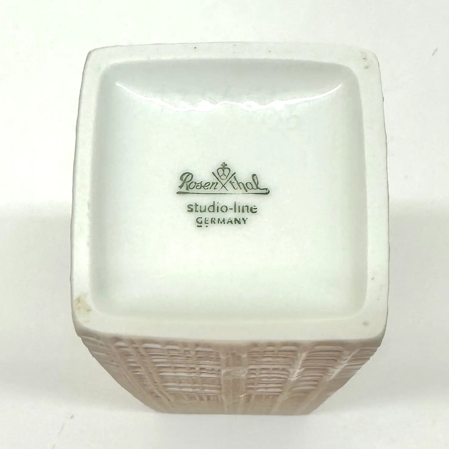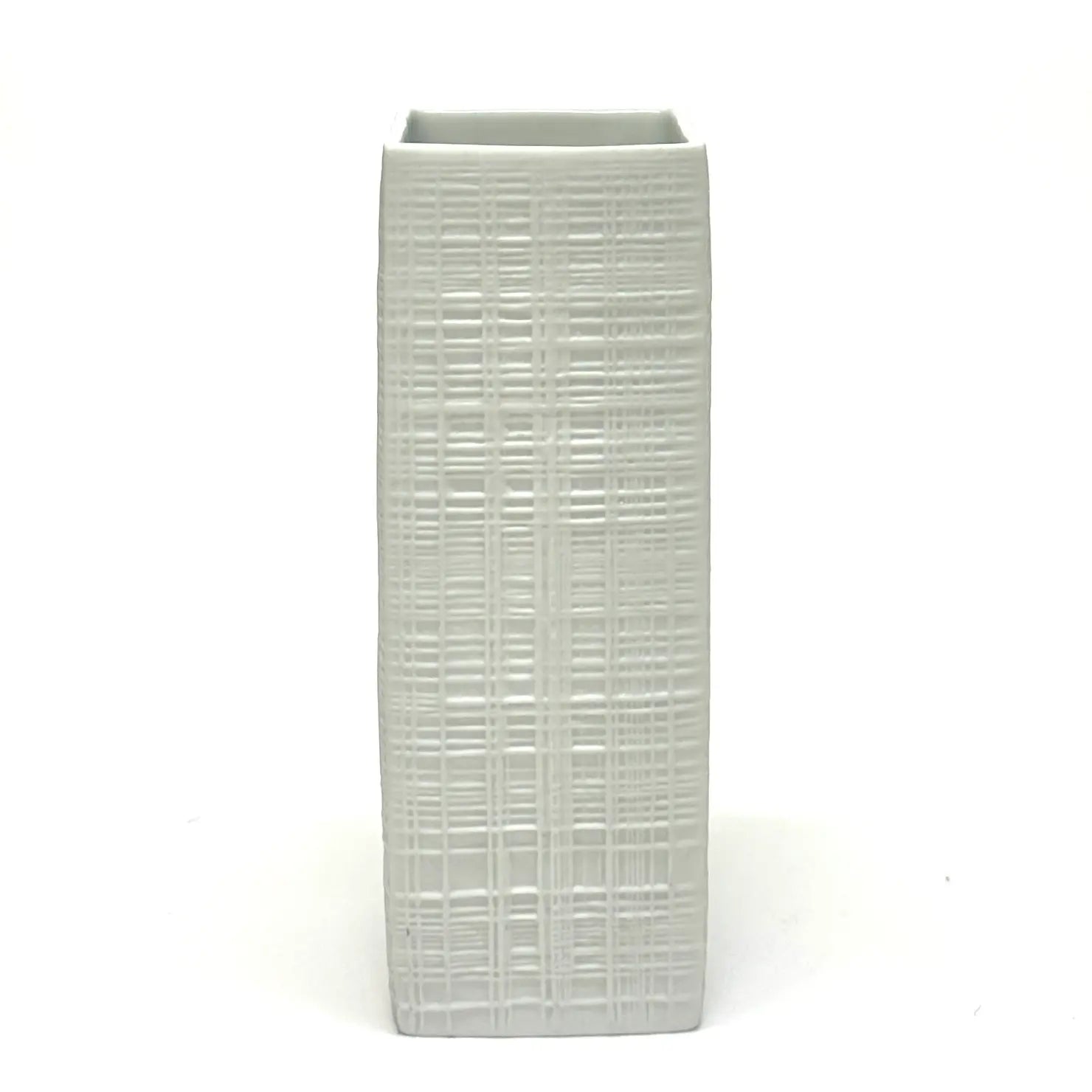 A gorgeous and rare white bisquit porcelain vase by Rosenthal Studio Line, circa 1990s. This vase is a rectangular, four-sided porcelain piece with a refined modernist design, featuring a crisp matte white finish and an embossed linear crosshatch texture that adds subtle depth and geometric interest to its minimalist silhouette.