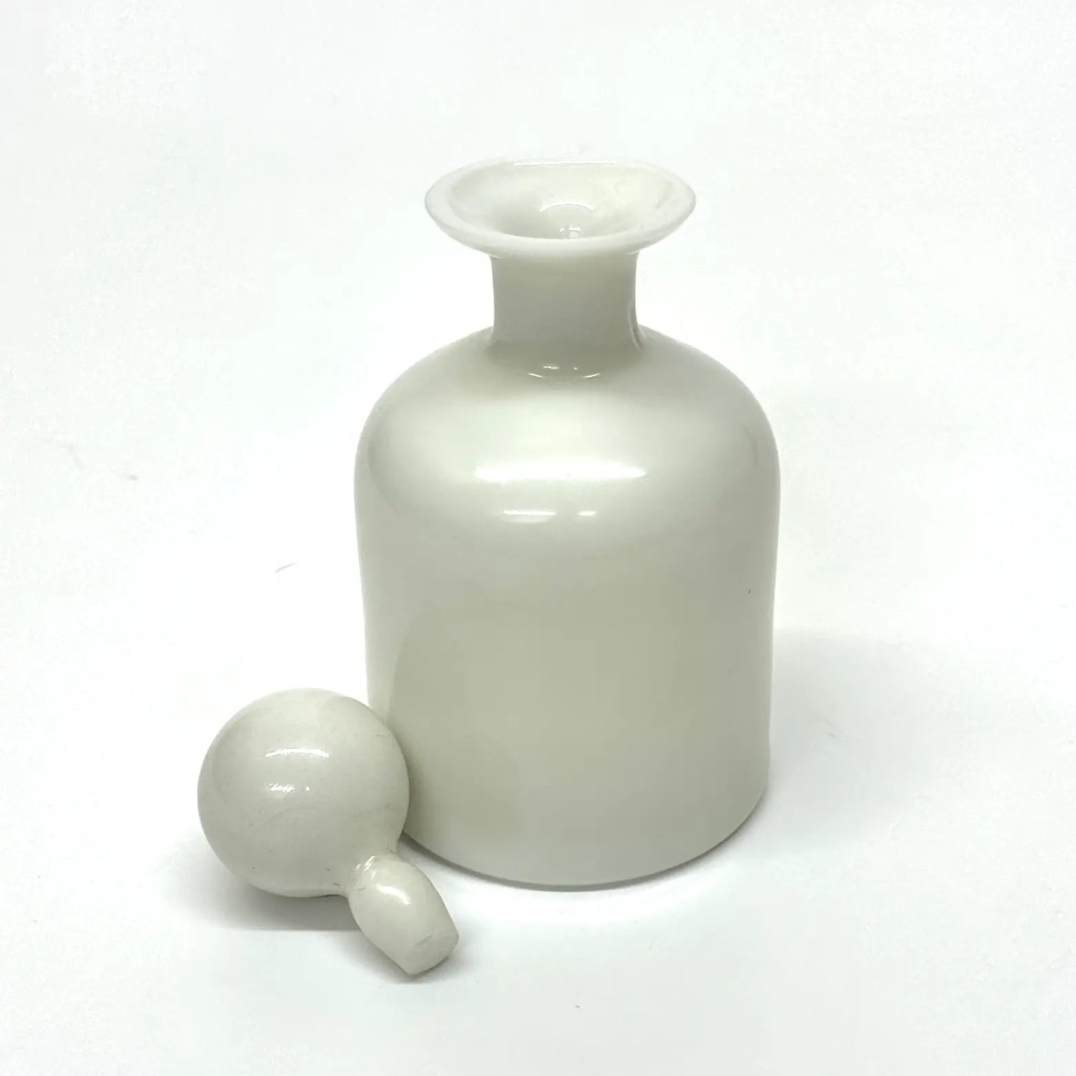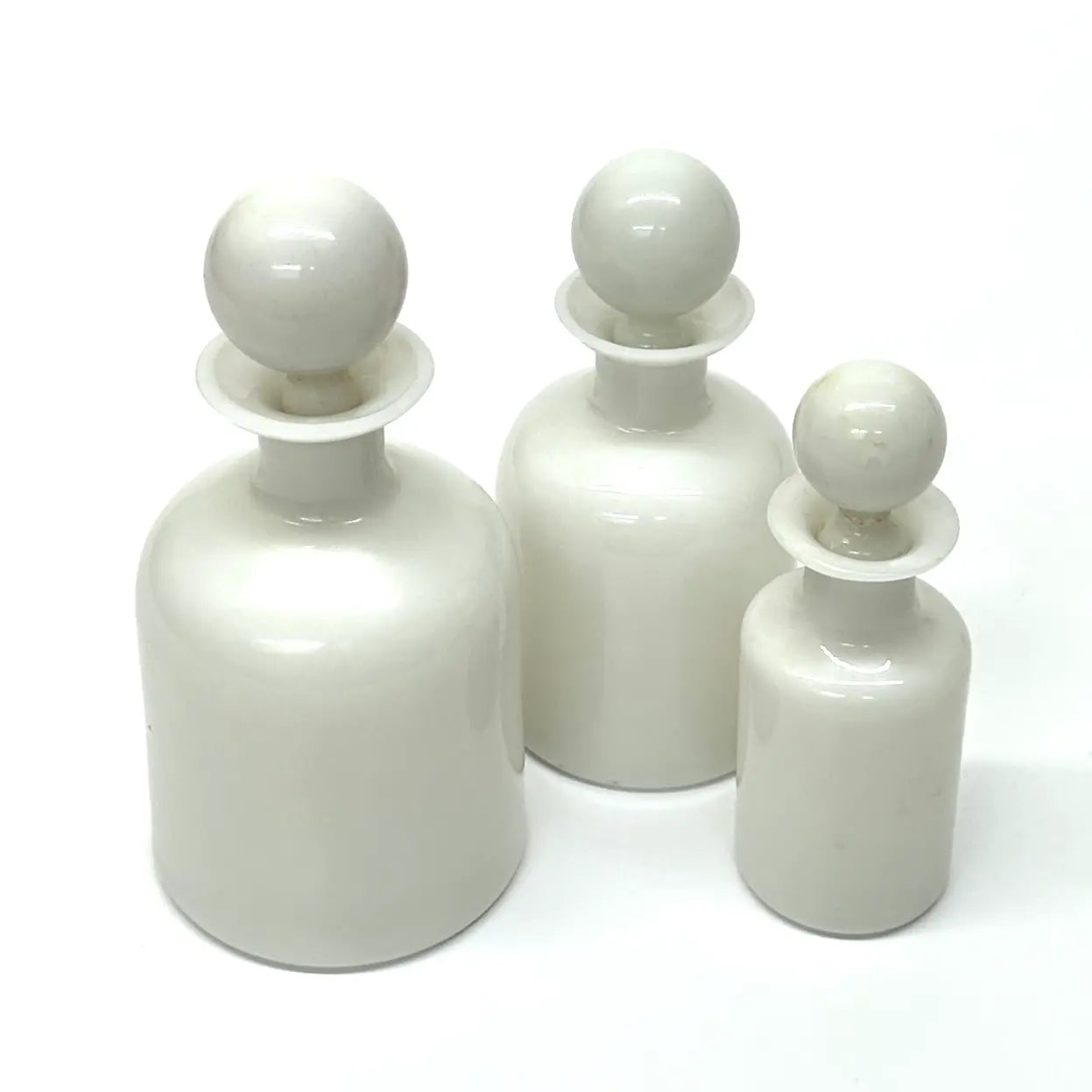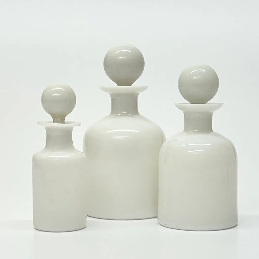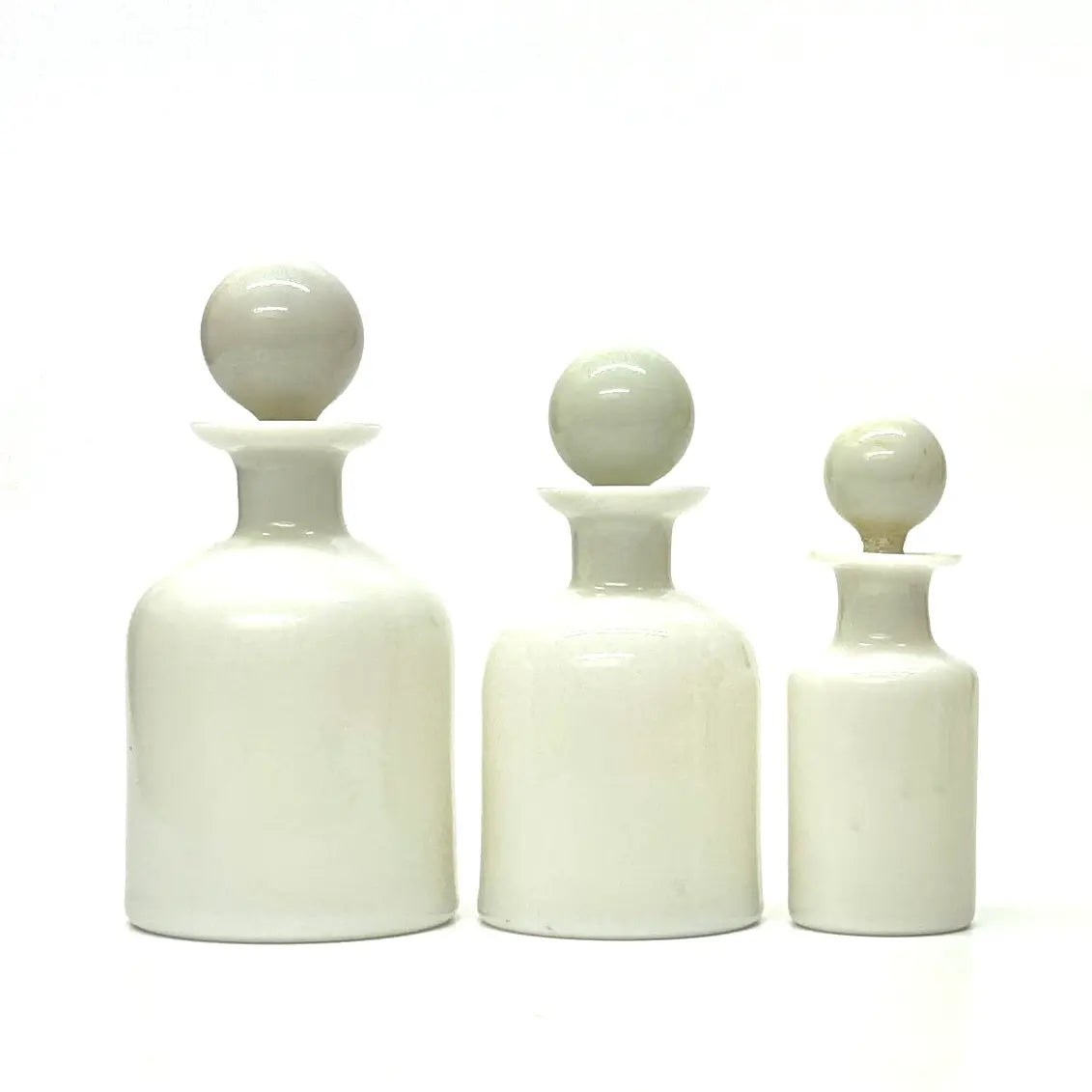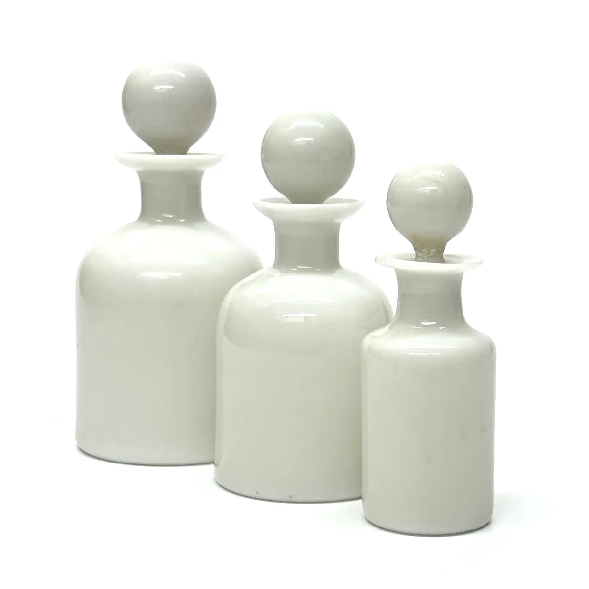 A gorgeous and delicate group of antique French Portieux Vallerysthal hand-blown, white, milk glass perfume bottles with stoppers in a variety of sizes.