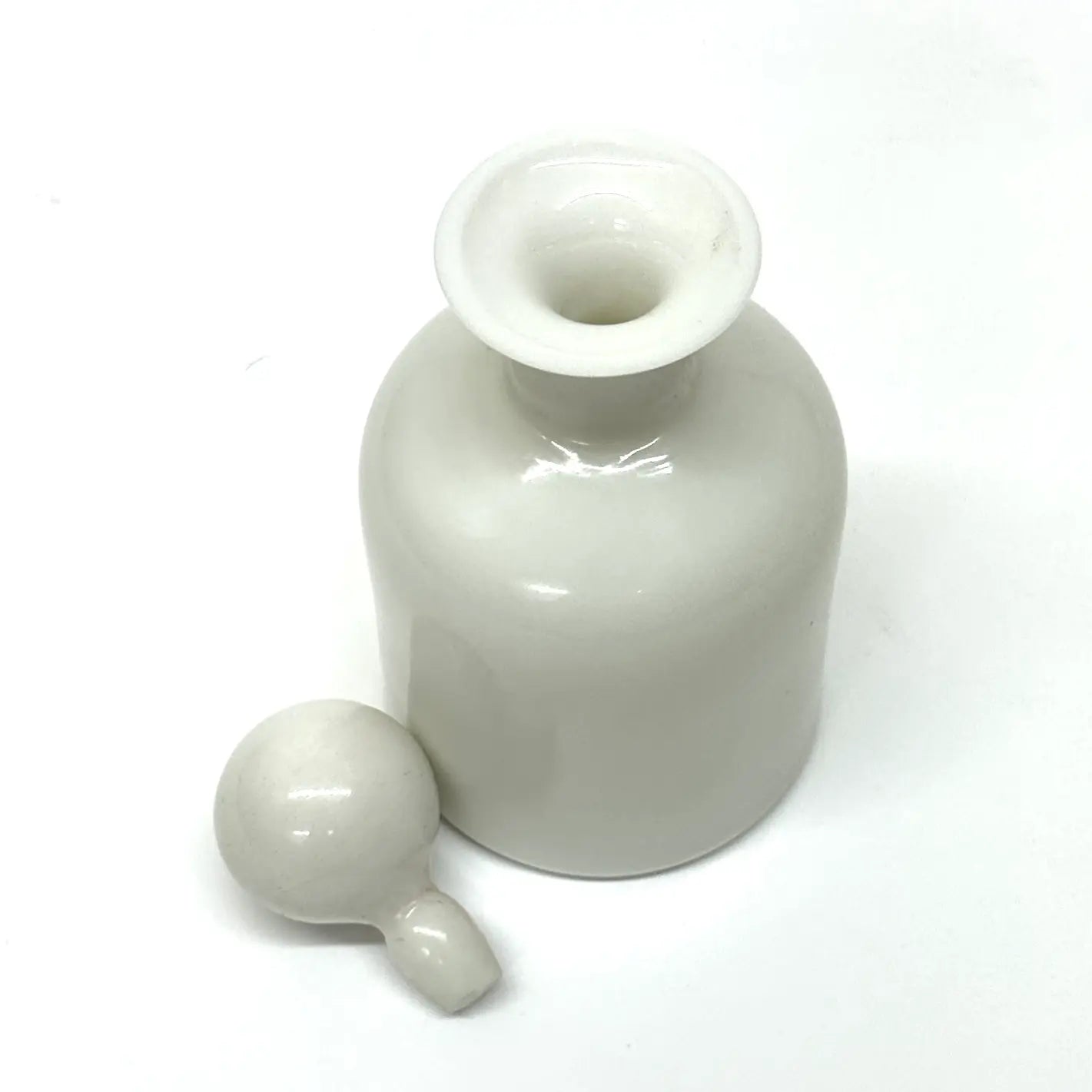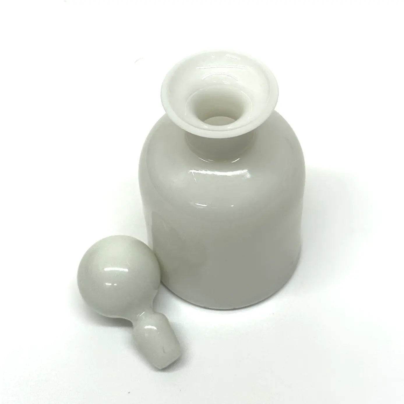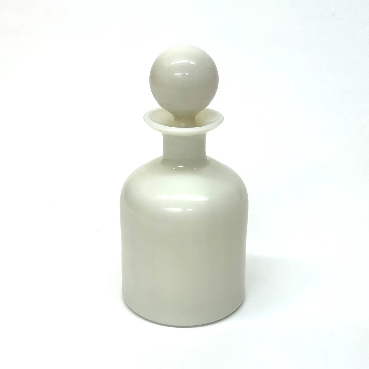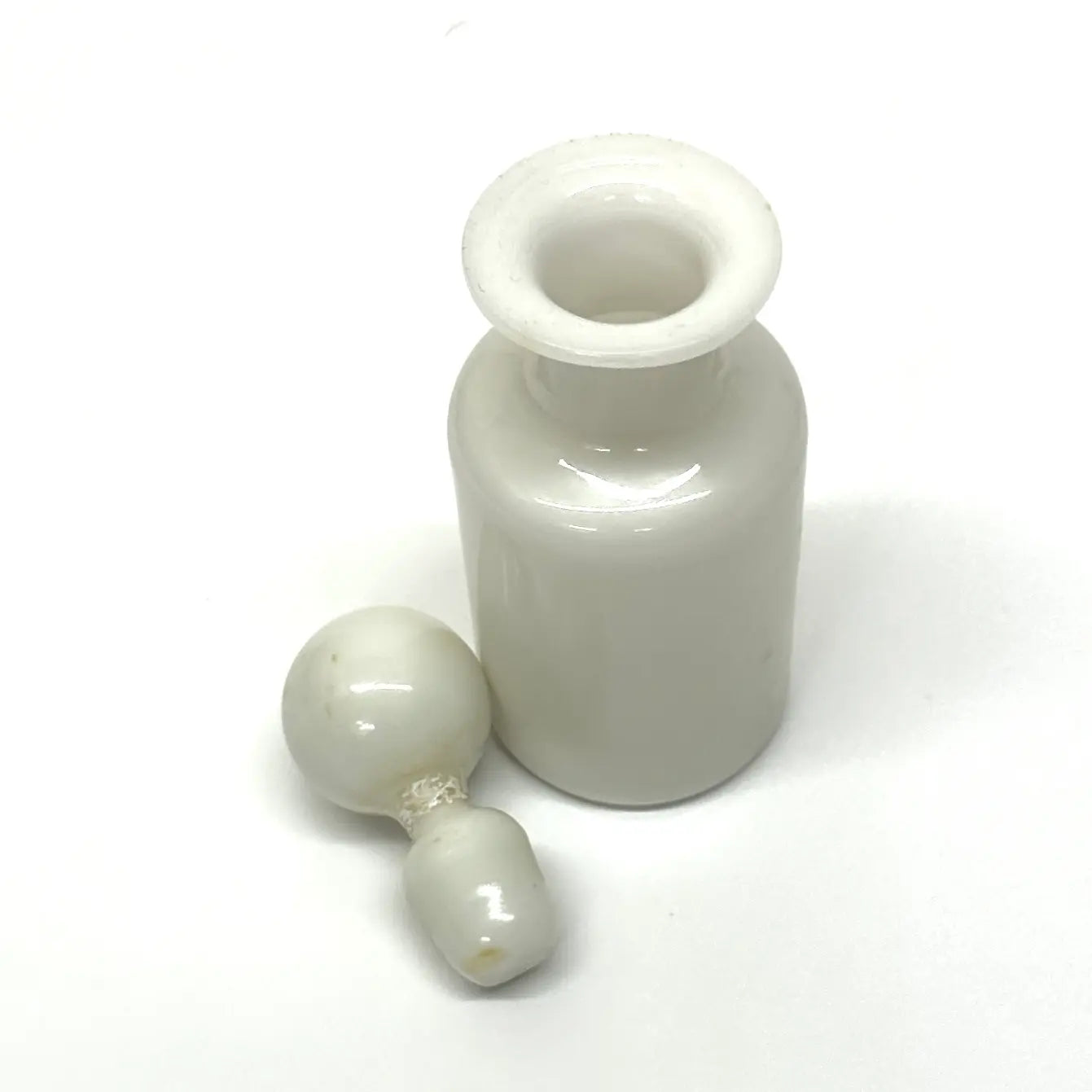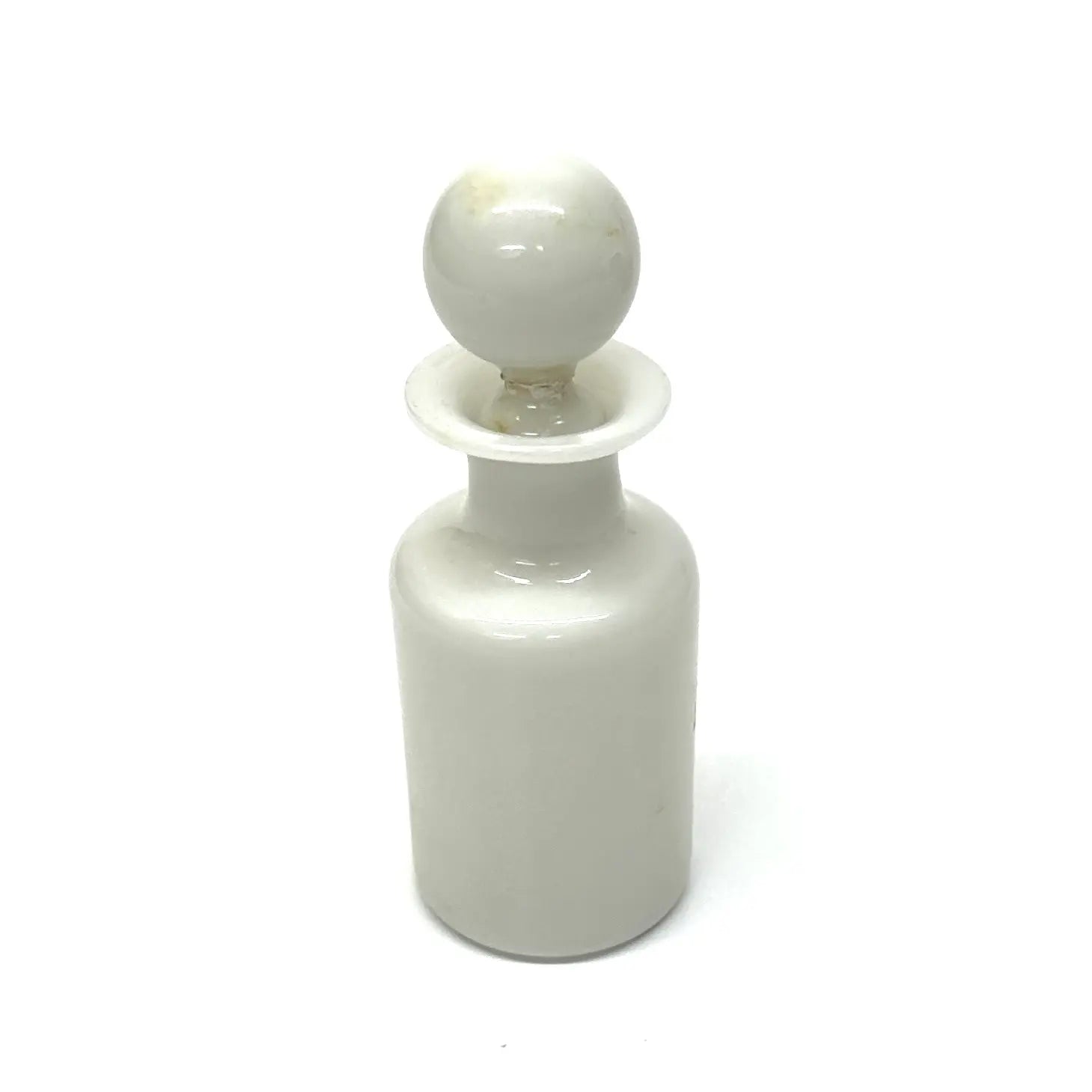 A gorgeous and delicate group of antique French Portieux Vallerysthal hand-blown, white, milk glass perfume bottles with stoppers in a variety of sizes.