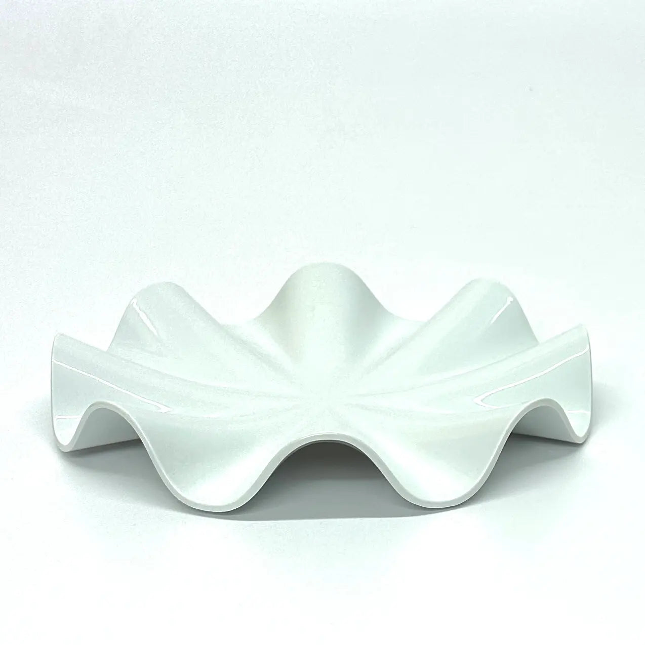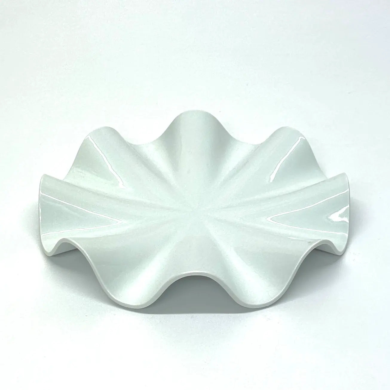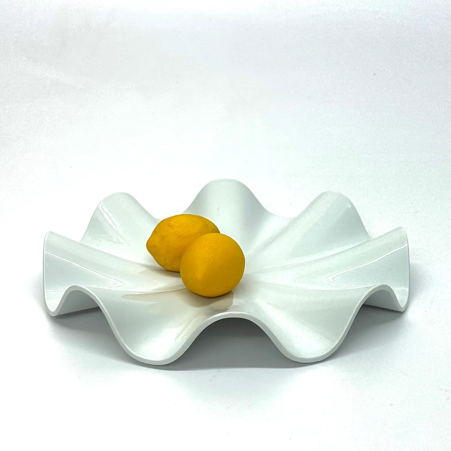 This is a stunning white ceramic ruffled decorative bowl or plate Karim Rashida for Nambe Porcelain, made in 2003. This is a rare piece from the early 2000s.