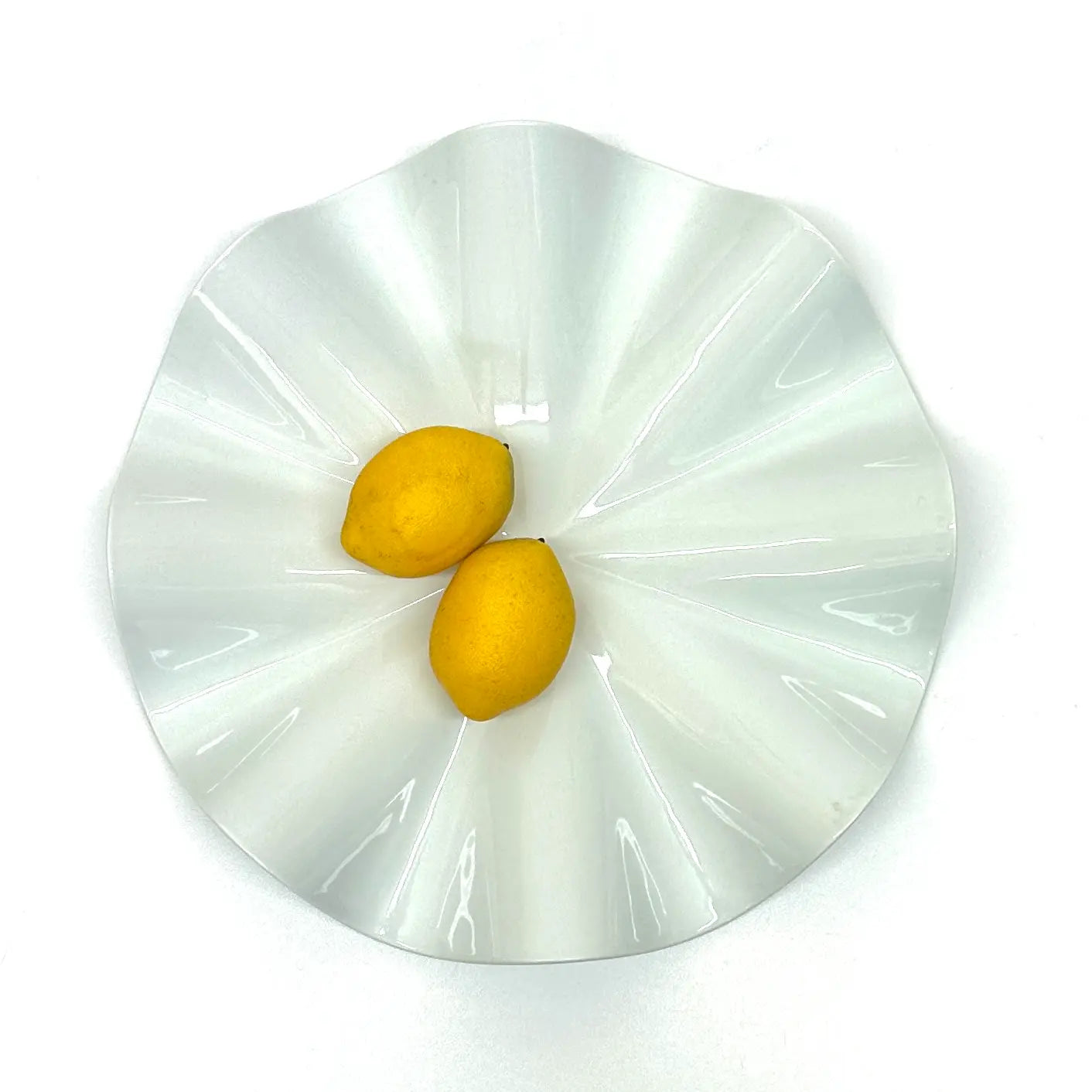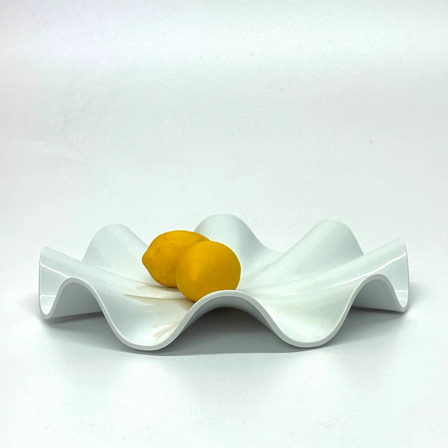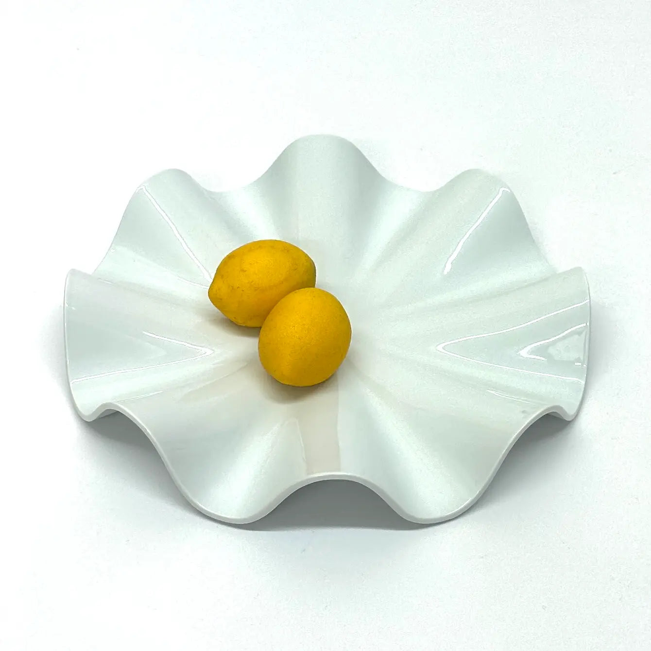 This is a stunning white ceramic ruffled decorative bowl or plate Karim Rashida for Nambe Porcelain, made in 2003. This is a rare piece from the early 2000s.