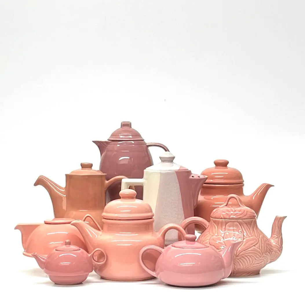 An eclectic group of blush pink multi-toned lidded teapots, primarily from the mid-20th century.