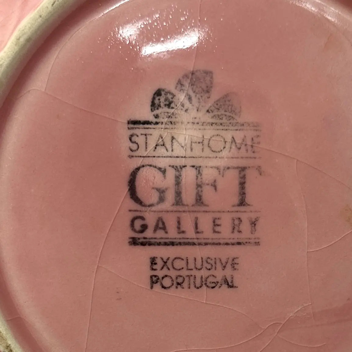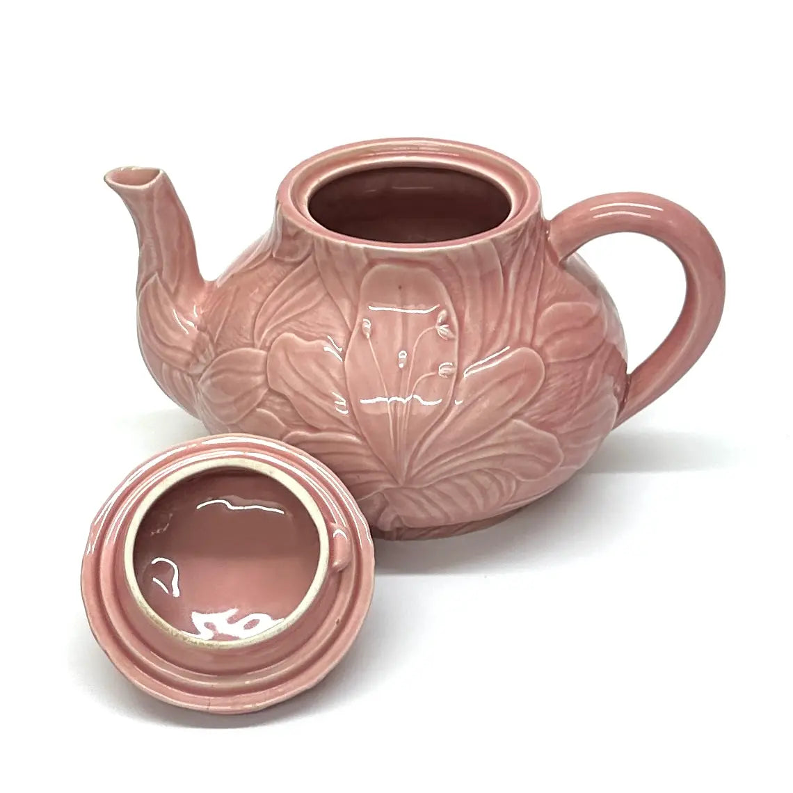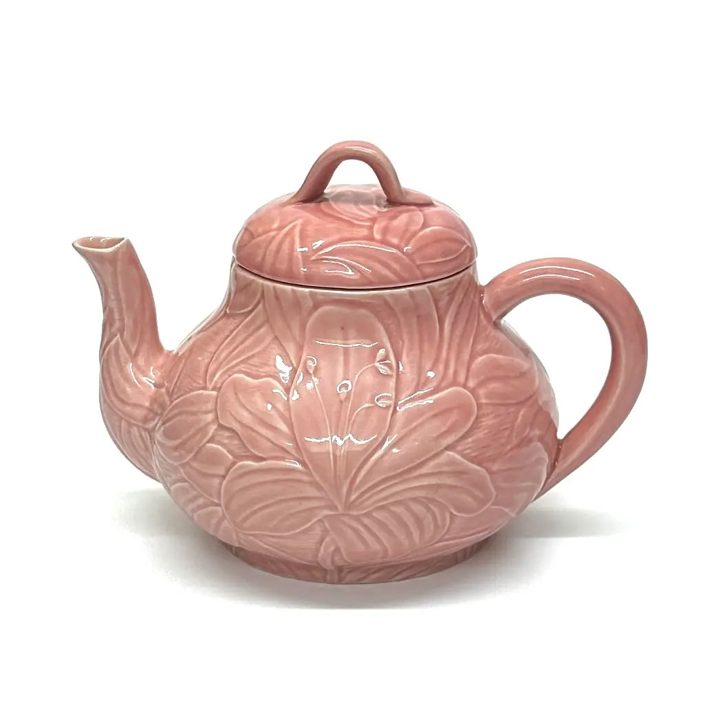 - Blush-pink floral motif, textured ceramic teapot, made in Portugal (good condition; this teapot has crazing and a very minor chip in the glaze on the spout). 9.75"W x 6.75"W