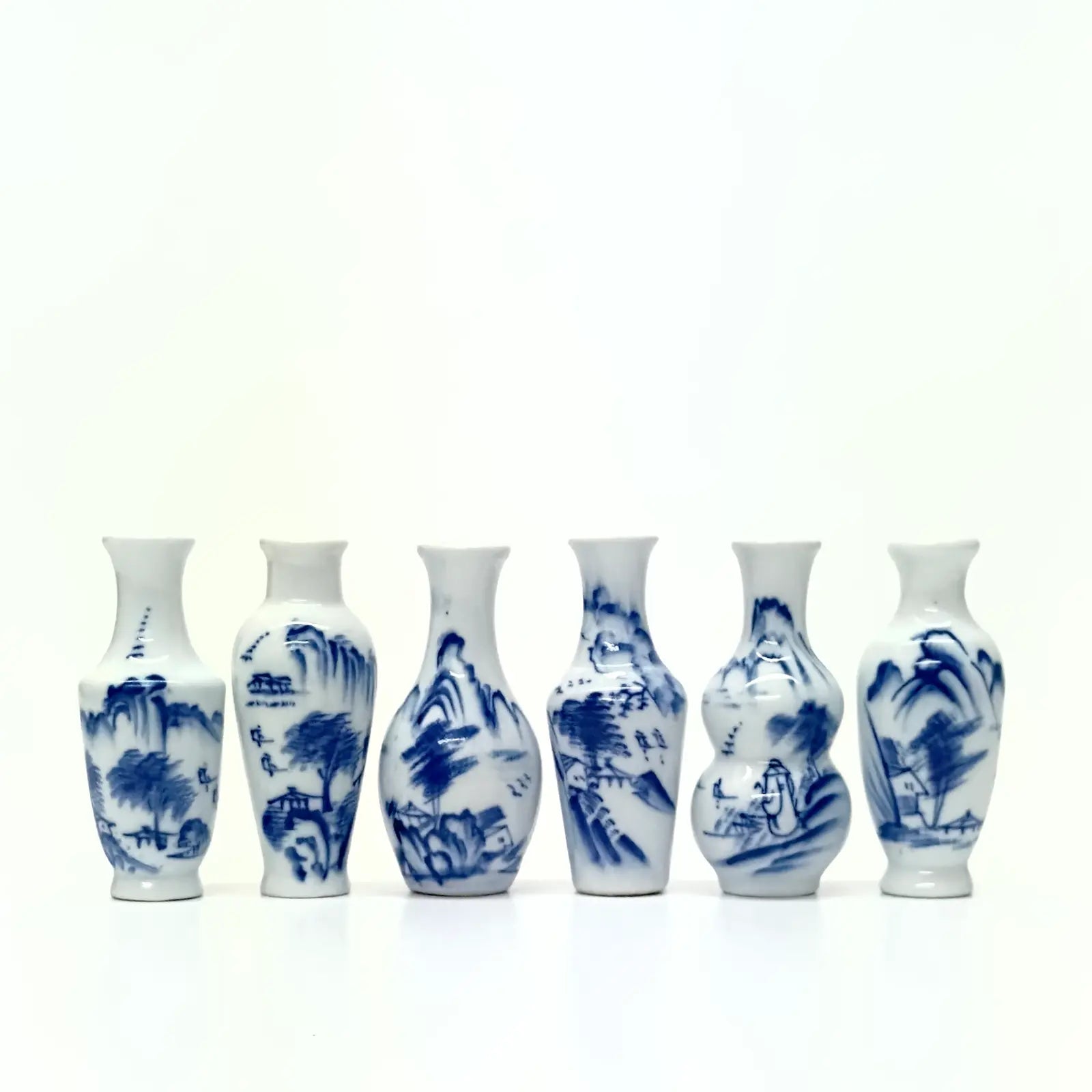 This elegant collection of porcelain bud vases showcases a mix of shapes, each adorned with intricate hand-painted blue and white designs.