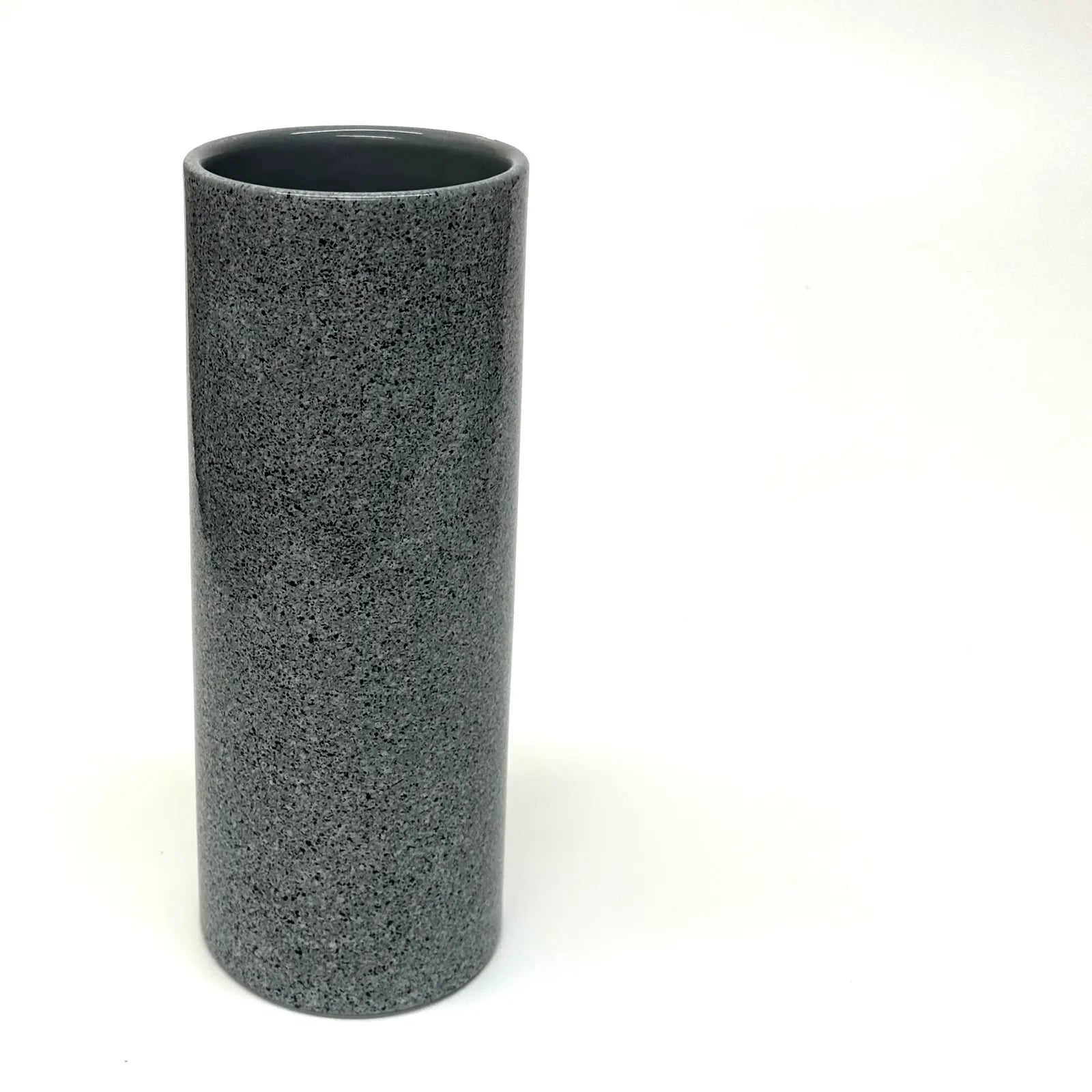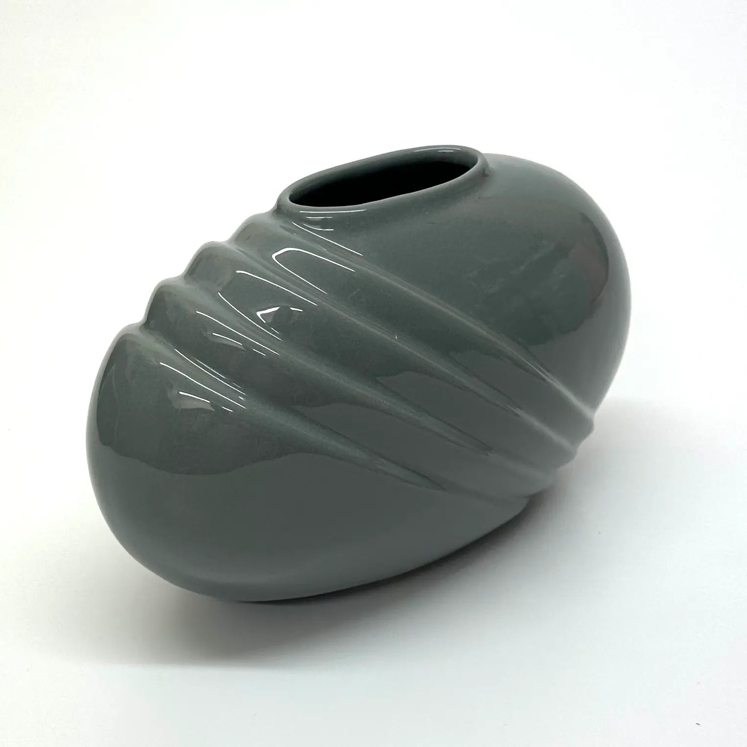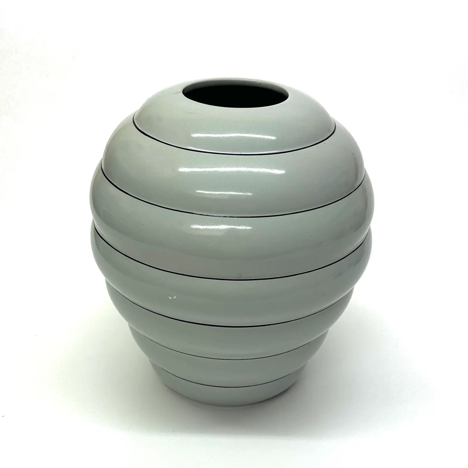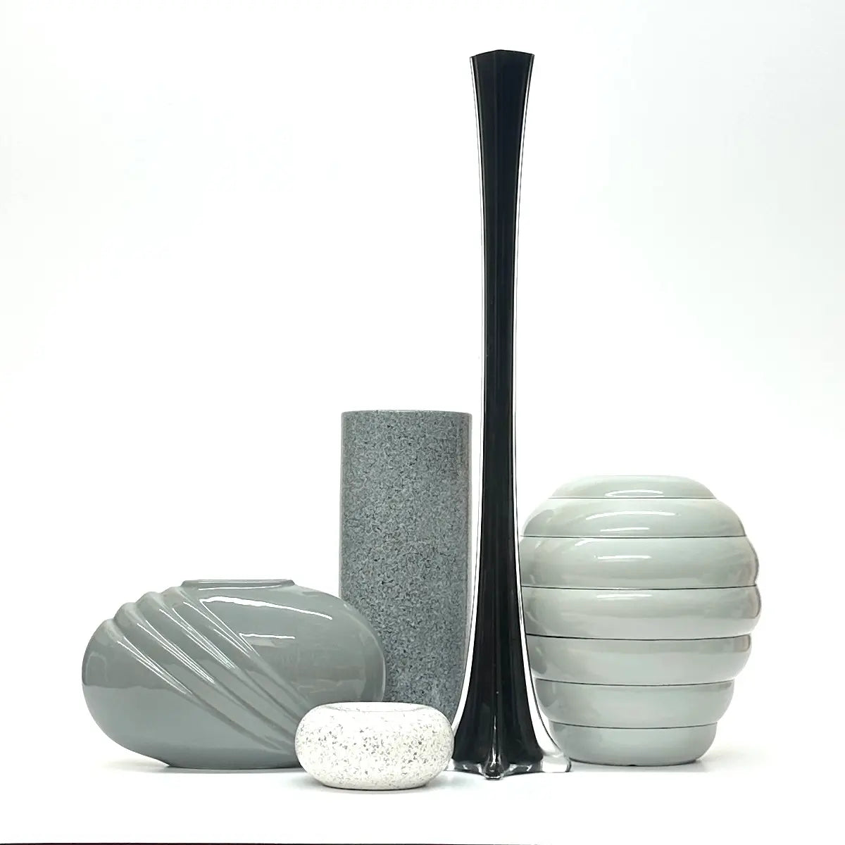 A symphony of grey and black ceramic and glass vases in a range of tones, shapes, and sizes. This curated collection includes mid-century pieces such as a beehive vase, bubble bowl, and Eiffel Tower vase.