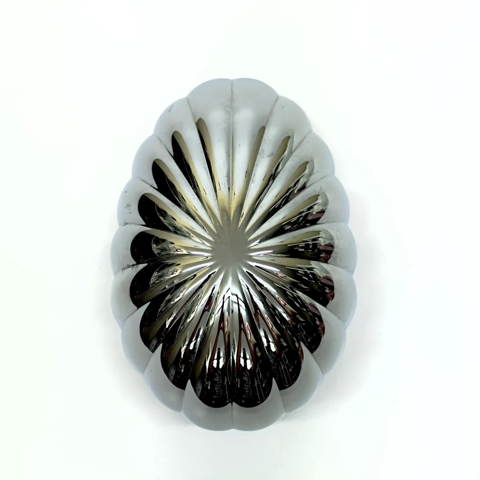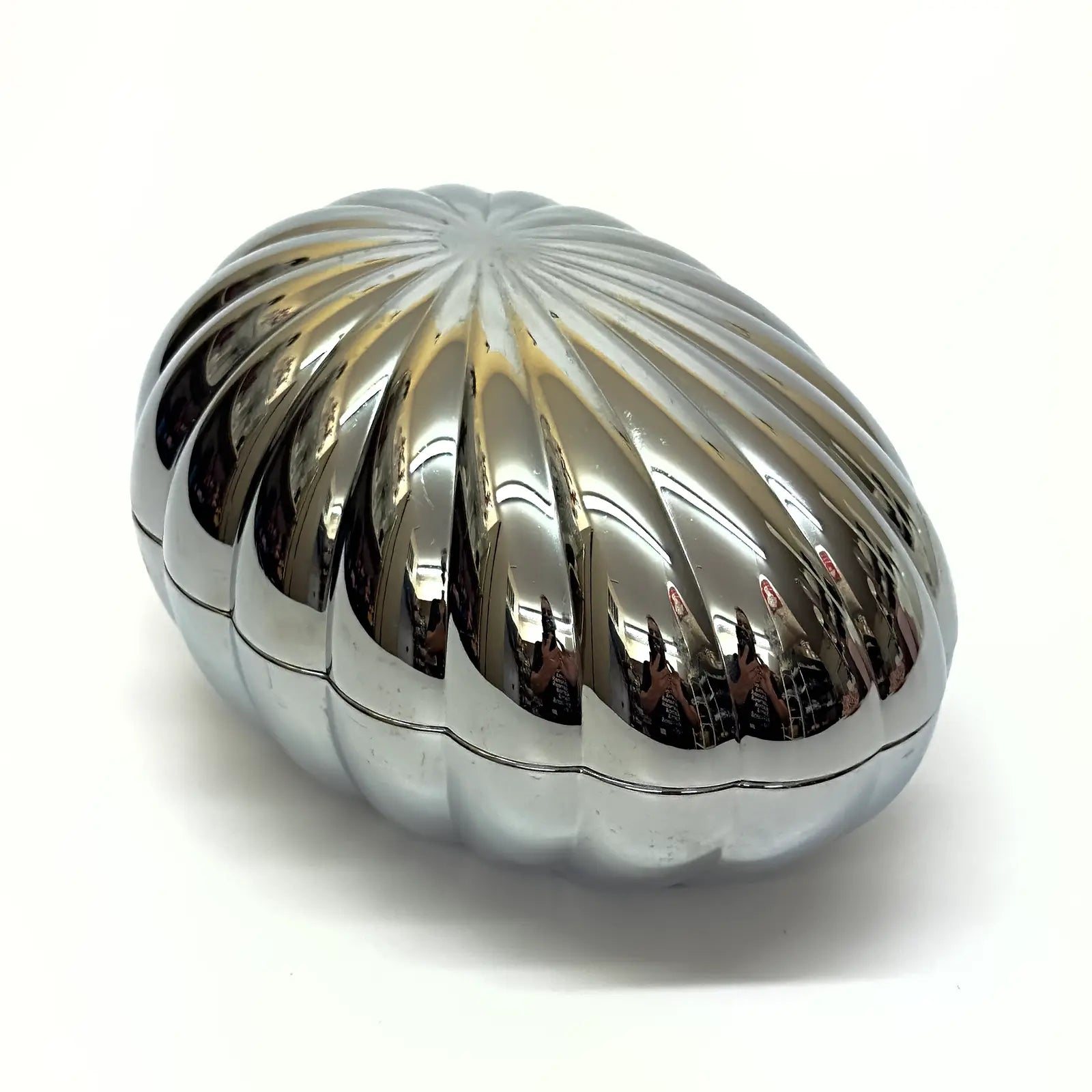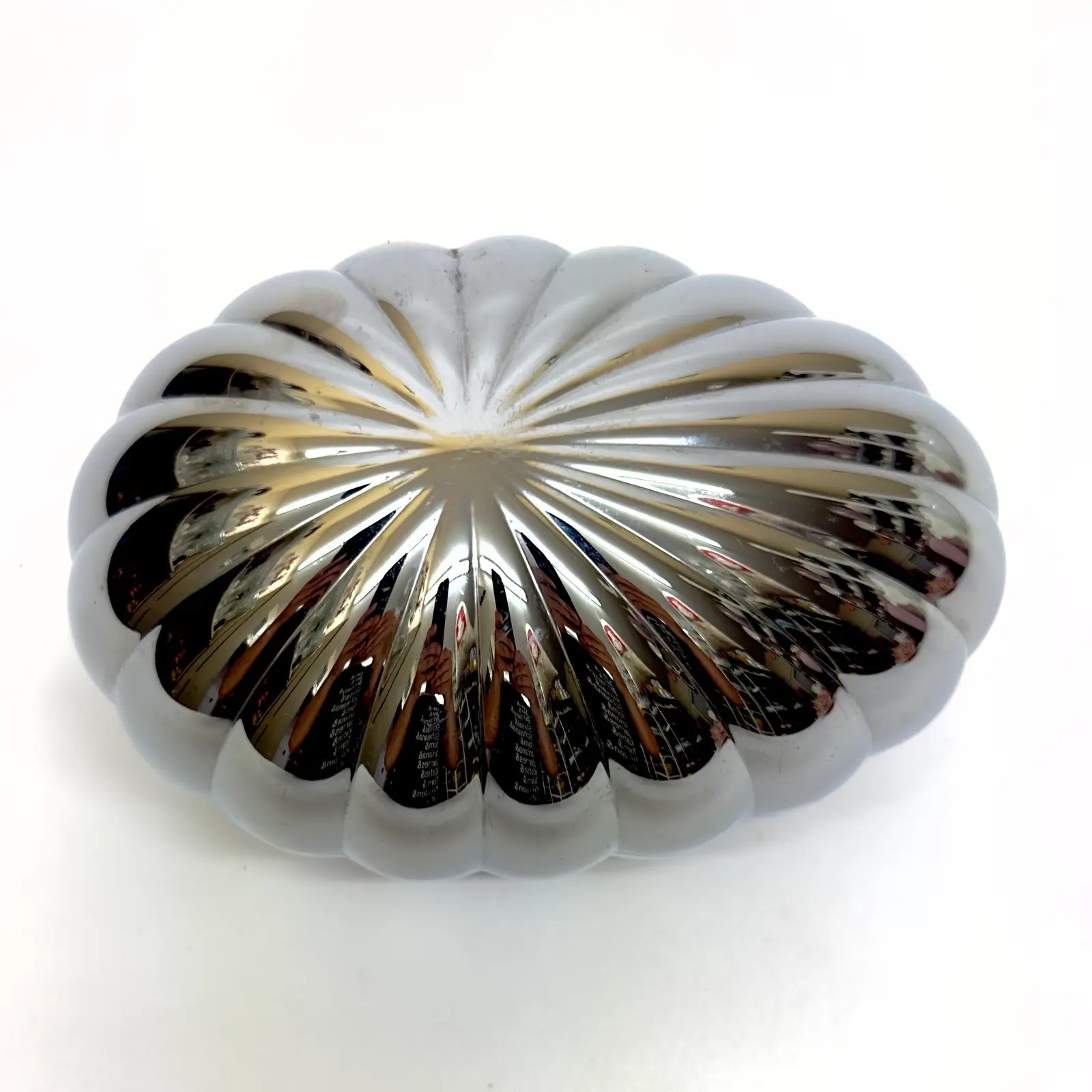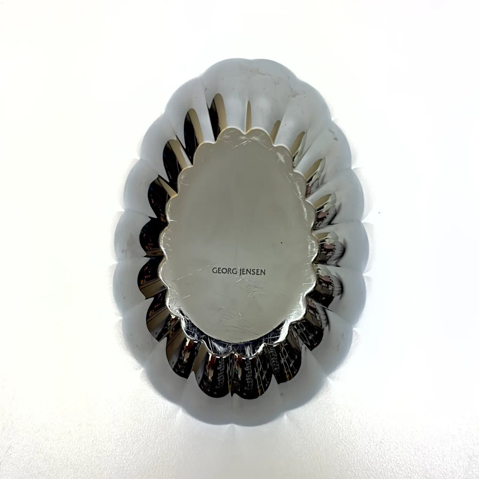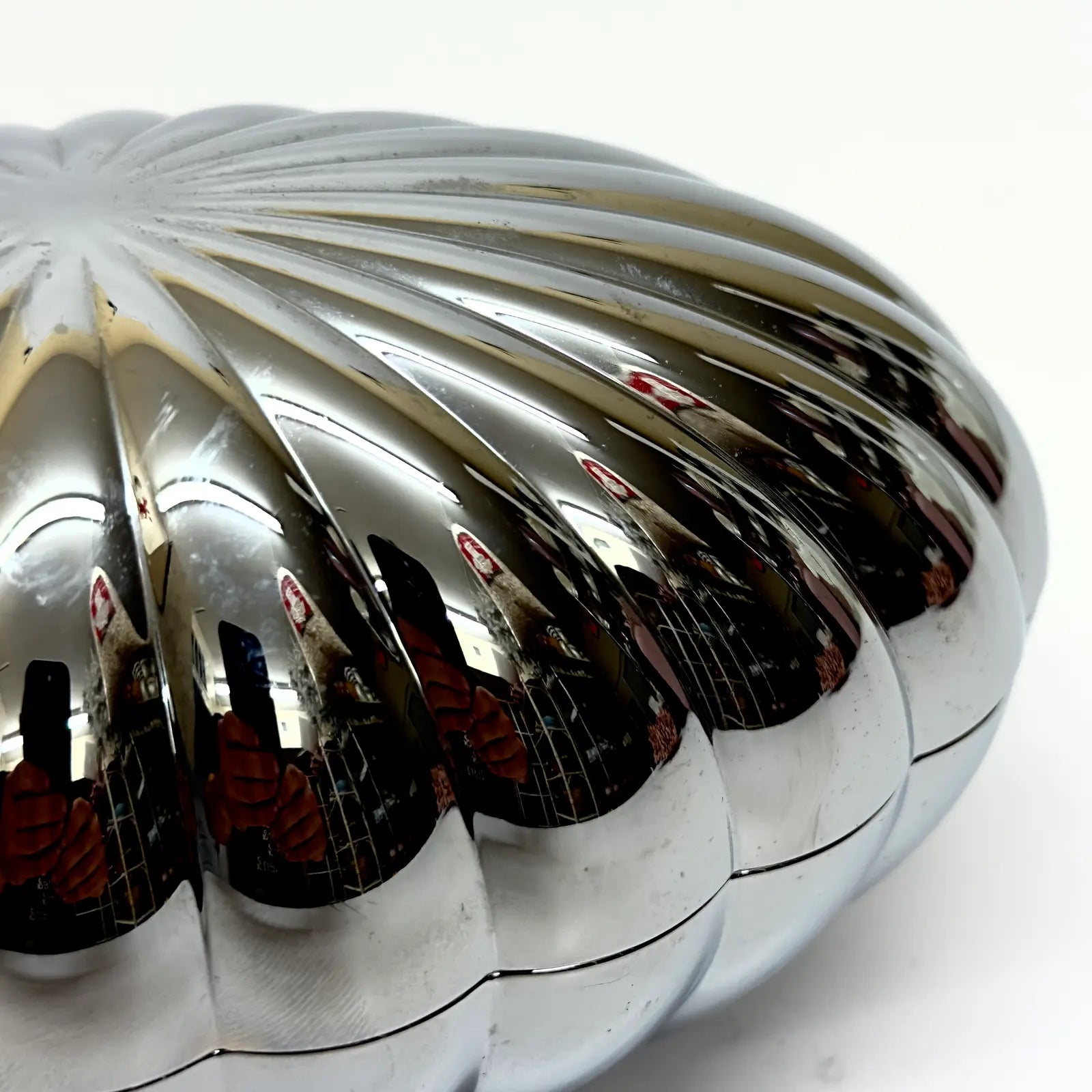 This is a stunning chromium-plated metal oval lidded Legacy Bonbonniere, a candy dish featuring a ribbed design. Designed in Denmark by Georg Jensen.