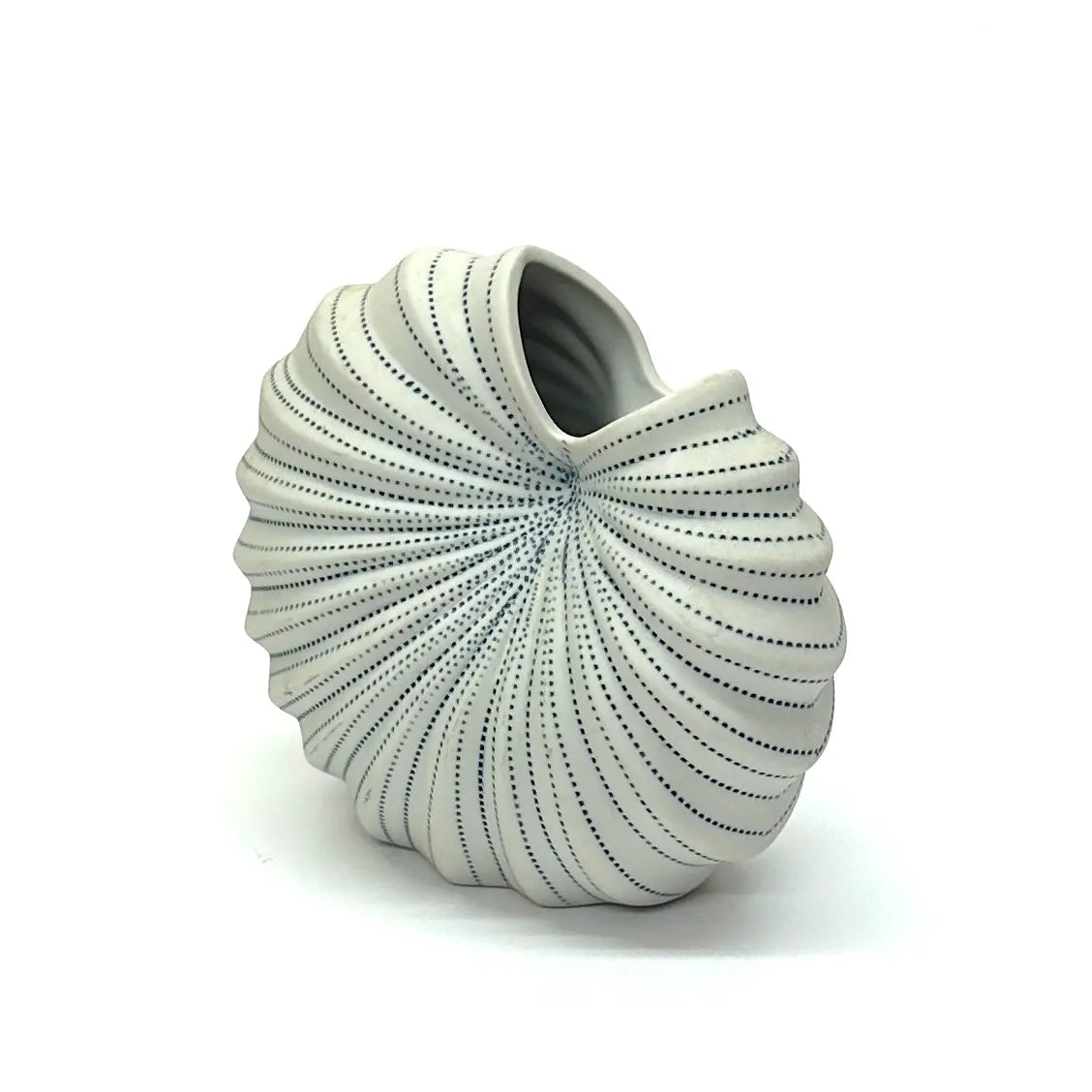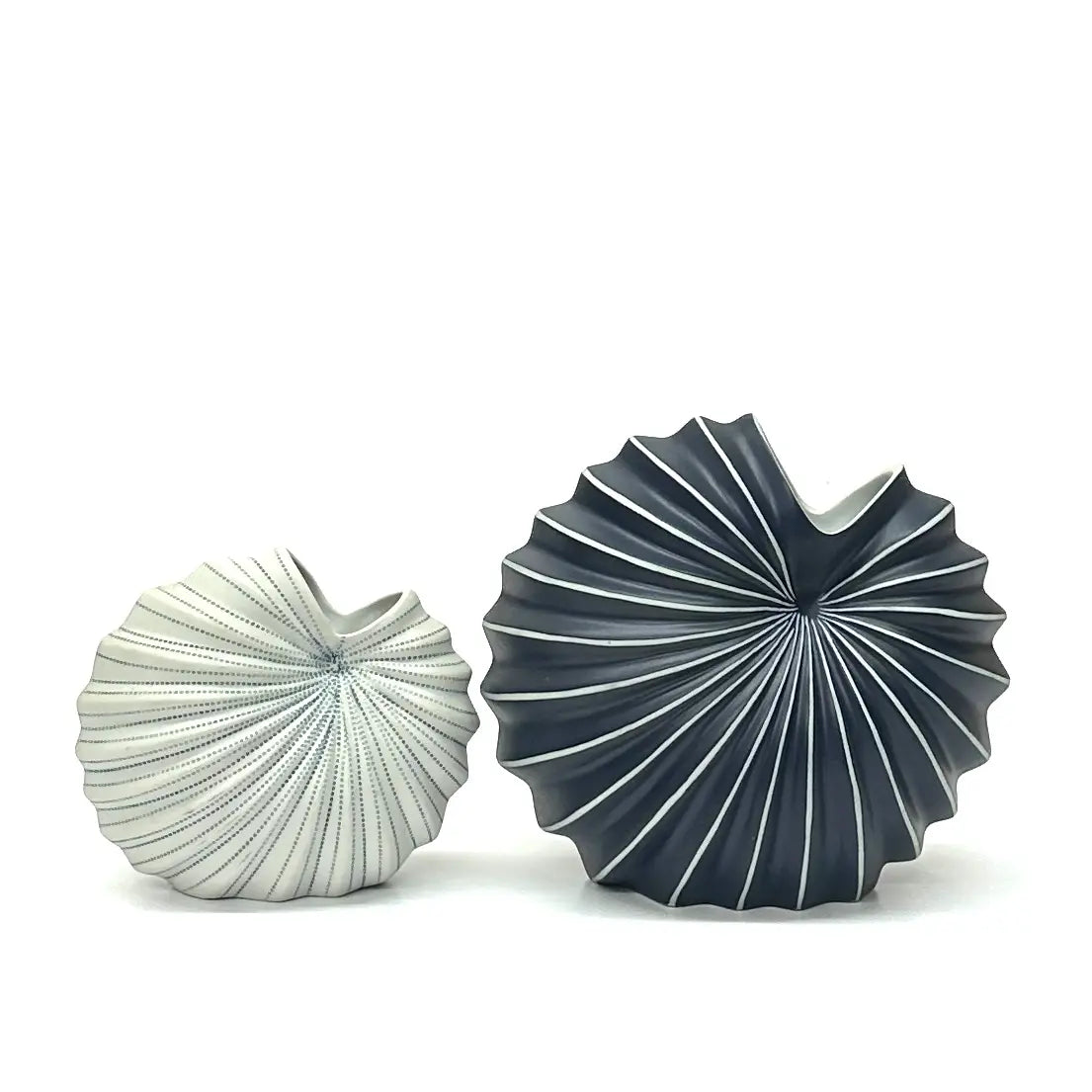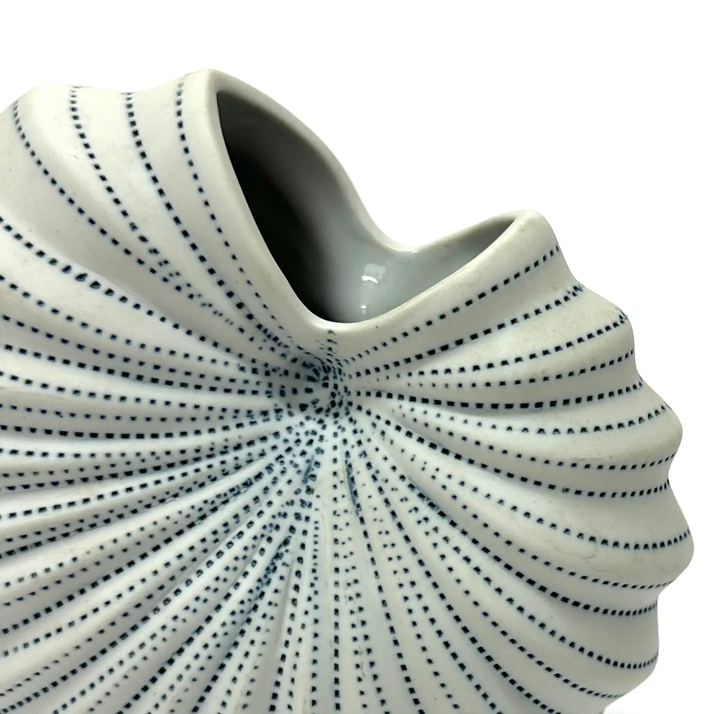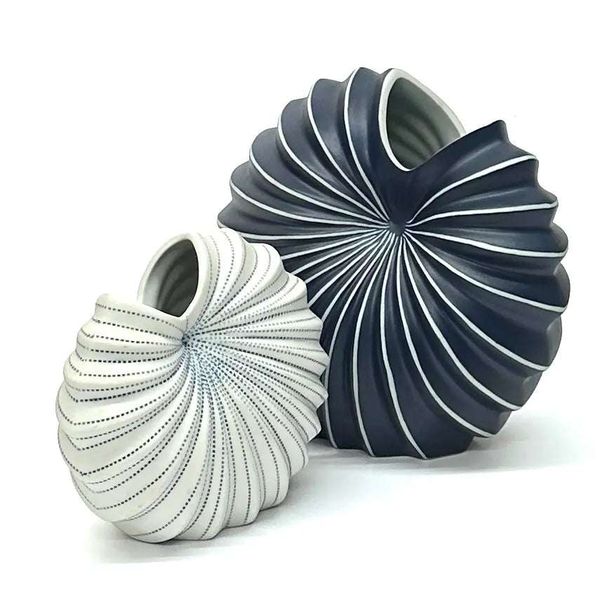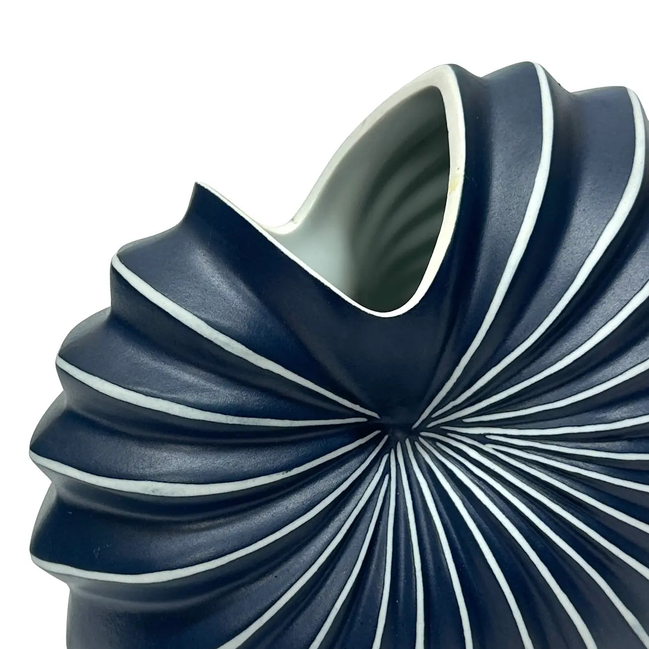 This is a stunning pair of mid-century matte porcelain sand palm or water shell vases. Featuring a larger vase with an indigo blue base and solid white stripes, as well as a smaller white vase with indigo blue pinstripes. In excellent vintage condition.