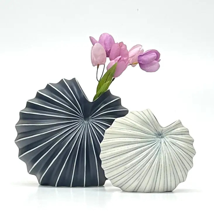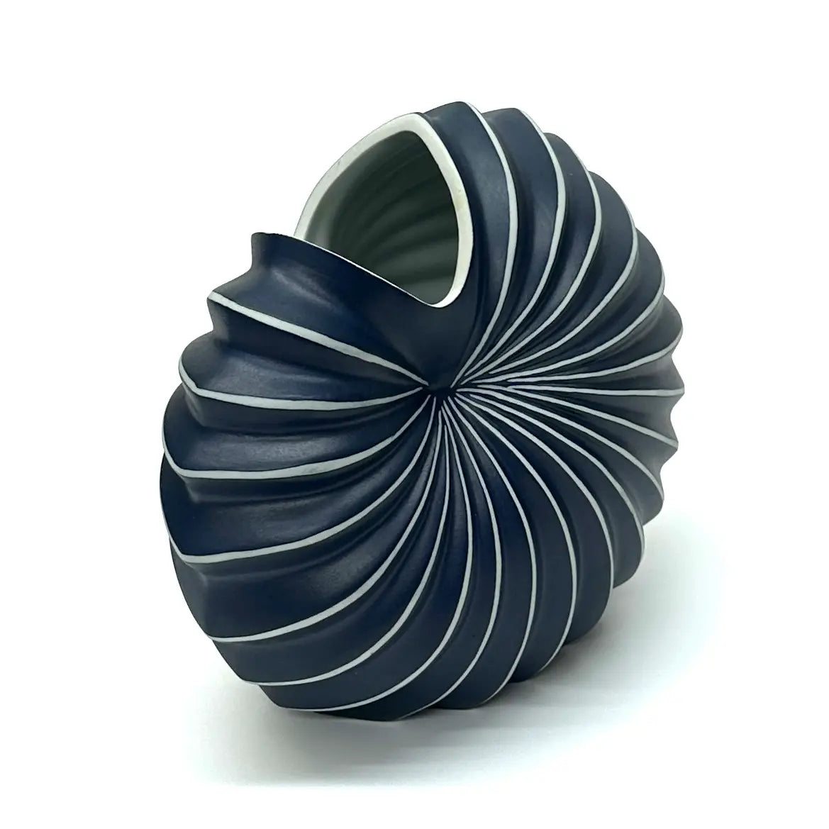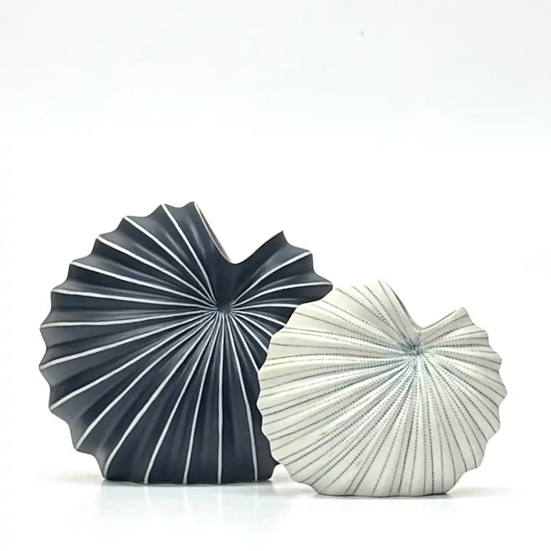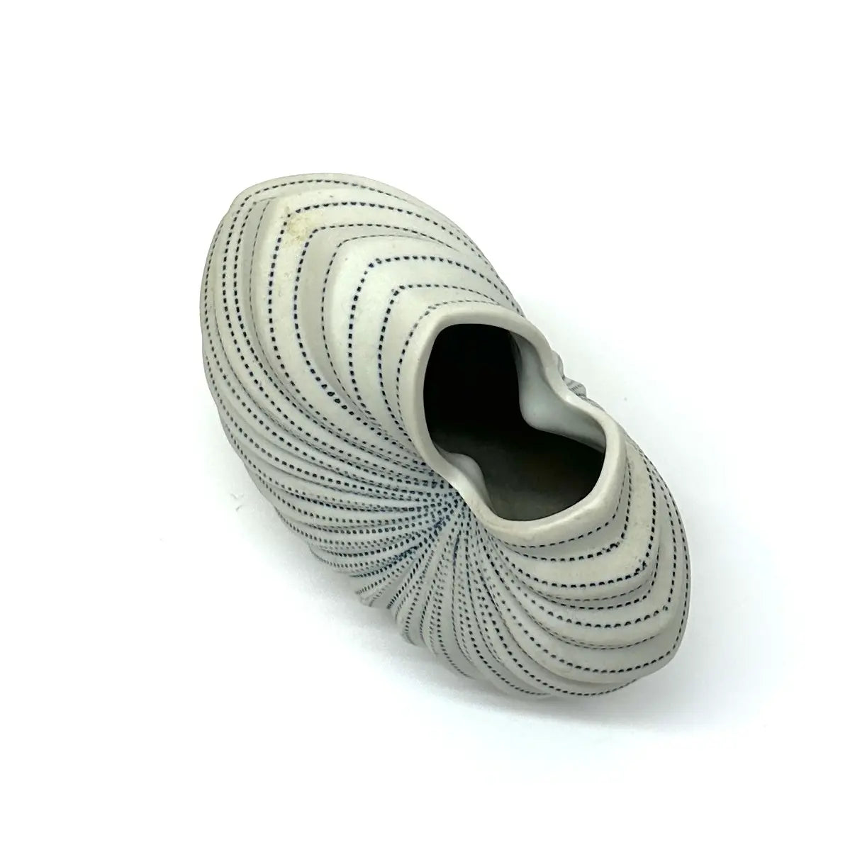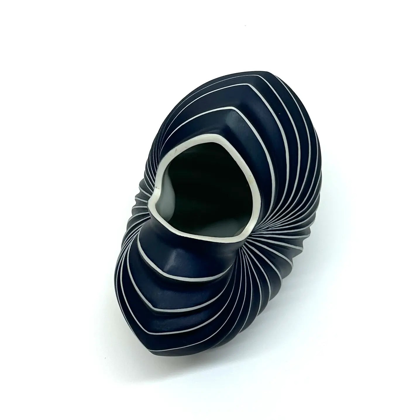 This is a stunning pair of mid-century matte porcelain sand palm or water shell vases. Featuring a larger vase with an indigo blue base and solid white stripes, as well as a smaller white vase with indigo blue pinstripes. In excellent vintage condition.