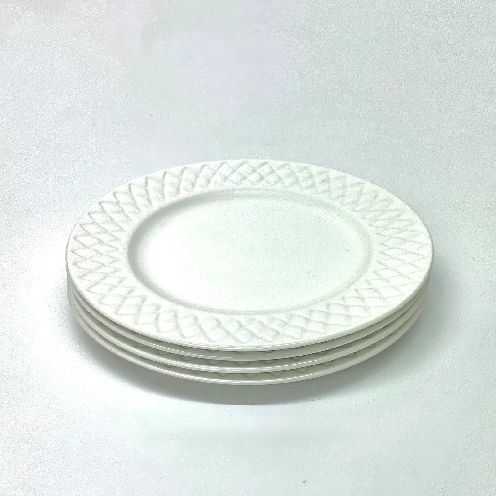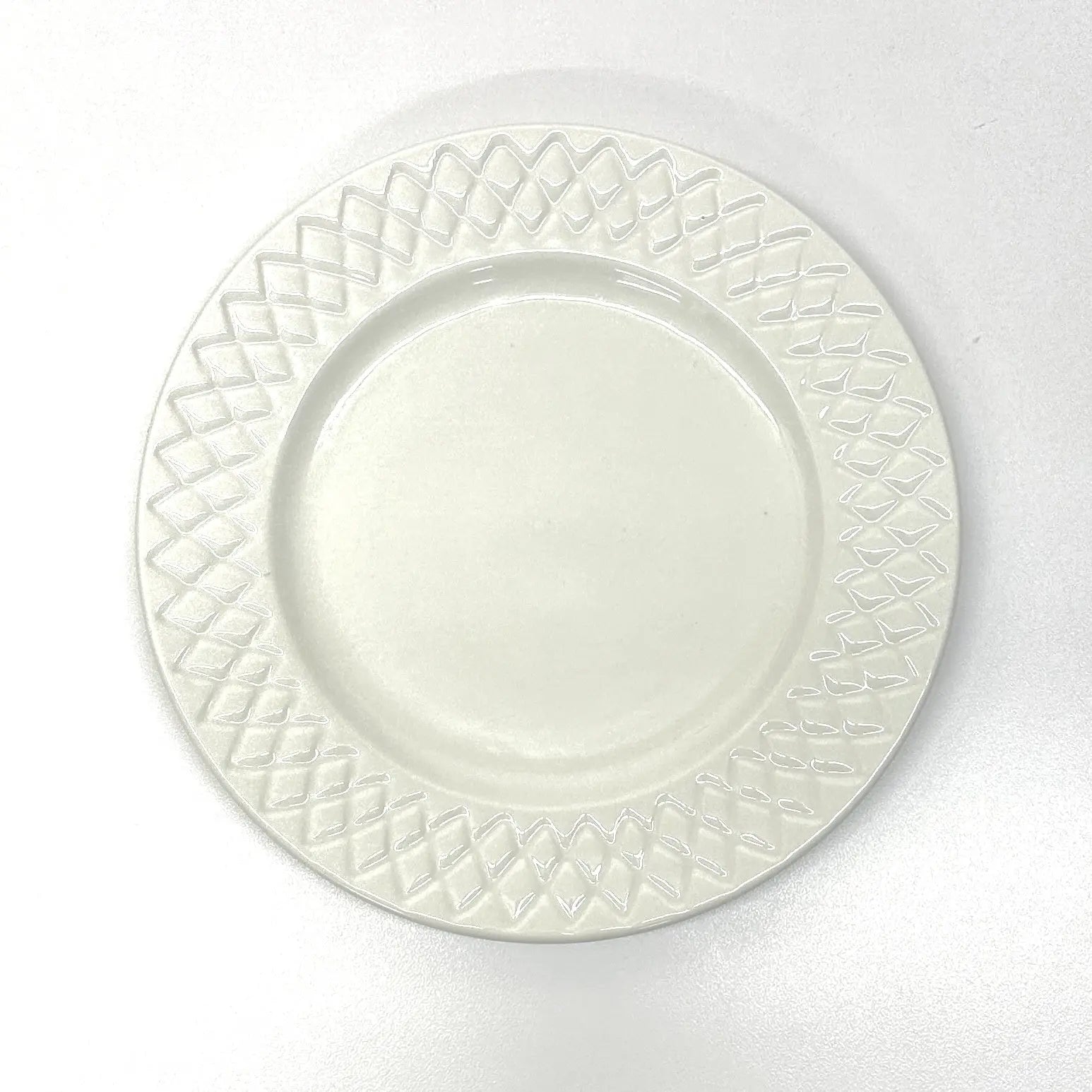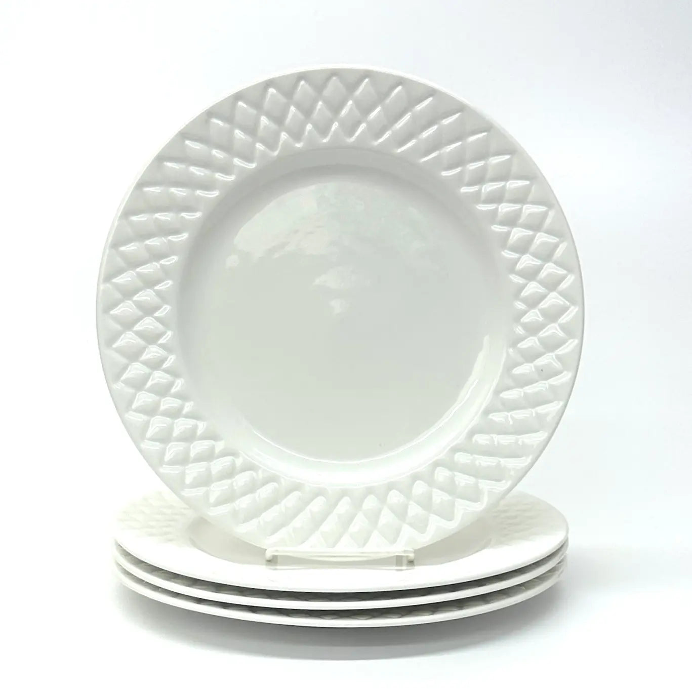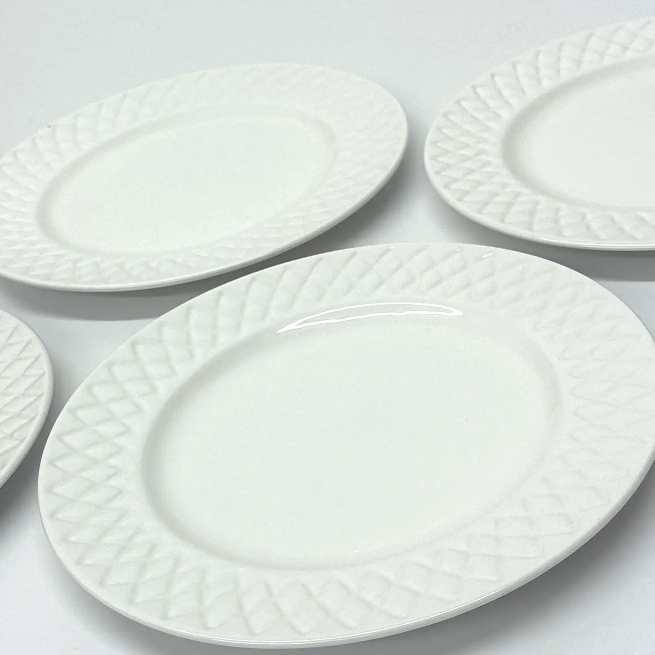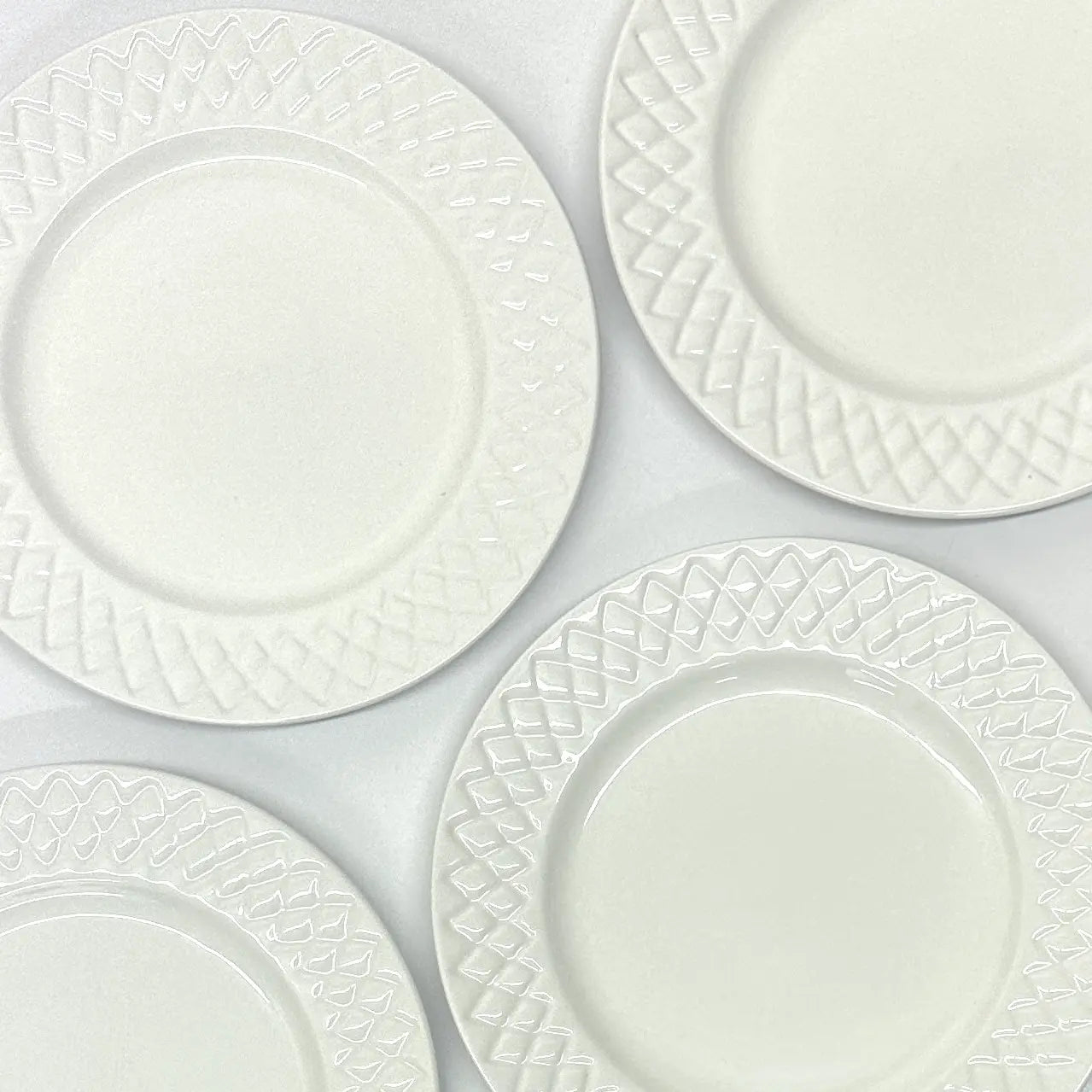 This is a delicate set of white porcelain lattice edge dinner plates from the mid-20th century.