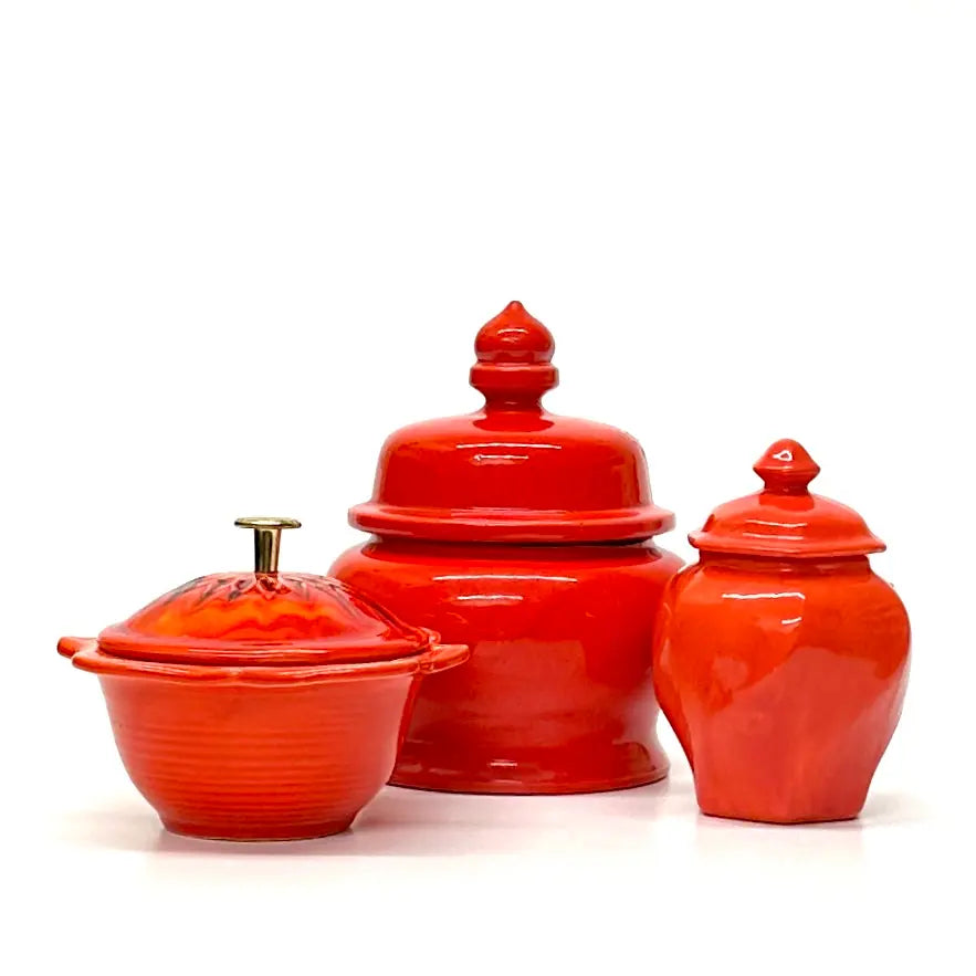 Eclectic red ceramic lidded containers from the mid 20th century, in assorted shapes and sizes.