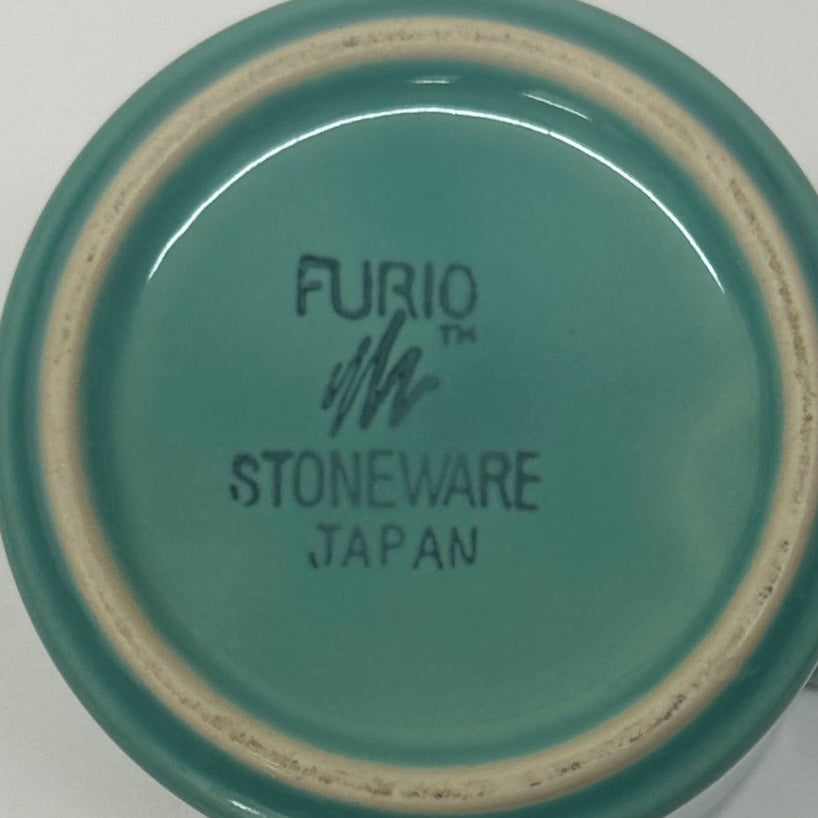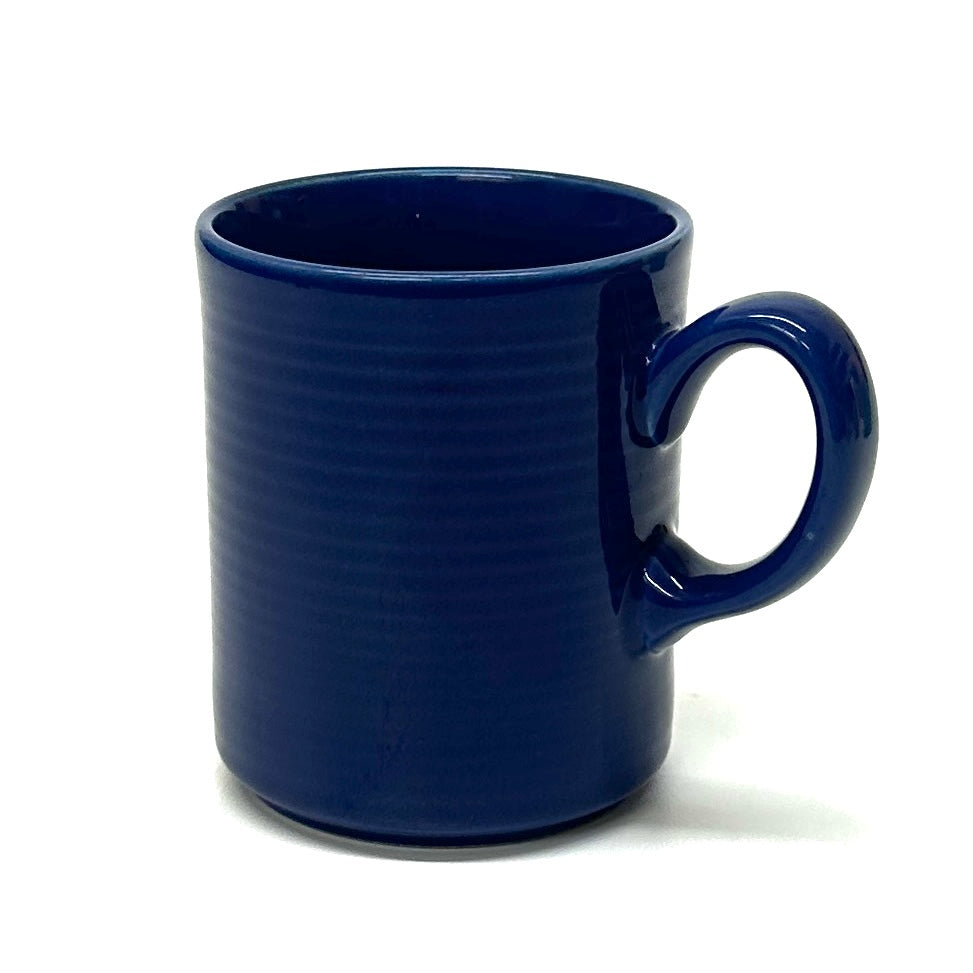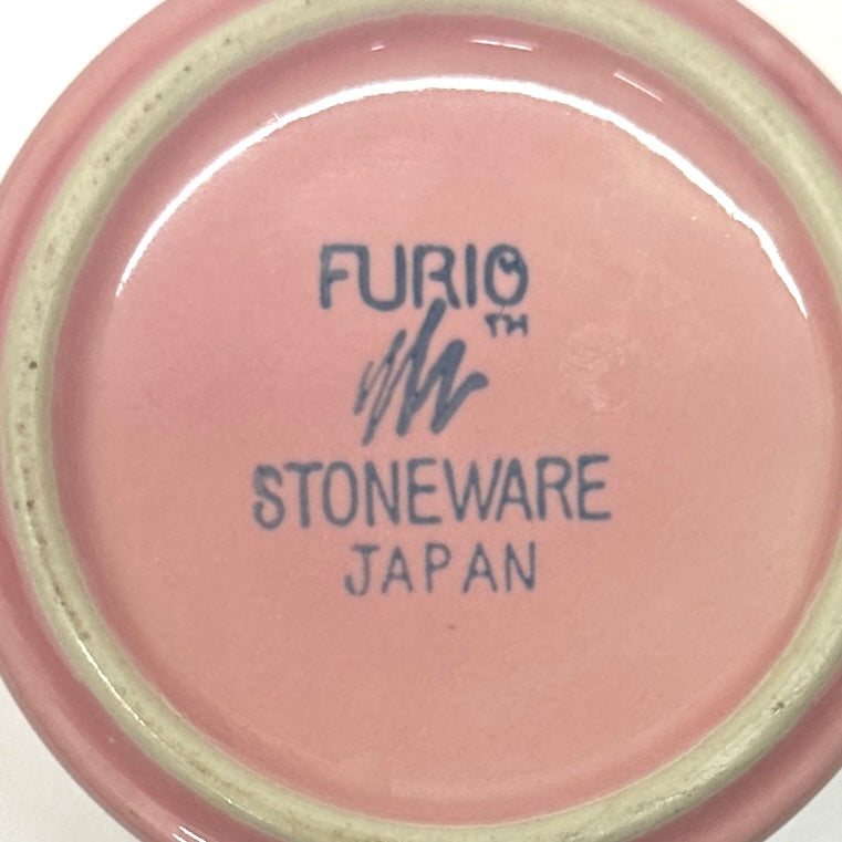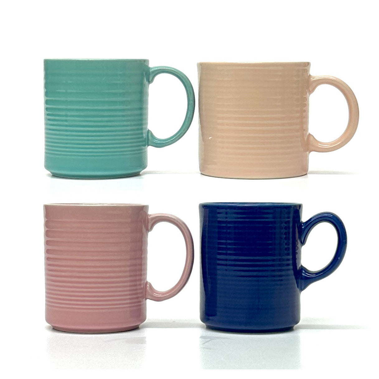 This is a beautiful group of assorted multi-colored mugs featuring pieces by Pier 1, though predominantly crafted by Furio in Japan, during the mid-20th century. These stoneware mugs are in turquoise, rose pink, cream, and navy blue colors with a ribbed design.