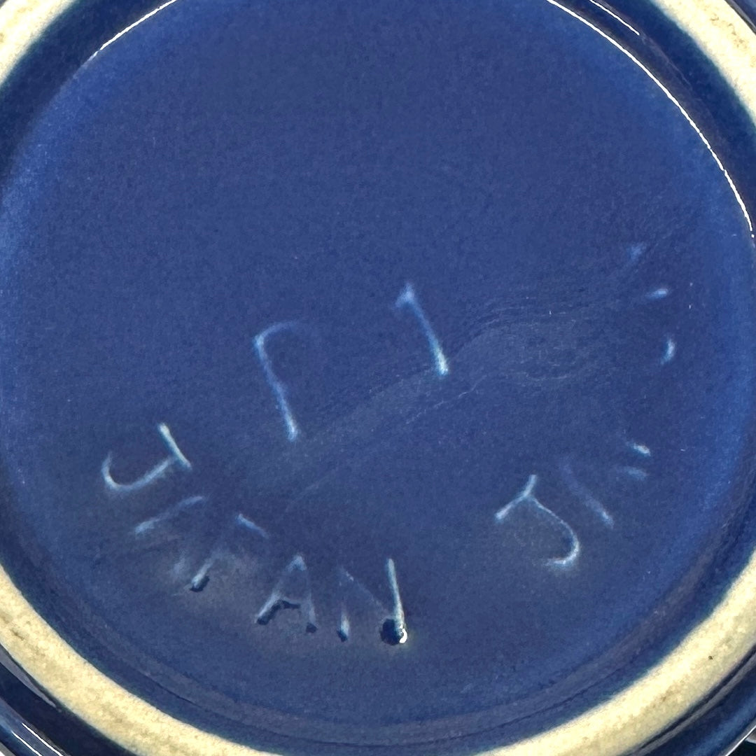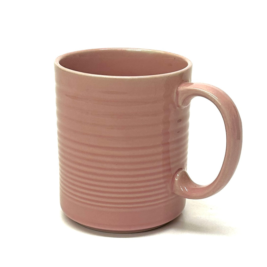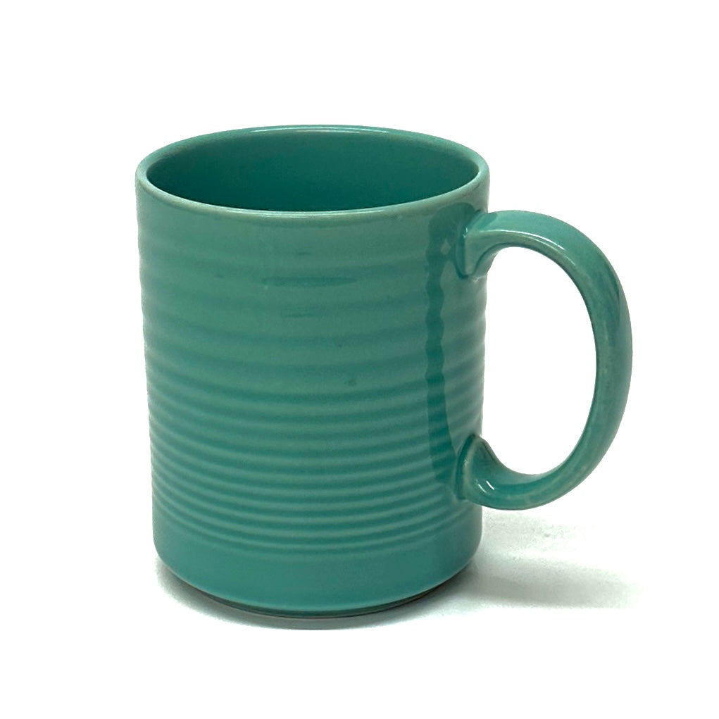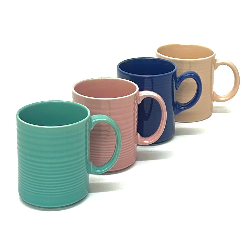 This is a beautiful group of assorted multi-colored mugs featuring pieces by Pier 1, though predominantly crafted by Furio in Japan, during the mid-20th century. These stoneware mugs are in turquoise, rose pink, cream, and navy blue colors with a ribbed design.
