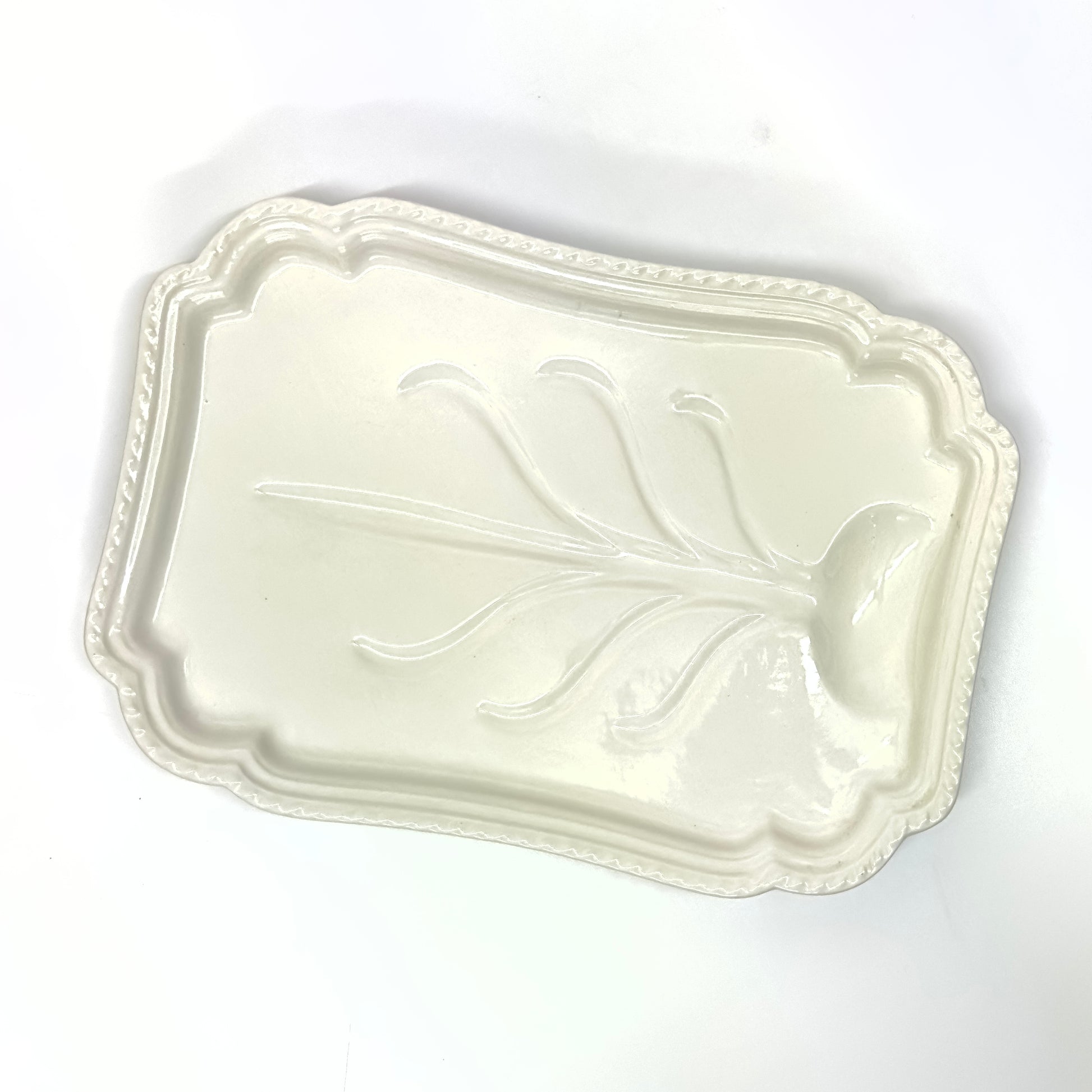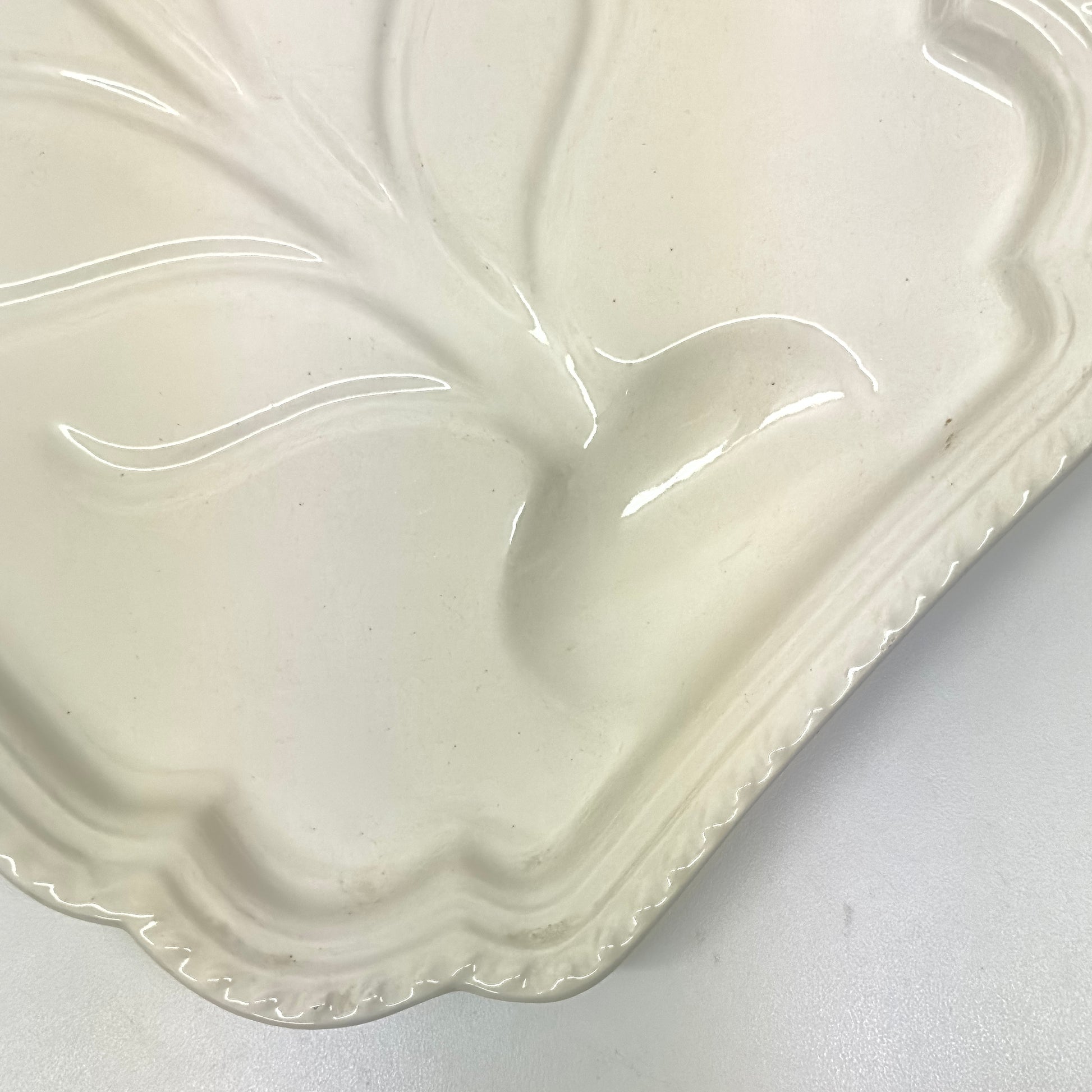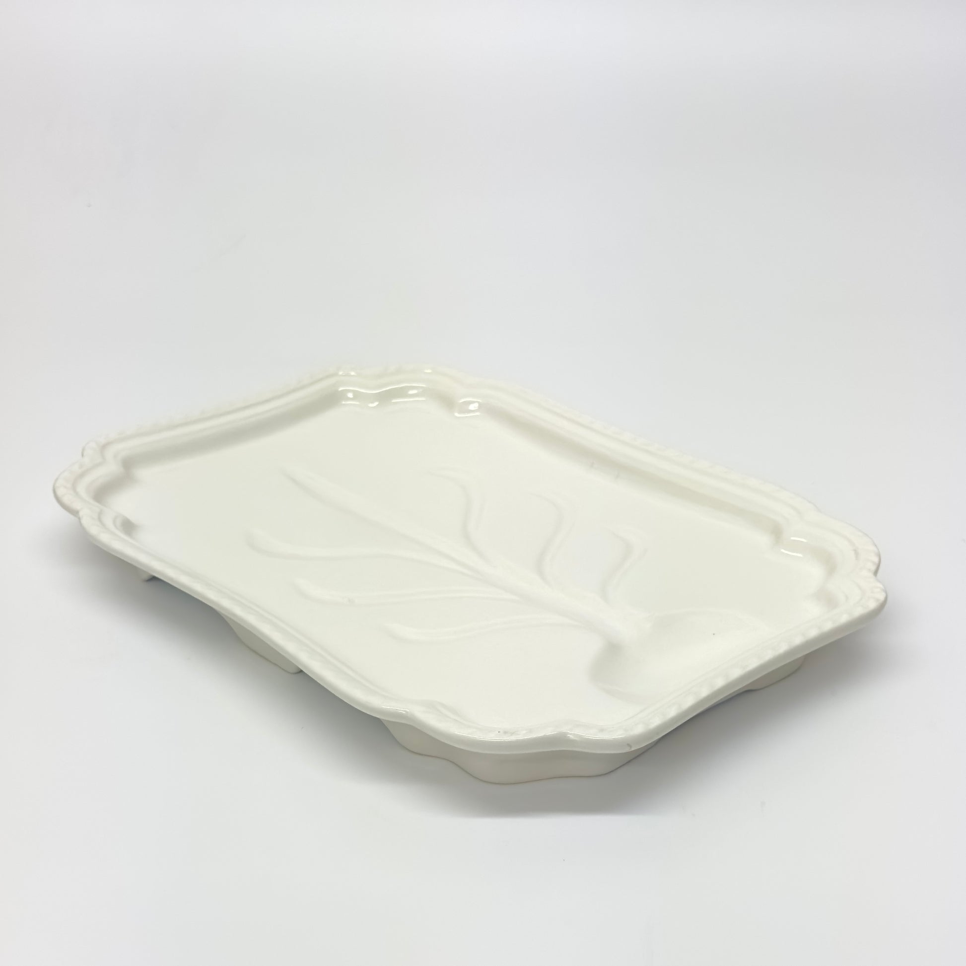 This is a gorgeous ceramic rectangular platter in a cream shade featuring a textured design along the edges and tree branches in teh center.