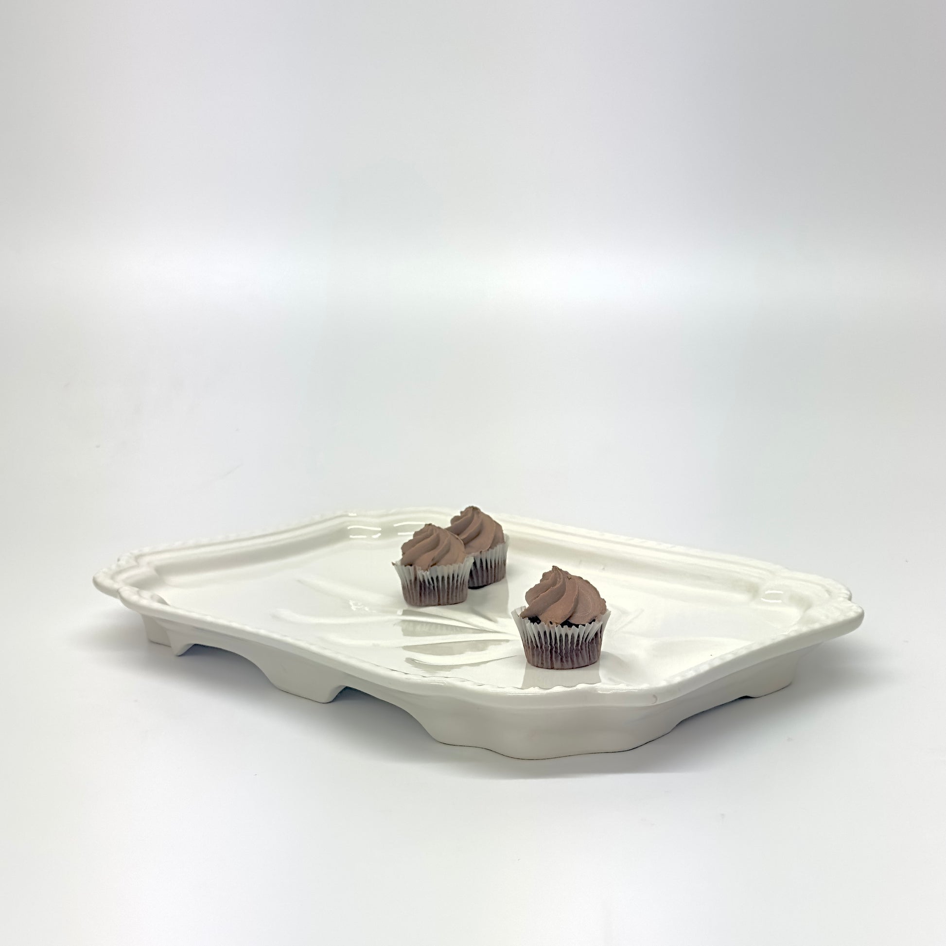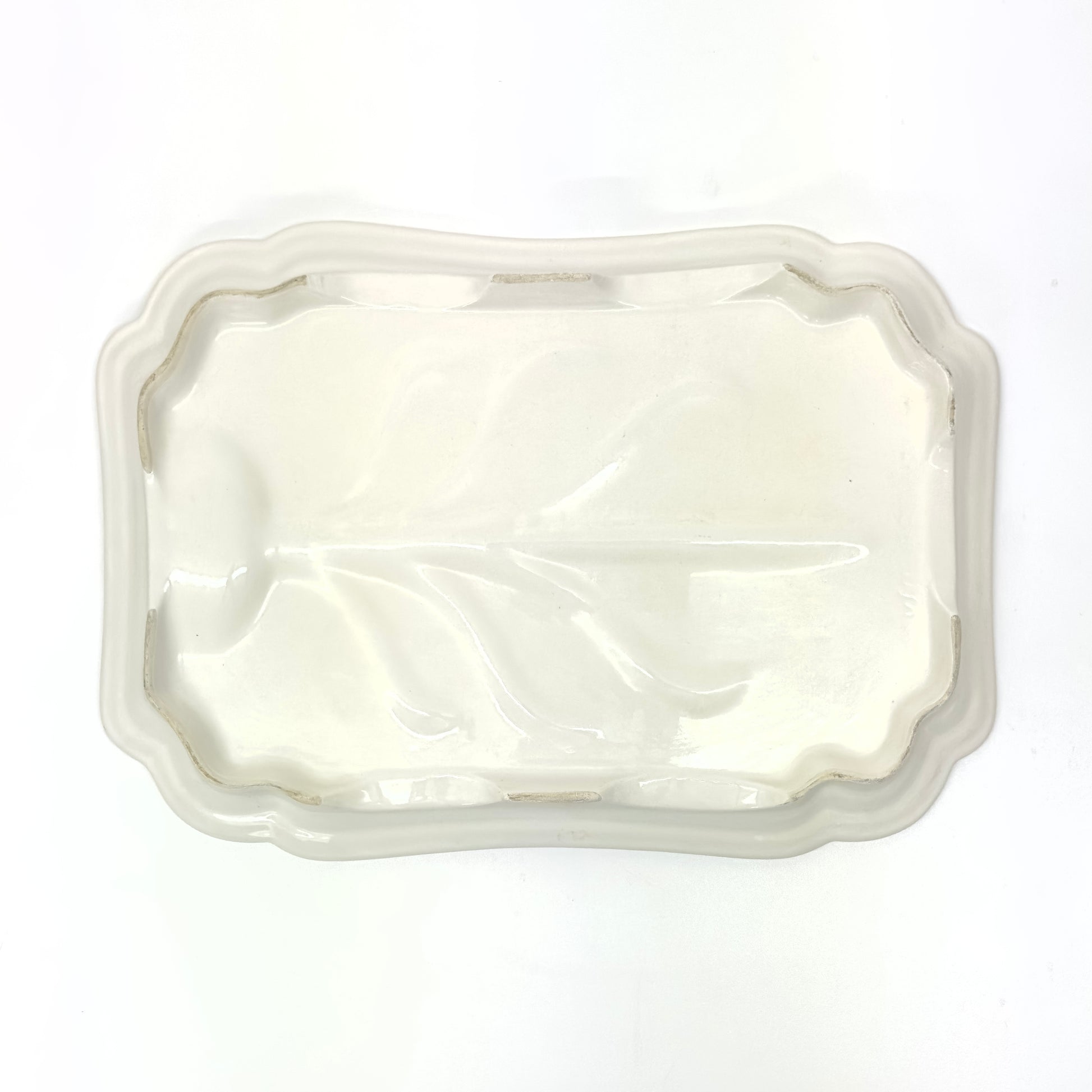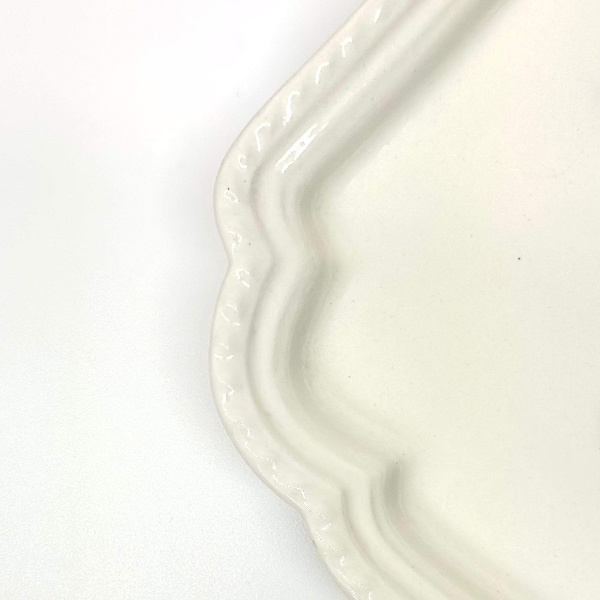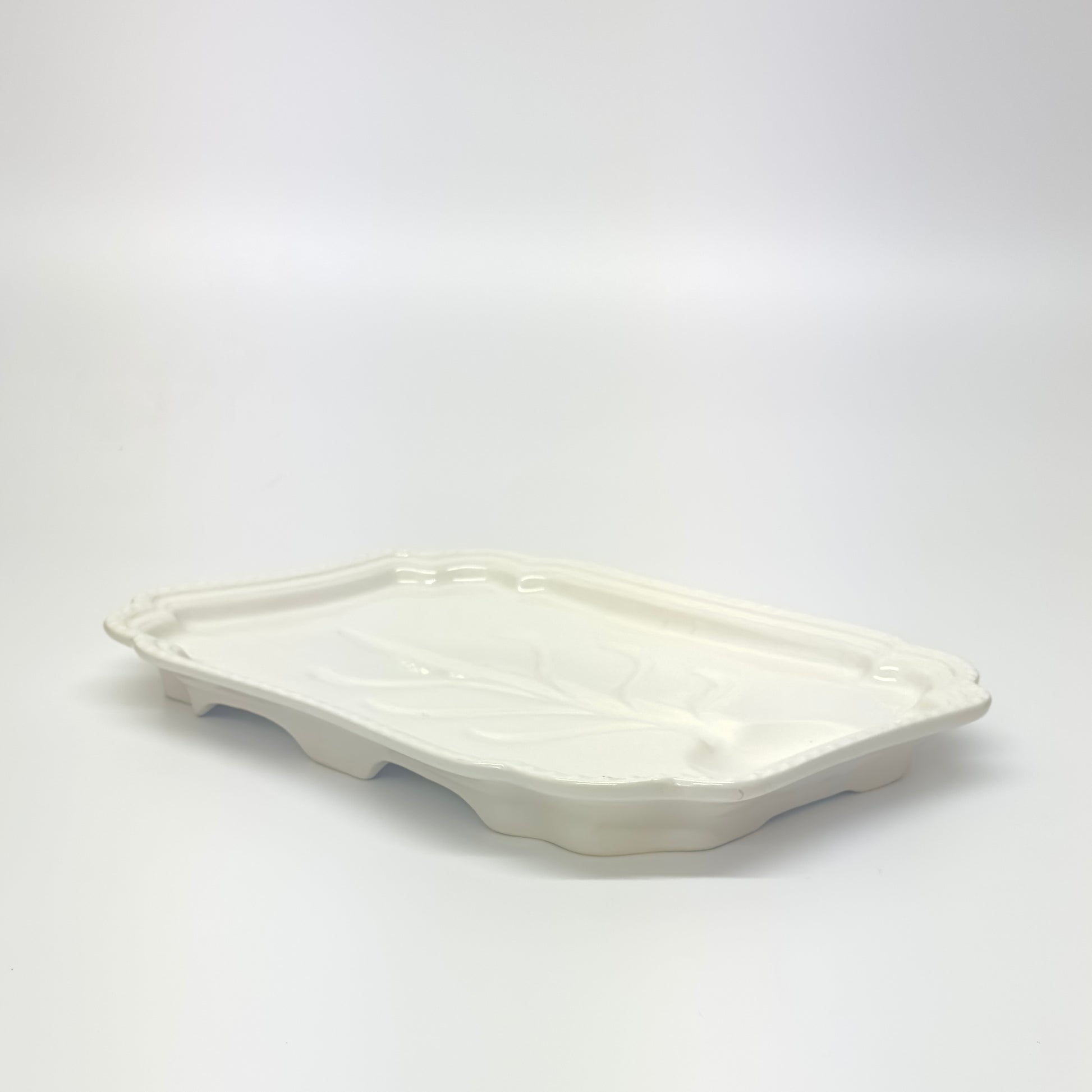 This is a gorgeous ceramic rectangular platter in a cream shade featuring a textured design along the edges and tree branches in teh center.