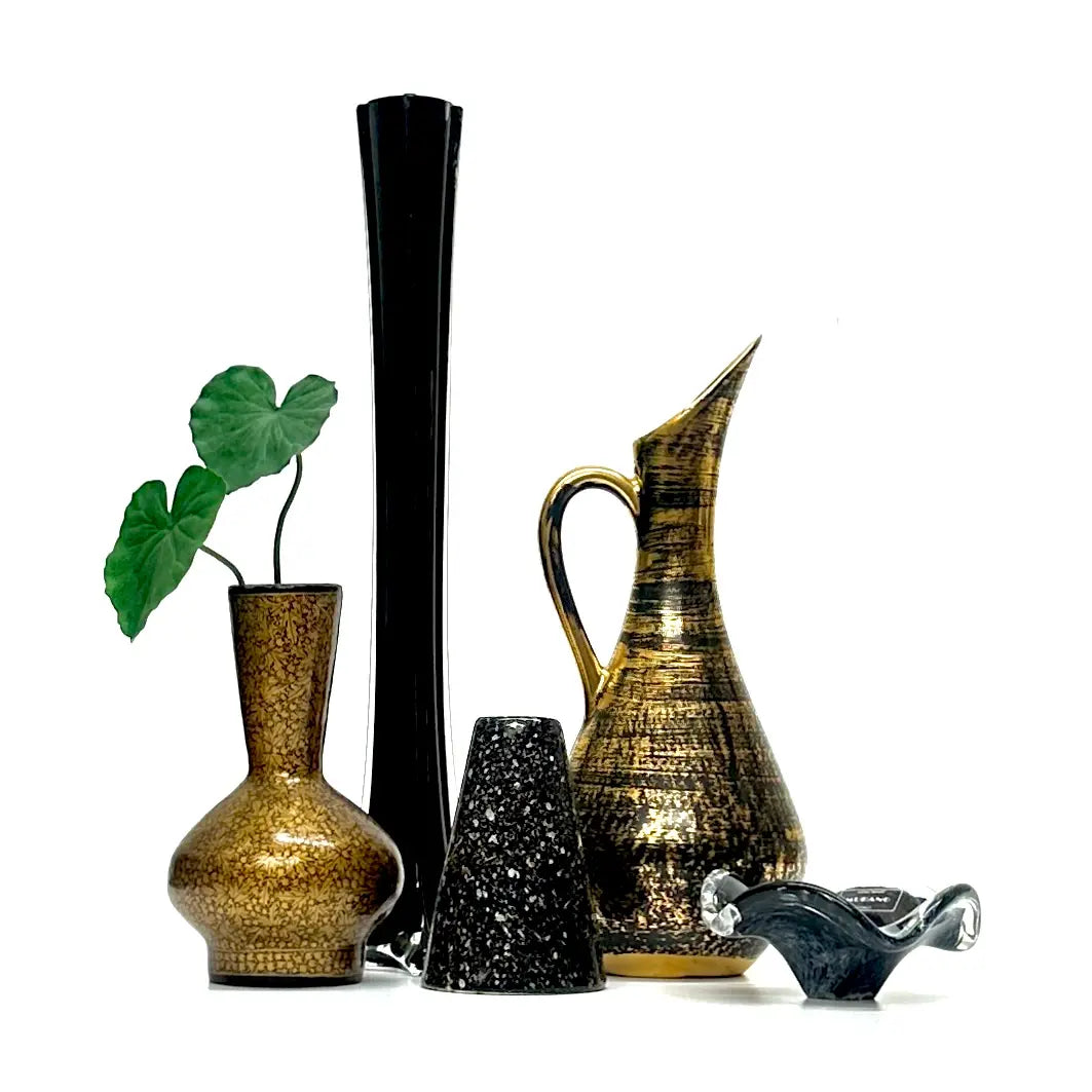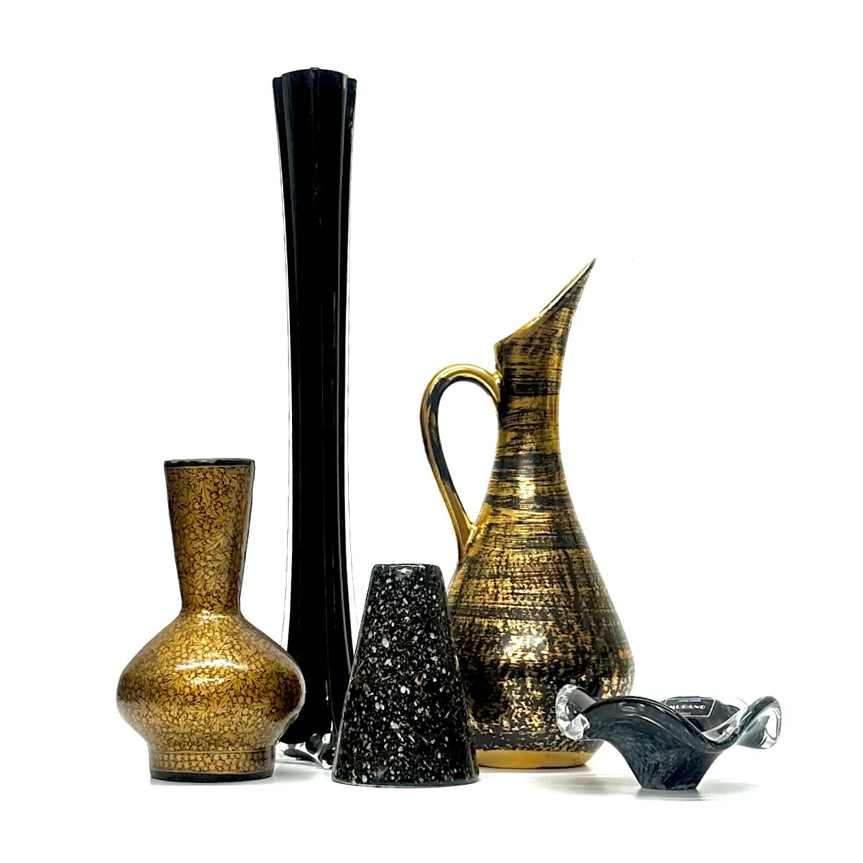 Beautiful mixed group of ceramic, glass, and metal vessels from the mid-20th century. Featuring pieces by Murano, Stangl, and more. In good vintage condition, the Murano piece has quite a few internal cracks.