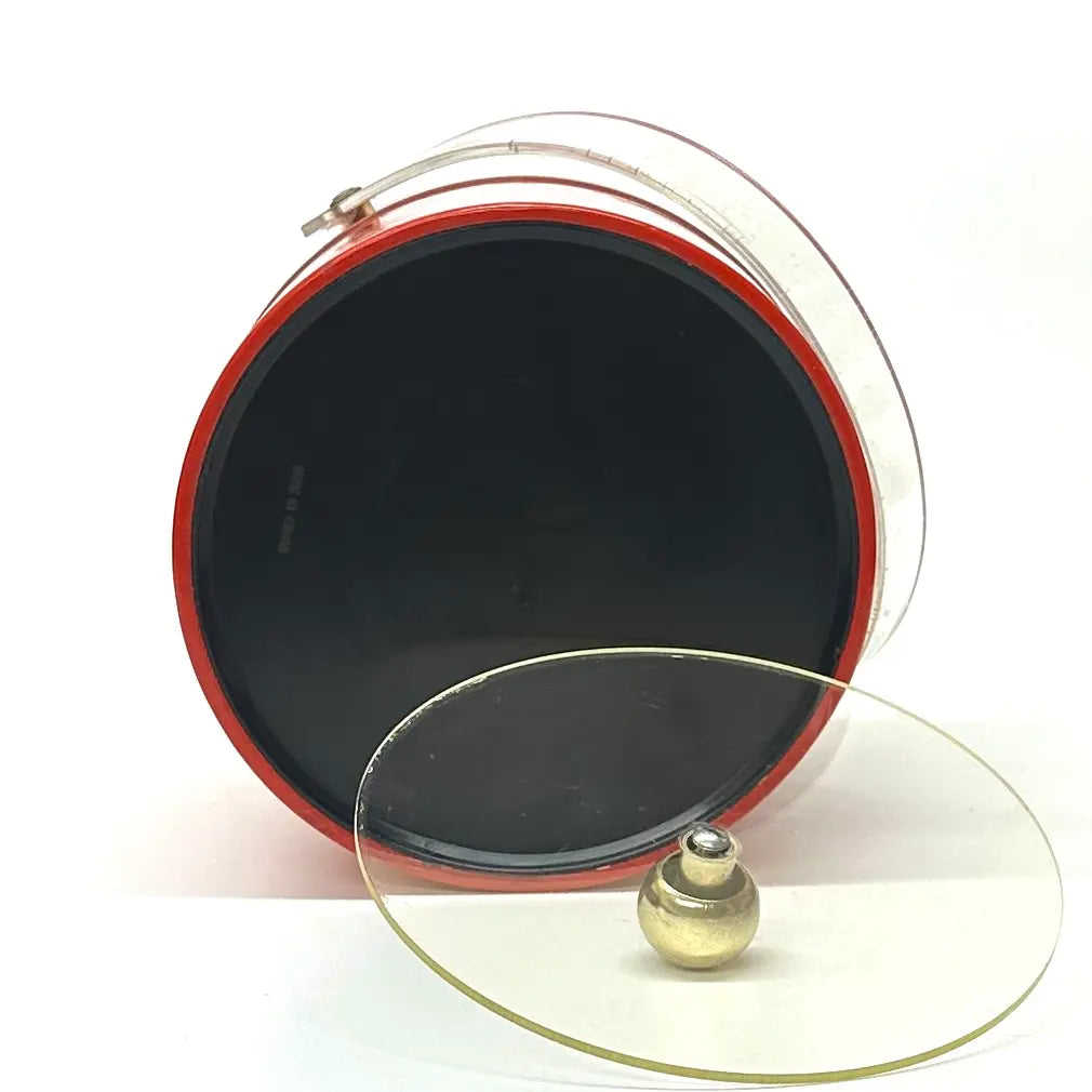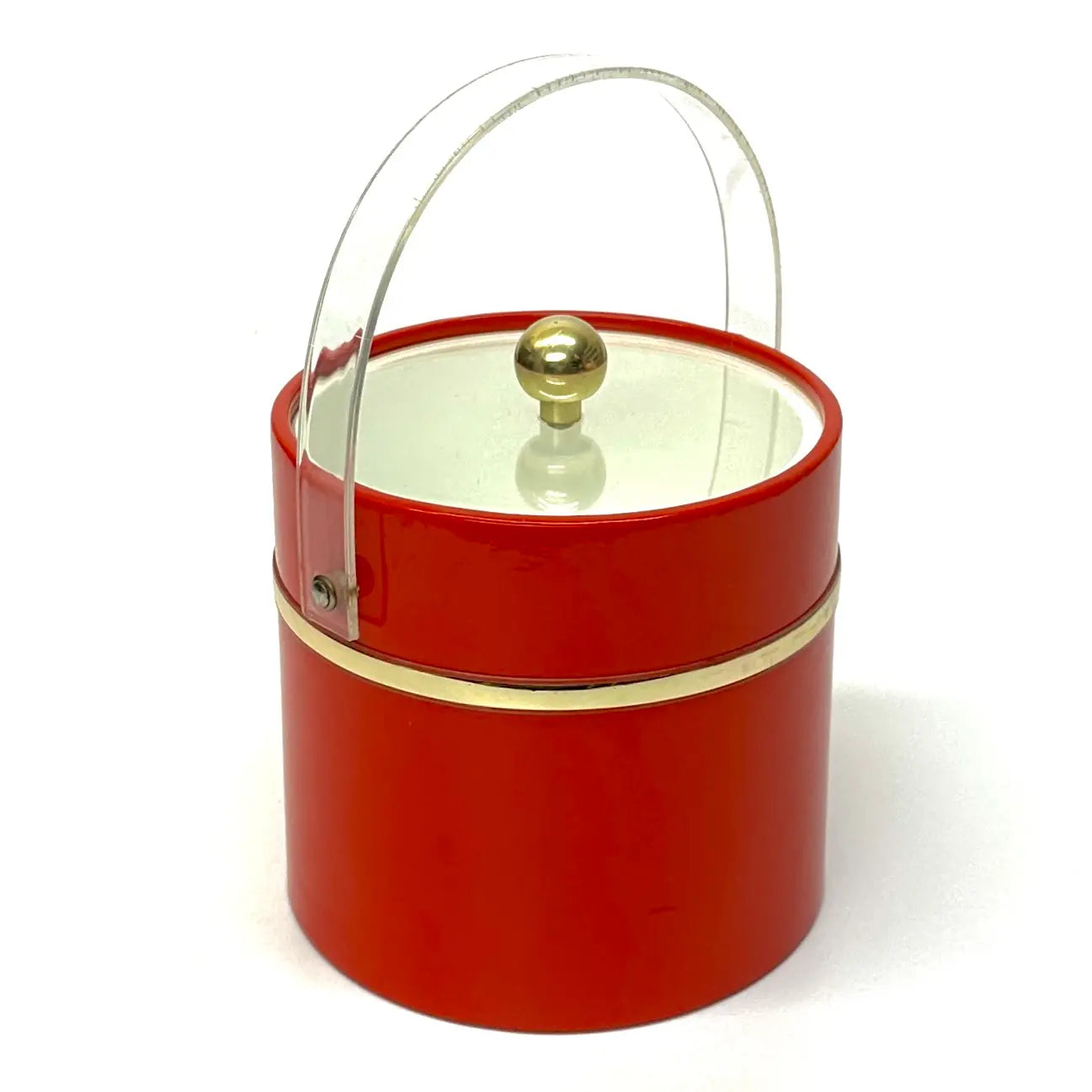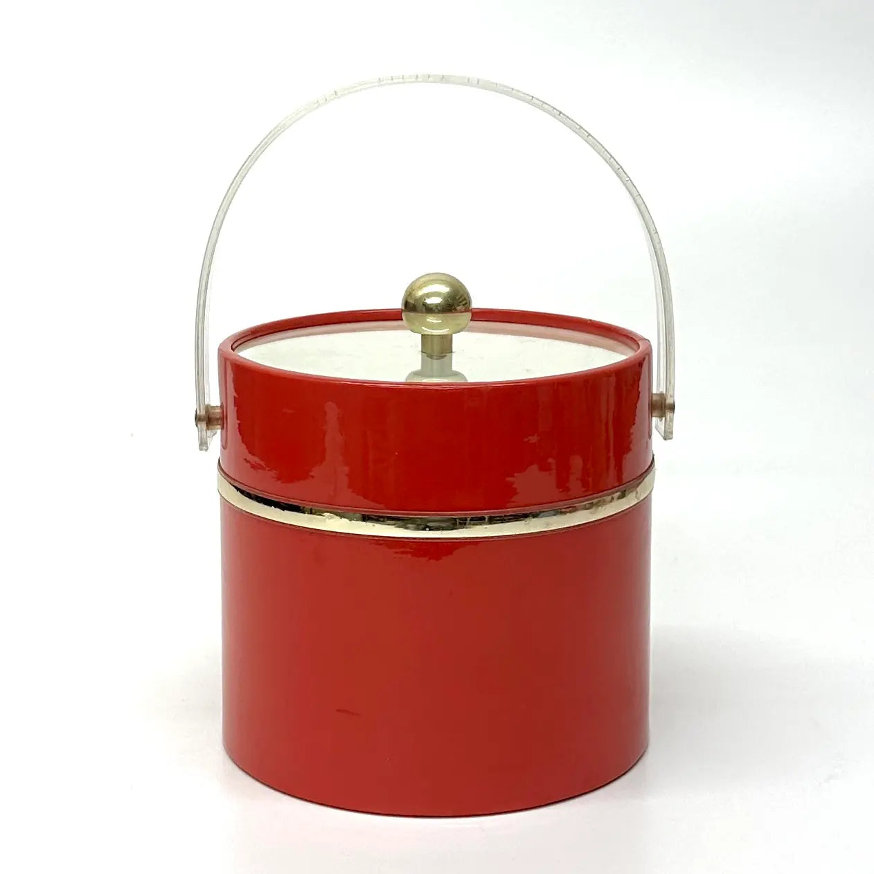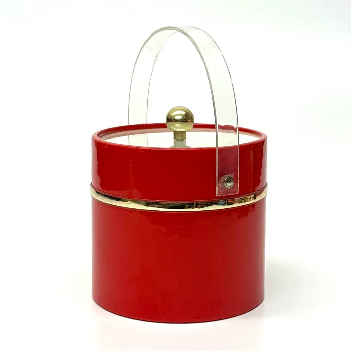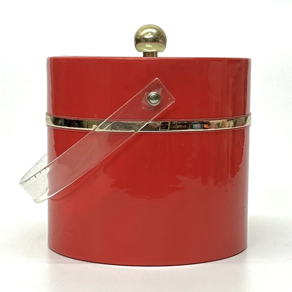 This is an eccentric fire truck-red vinyl ice bucket in a cylindrical shape with an acrylic transparent lid and handle, as well as gold detailing.