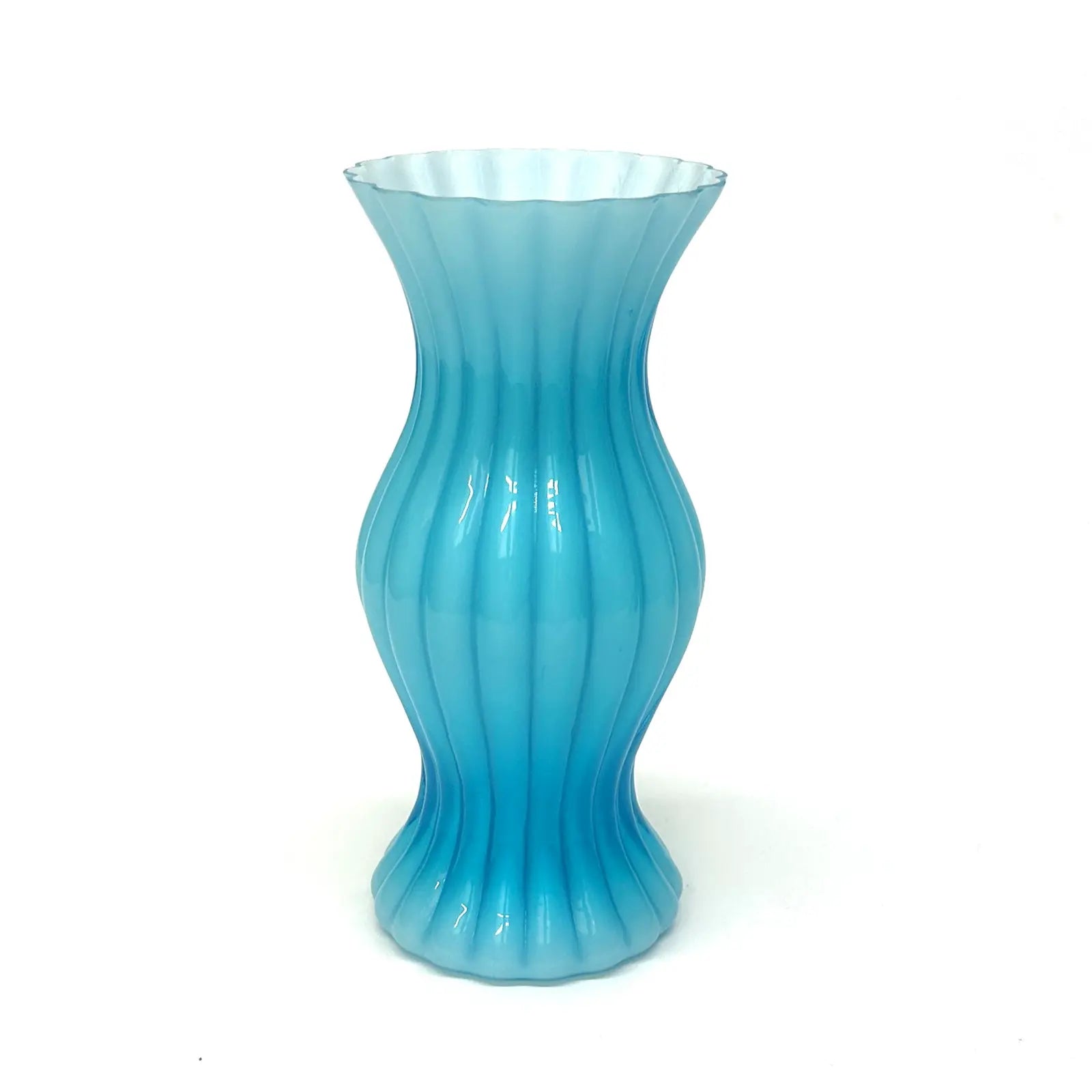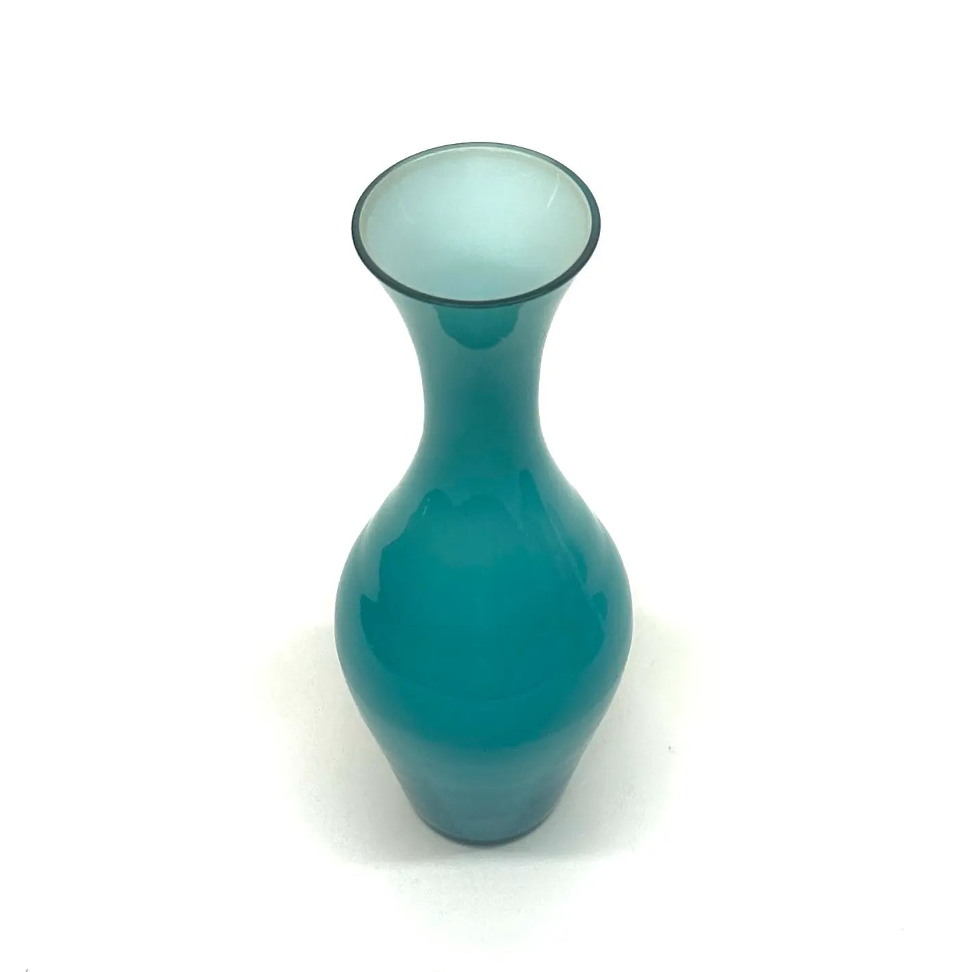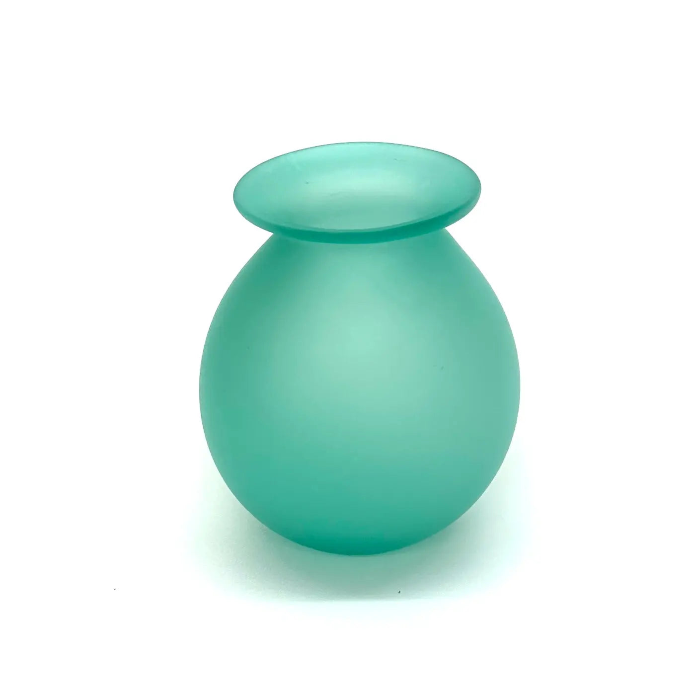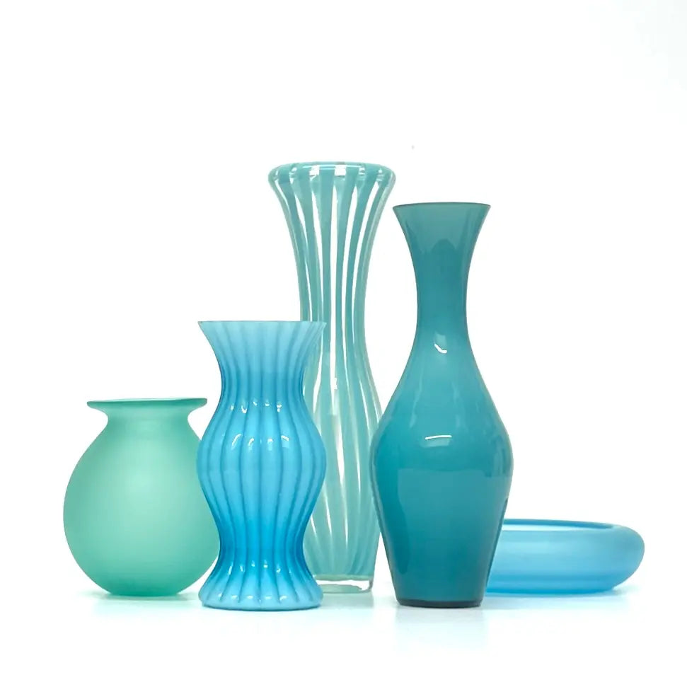 A beautiful group of aqua, jade, and turquoise glass vessels of assorted shapes, sizes, and textures. A stunning pop of color for your space.