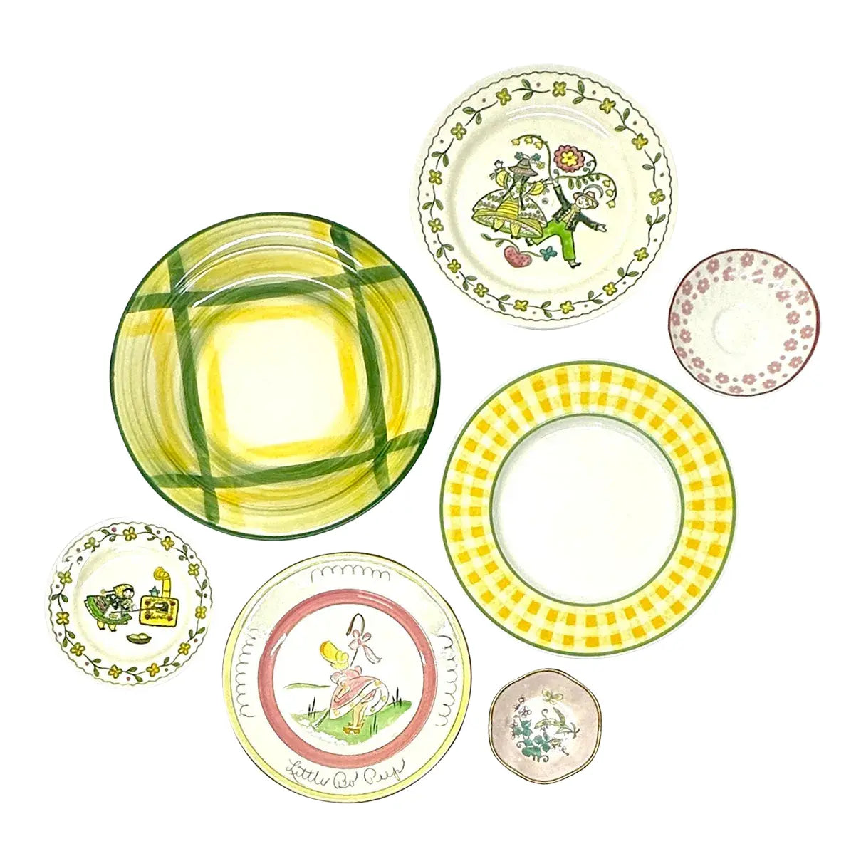 This is a vibrant set of decorative plates featuring a yellow, green, pink, and white colorway while having an overall whimsical storytime theme.