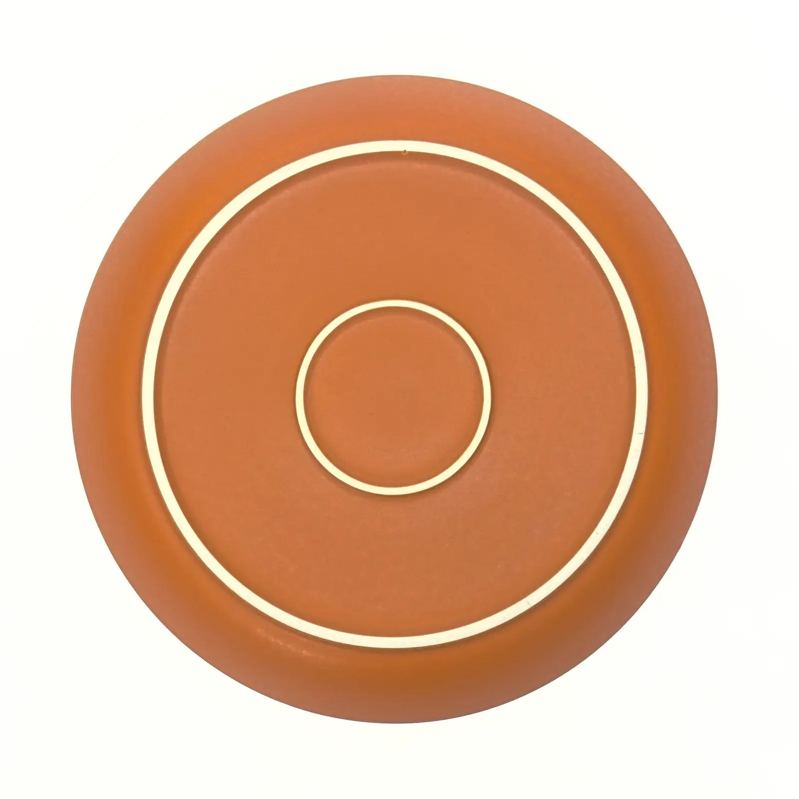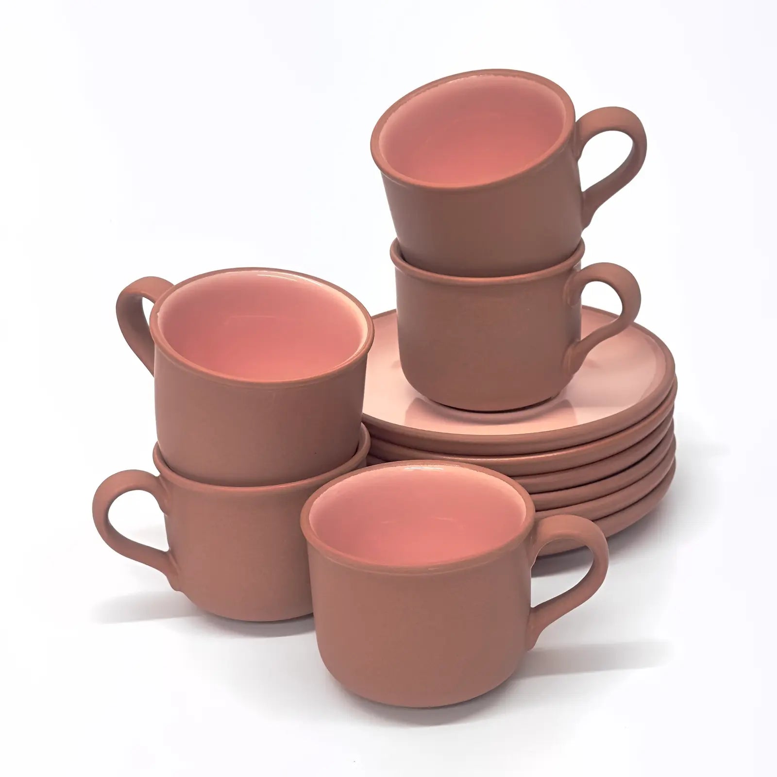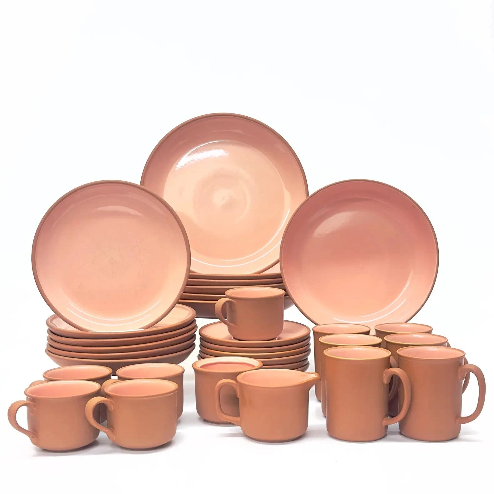 This is a vintage, gorgeous, glossy, and matte ceramic dinner set with a terracotta exterior and peachy pink glossy interior. It includes dinner plates (6), salad plates (6), a large serving bowl (1), saucers (6), espresso cups (6), coffee mugs (6), a sugar bowl (1), and a cream cup (1). In excellent vintage condition, with some scratching from general wear.