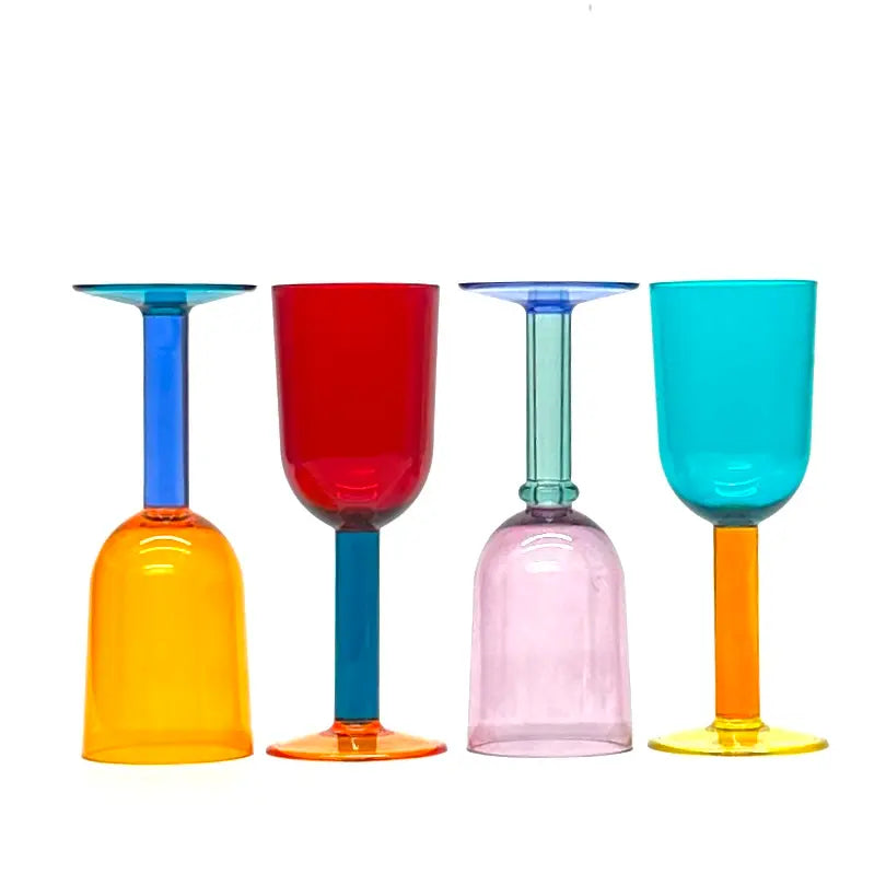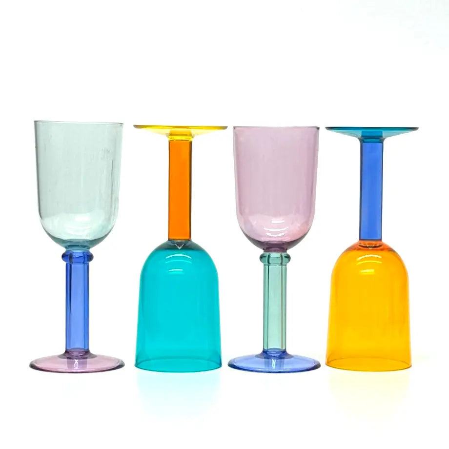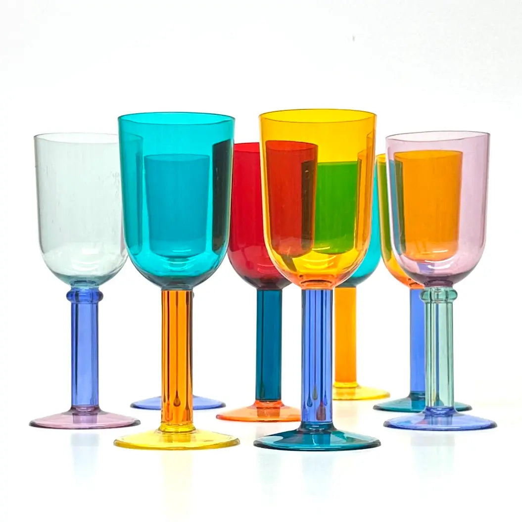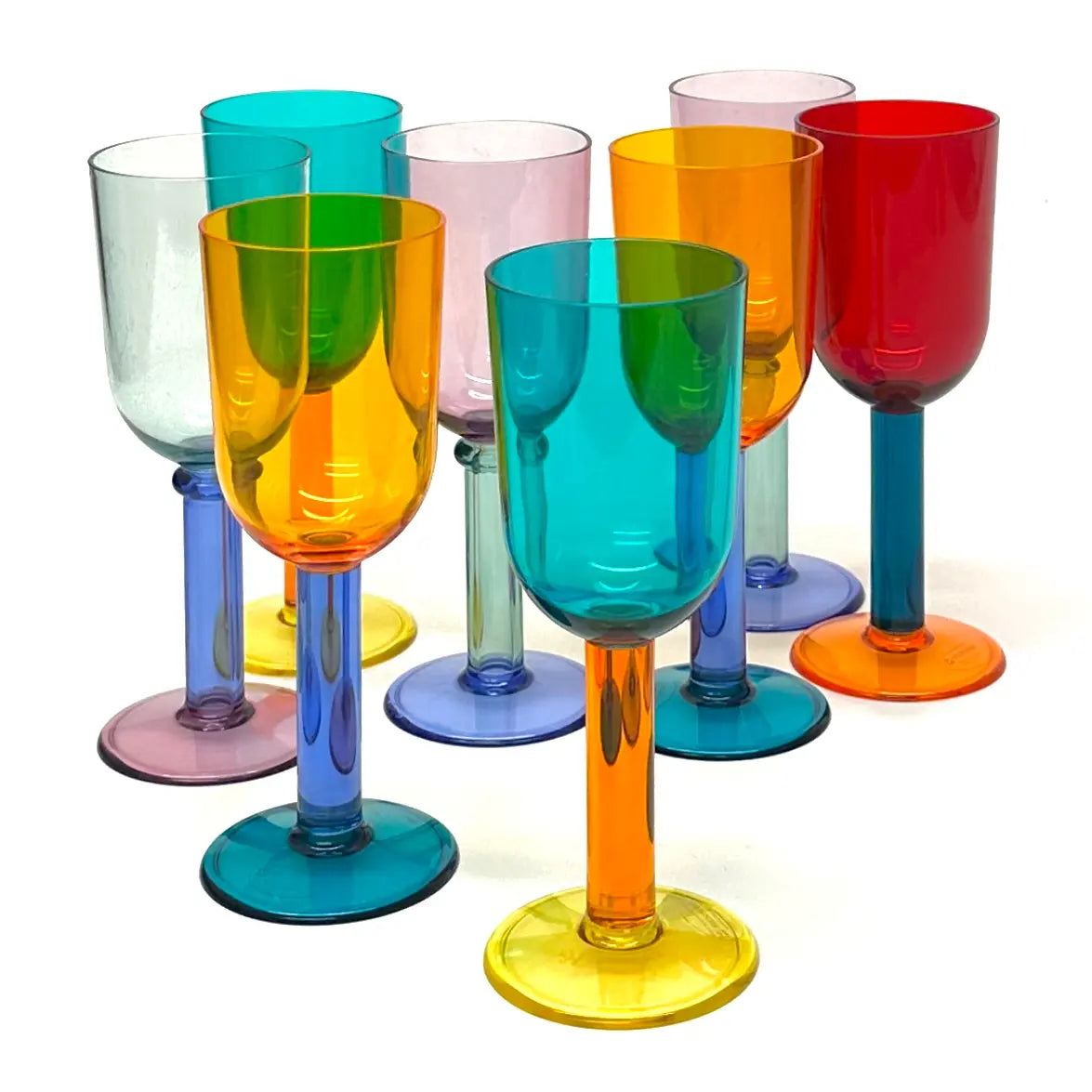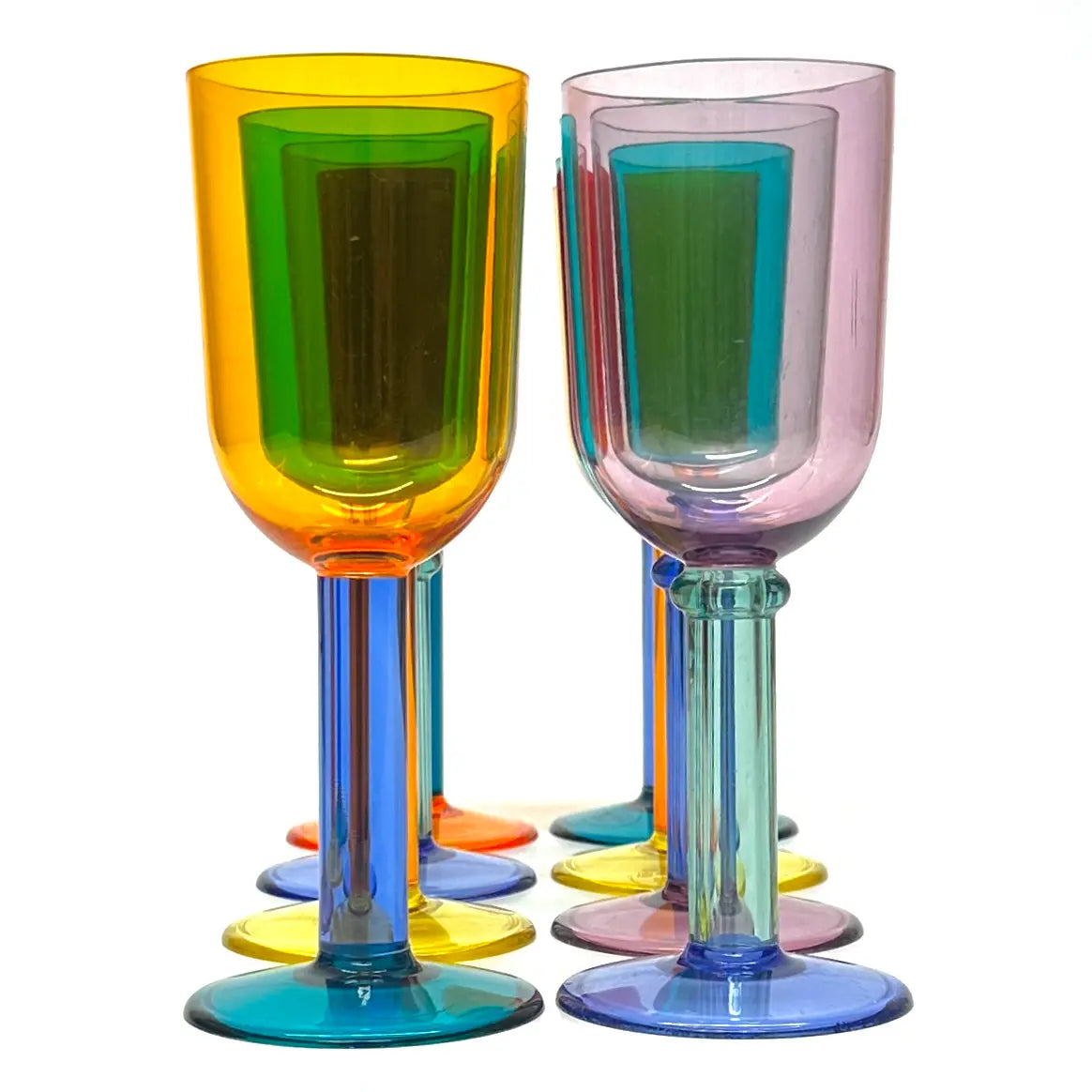 An eccentric multicolored set of 1980s PrecisionCraft TriColor acrylic wine goblets, this set features a variety of greens, blues, yellows, purples, and red.