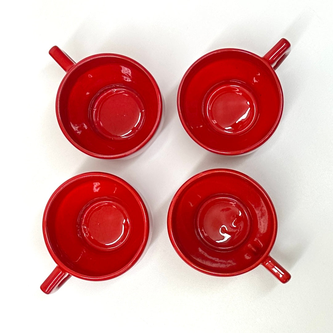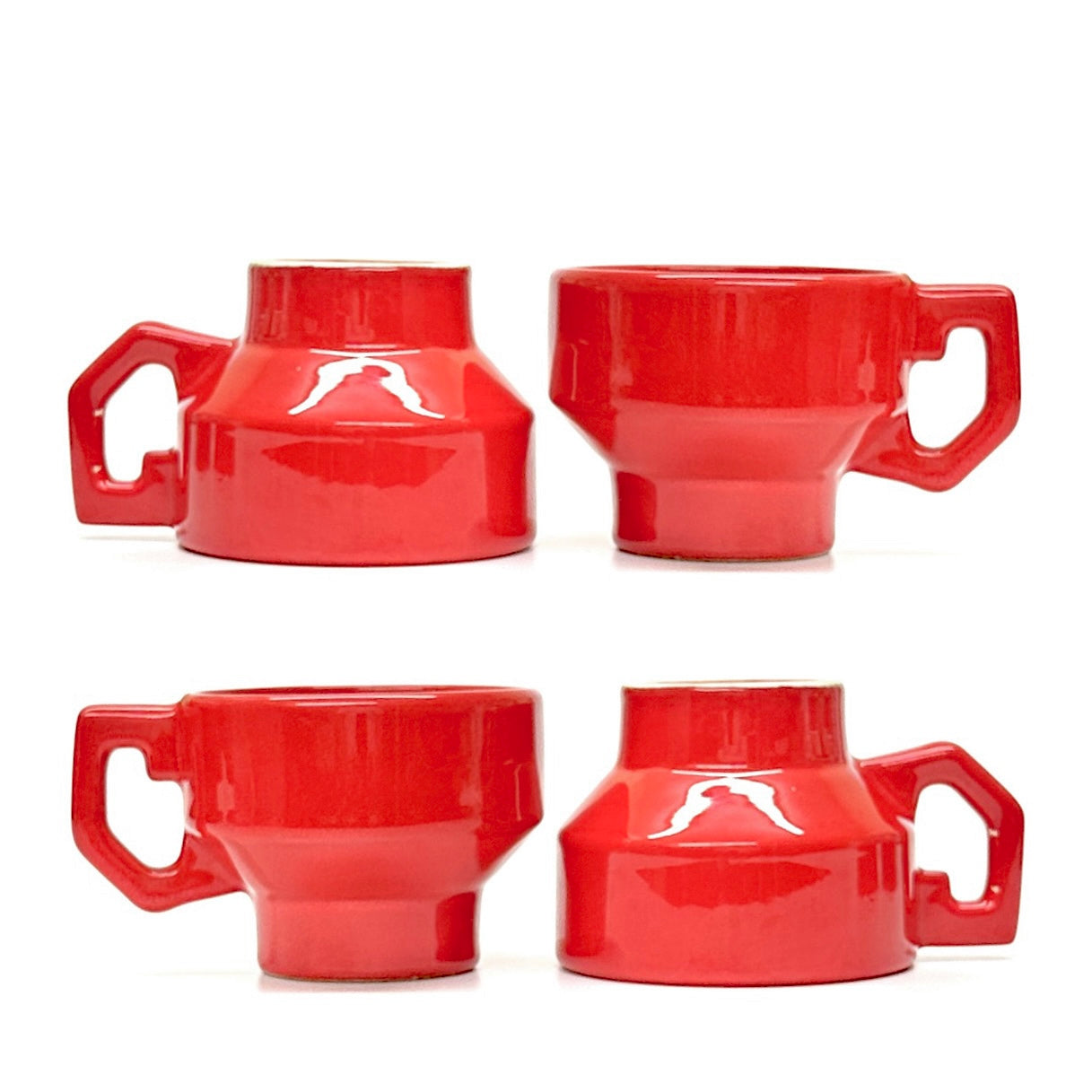This vibrant and rare set of fire-engine red, high-gloss ceramic mugs brings a bold pop of color to any kitchen. Designed with a mid-century Japanese modernist influence, the mugs feature a striking geometric handle for a stylish yet functional look.