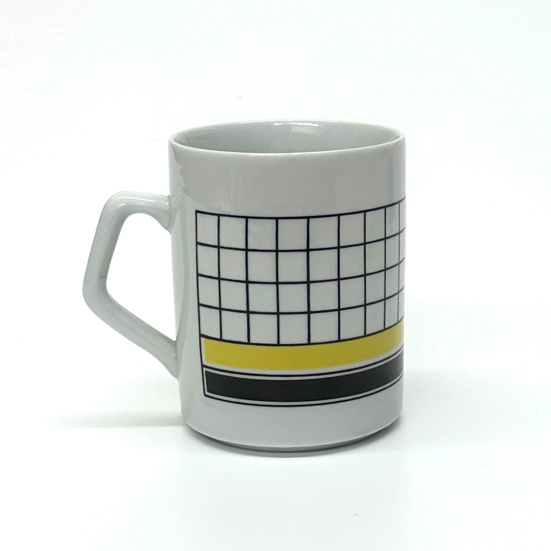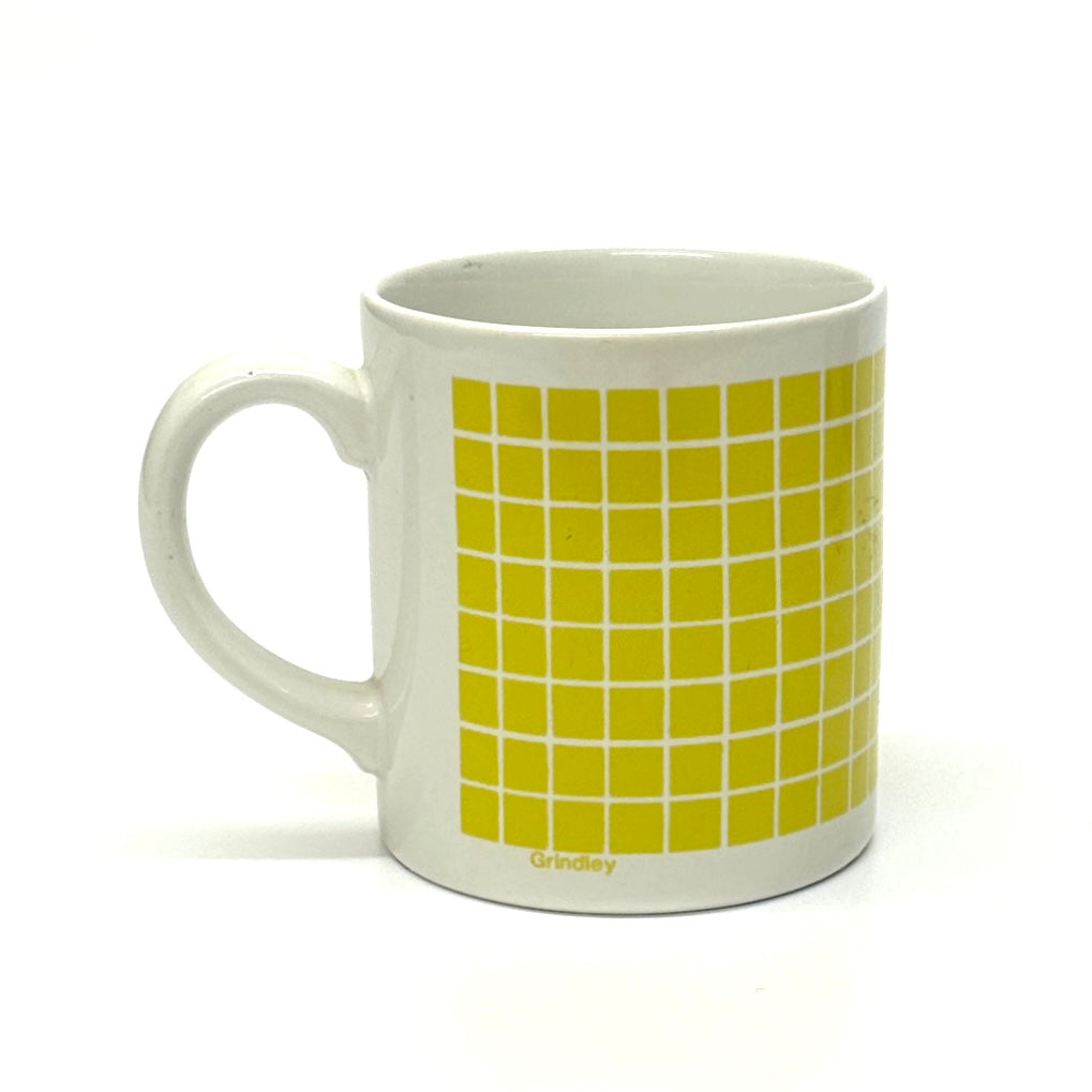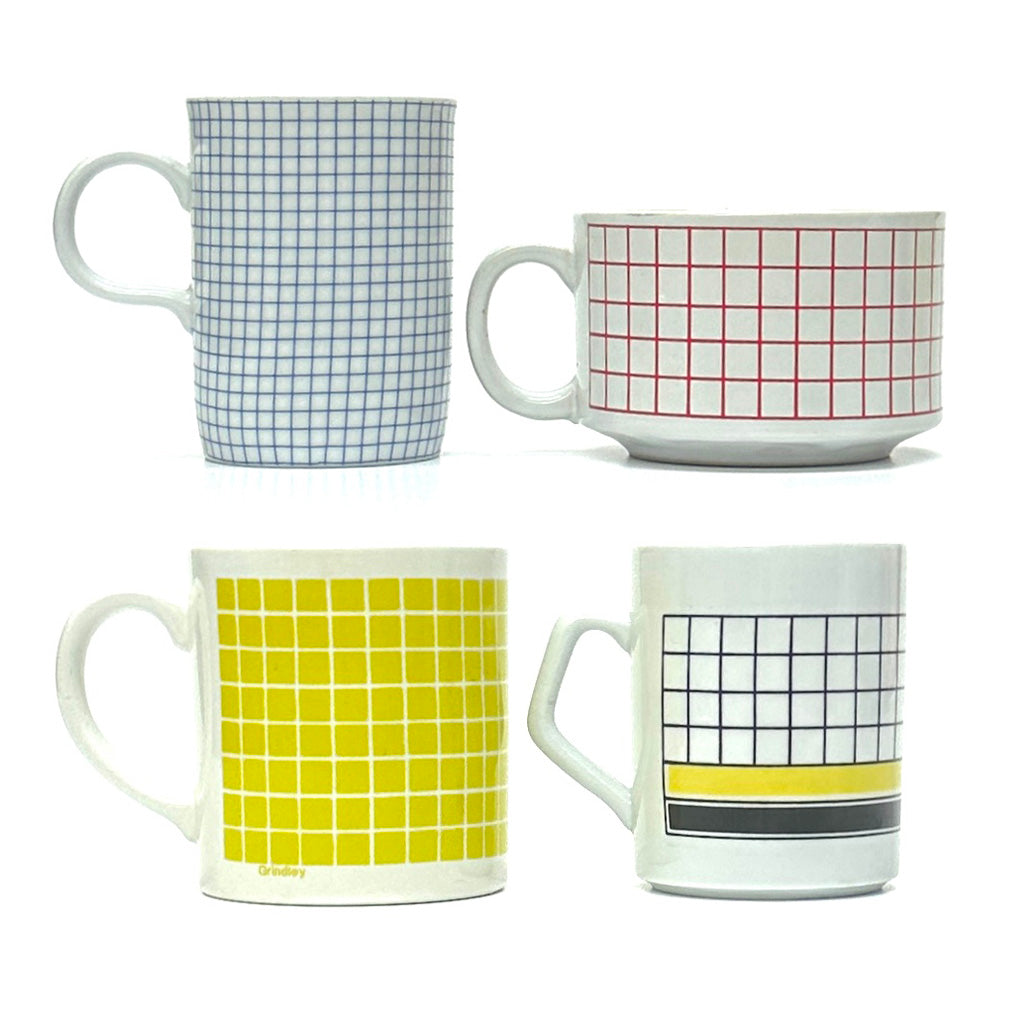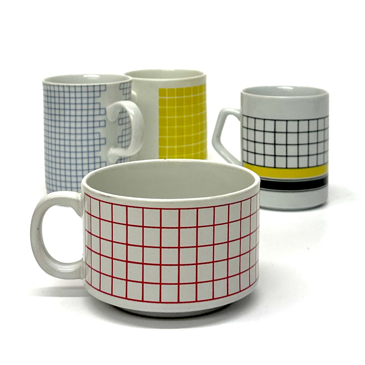 An eclectic set of vintage ceramic mugs with assorted multicolored grid patterns. The set includes a piece by Sigma and Grindley, as well as pieces made in Hungary and Japan. Each mug features a crisp white base with playful navy, red, and yellow details.