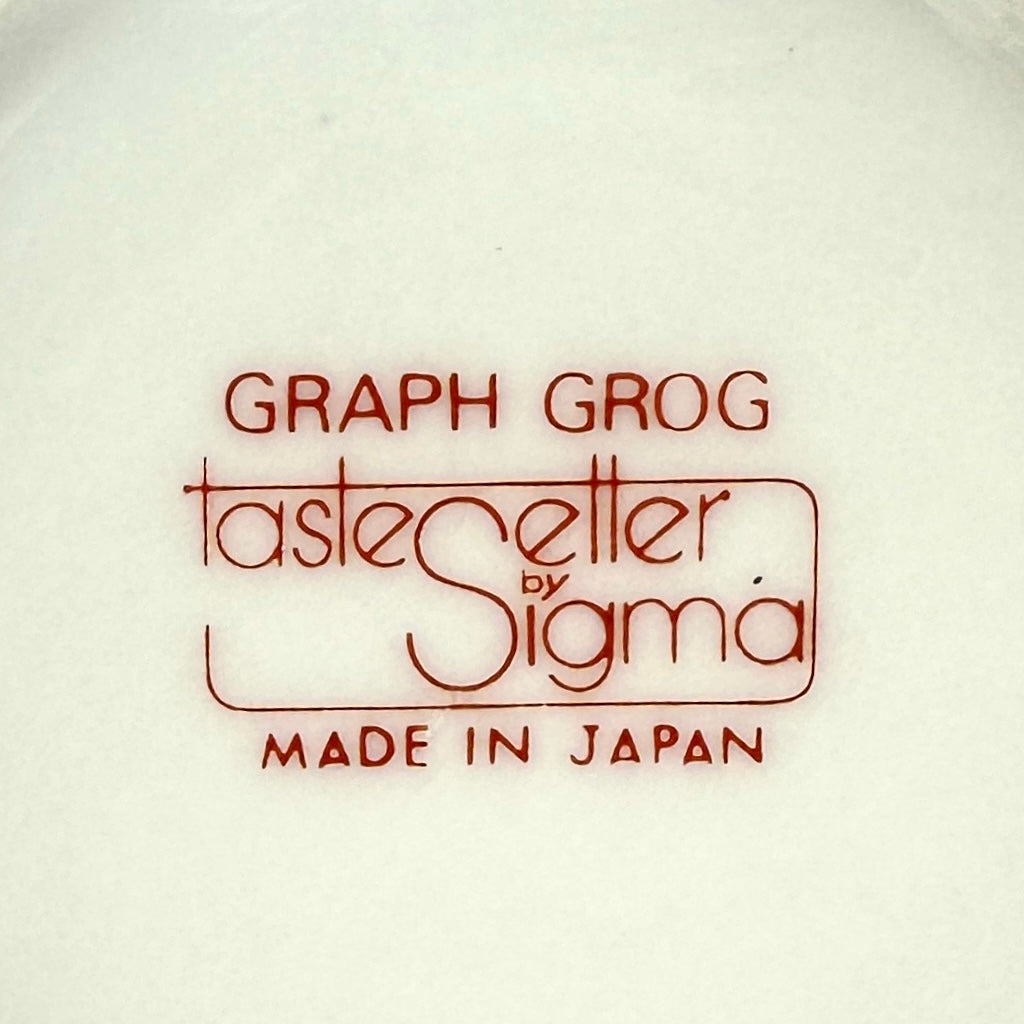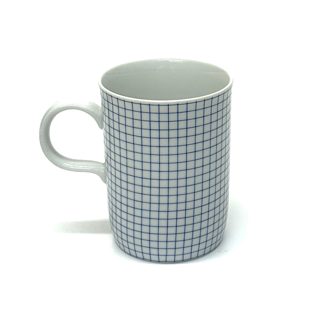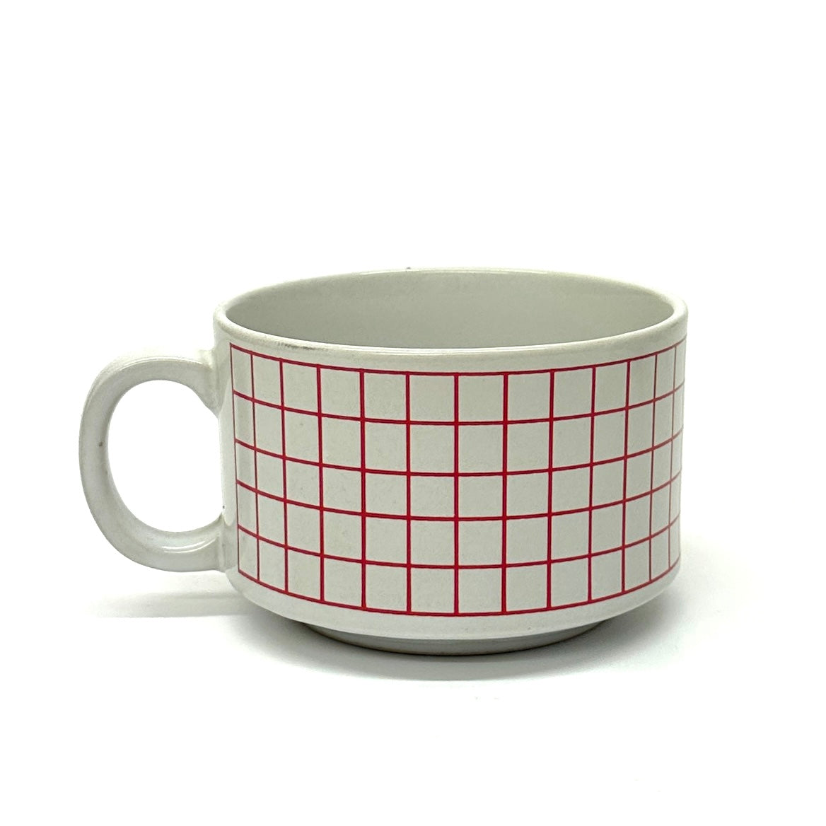 An eclectic set of vintage ceramic mugs with assorted multicolored grid patterns. The set includes a piece by Sigma and Grindley, as well as pieces made in Hungary and Japan. Each mug features a crisp white base with playful navy, red, and yellow details.