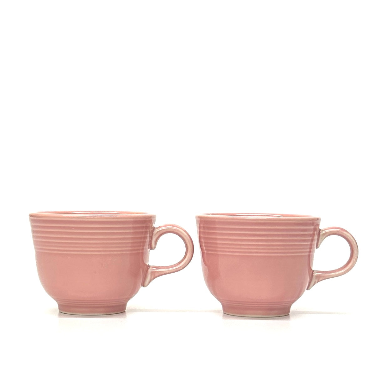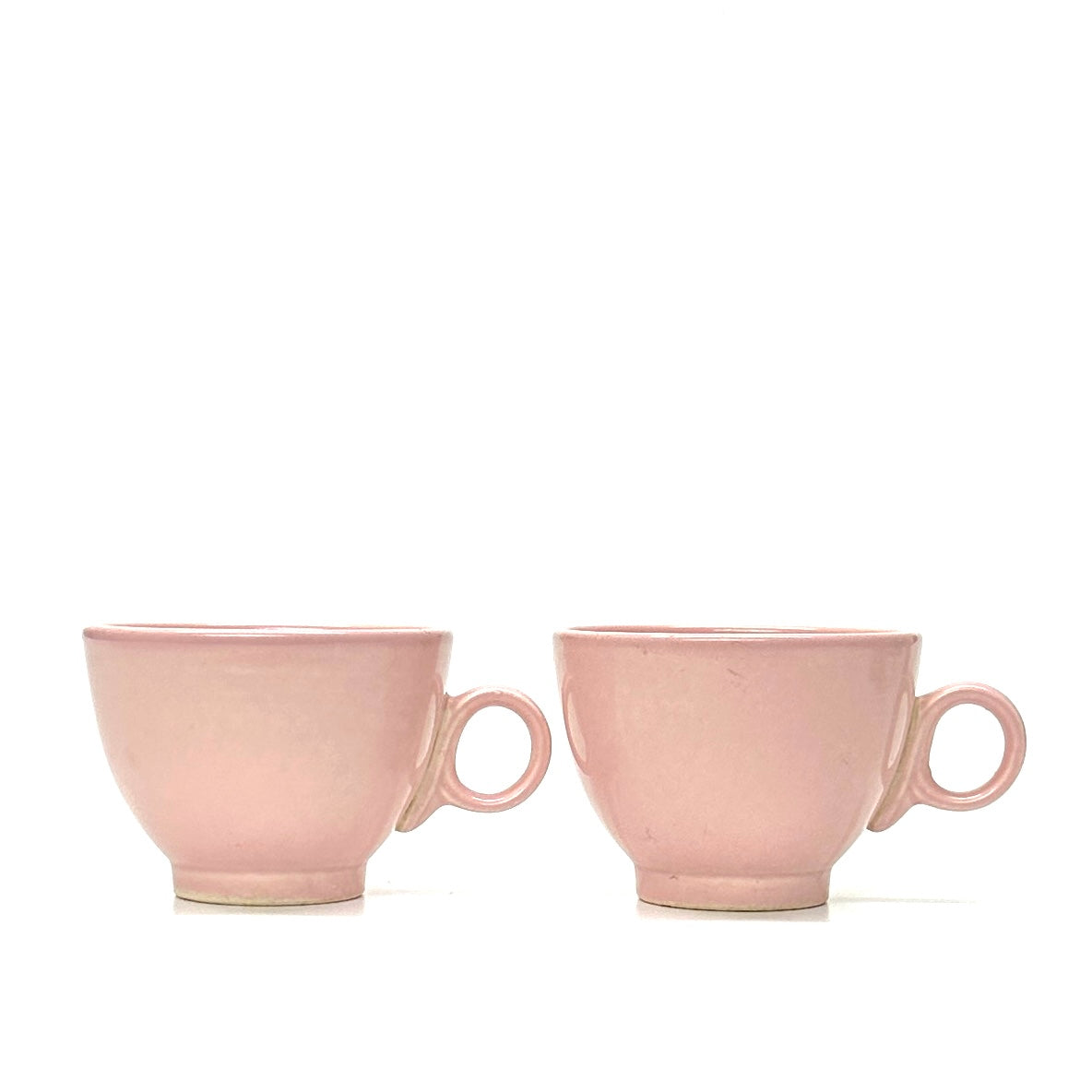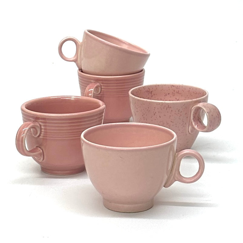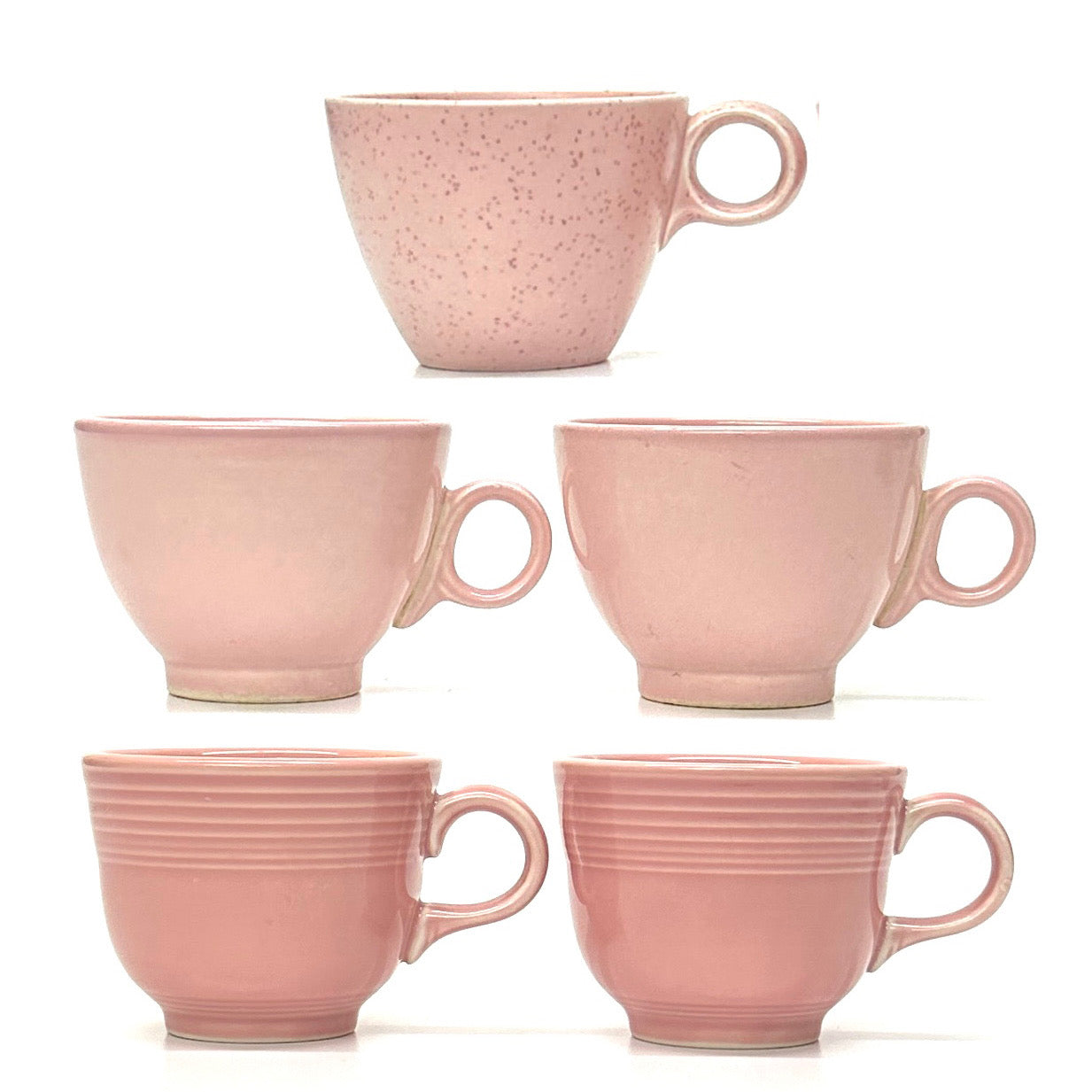 This is a delicate group of assorted light blush pink ceramic teacups. Featuring Fiestaware Classic Tea cups in the color "Rose" and Tickled Pink Flat Coffee Cup by Metlox.