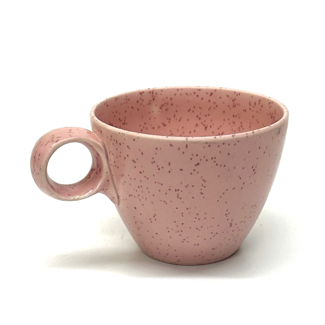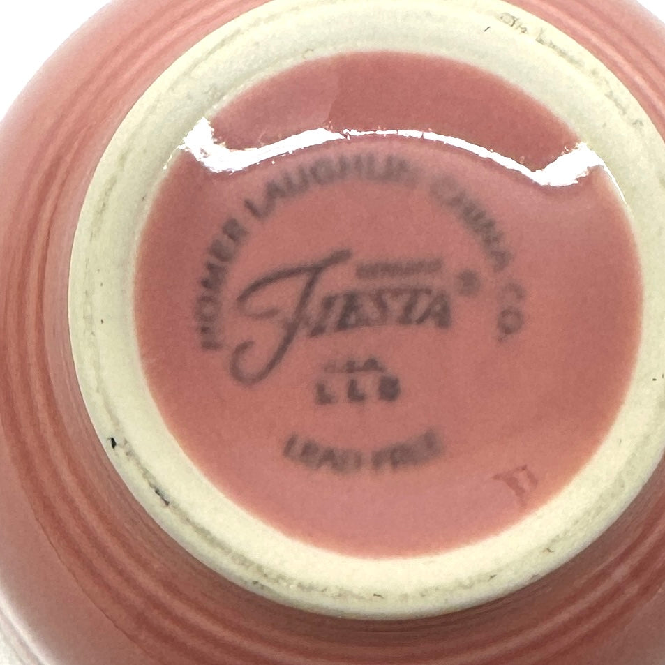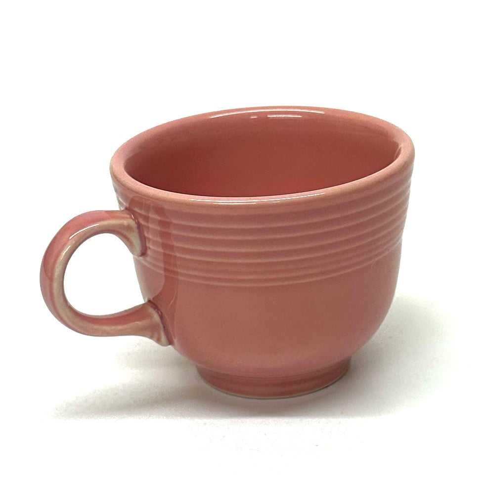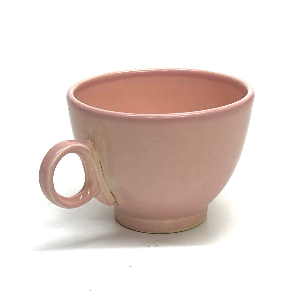This is a delicate group of assorted light blush pink ceramic teacups. Featuring Fiestaware Classic Tea cups in the color "Rose" and Tickled Pink Flat Coffee Cup by Metlox.