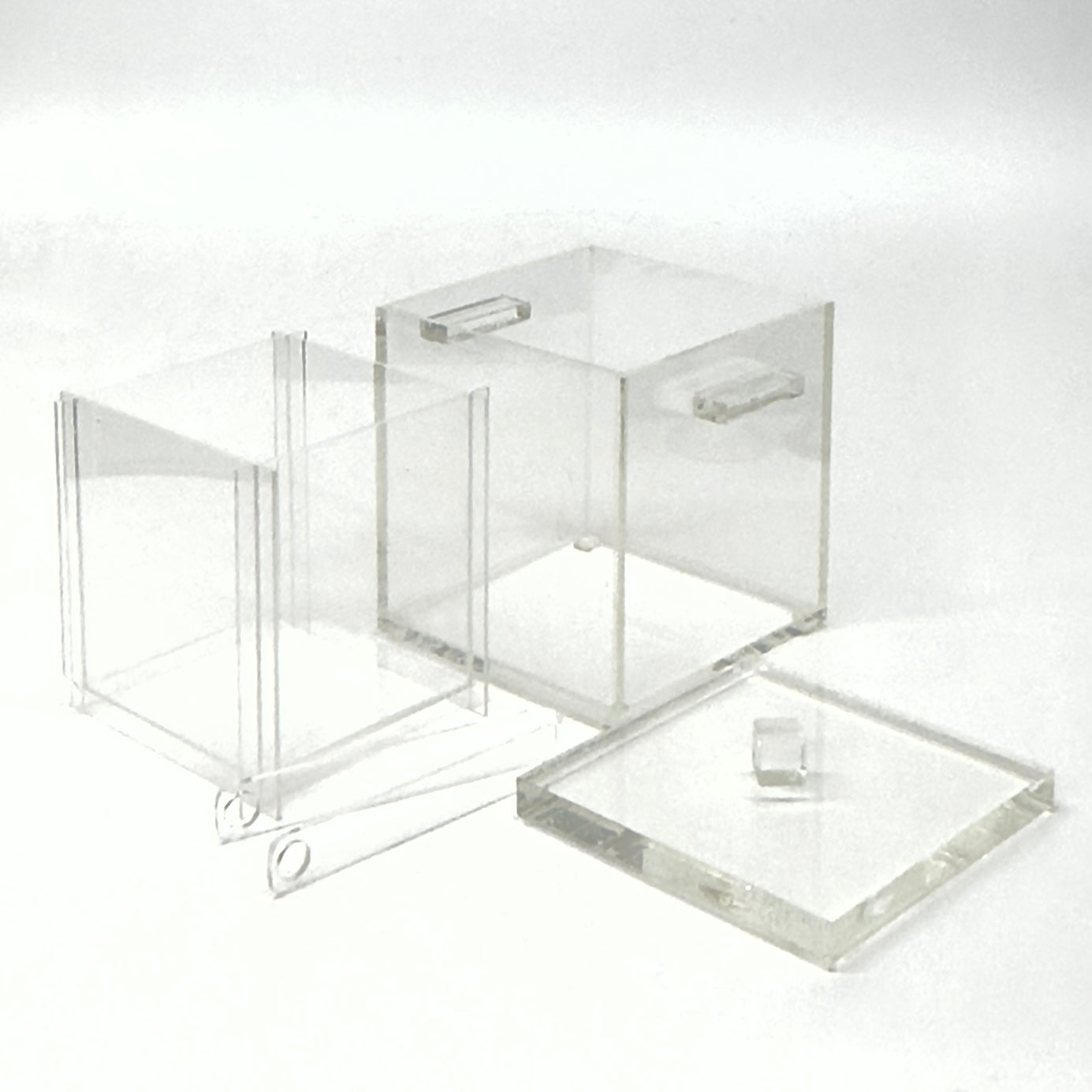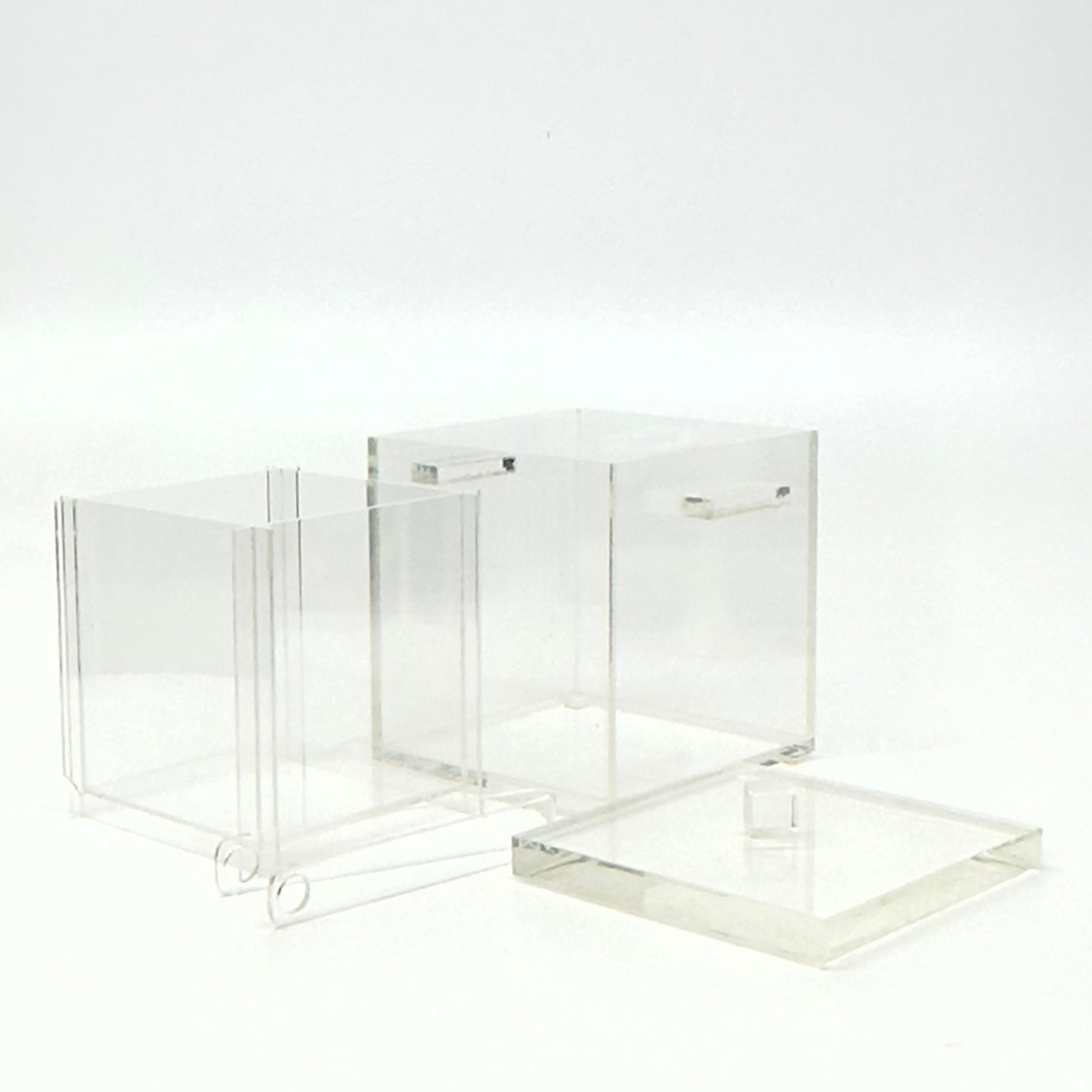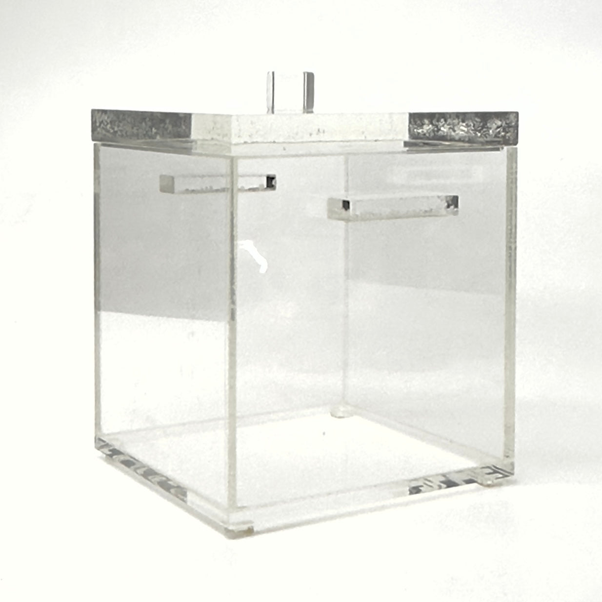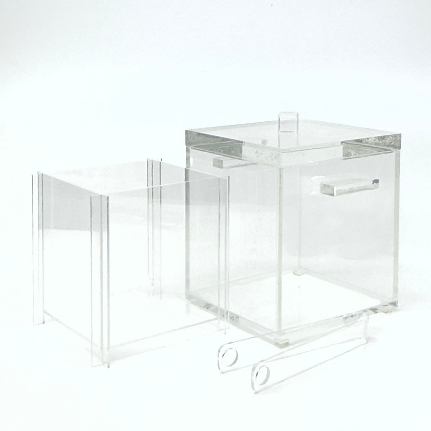 This beautiful mid-century cube-shaped lidded ice bucket is crafted from thick, transparent lucite and features side handles. It includes a matching lid, tongs, and liner.