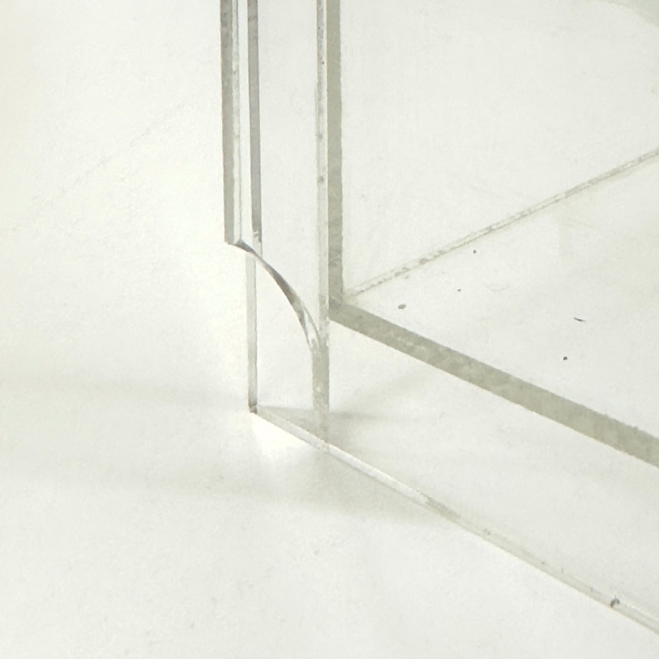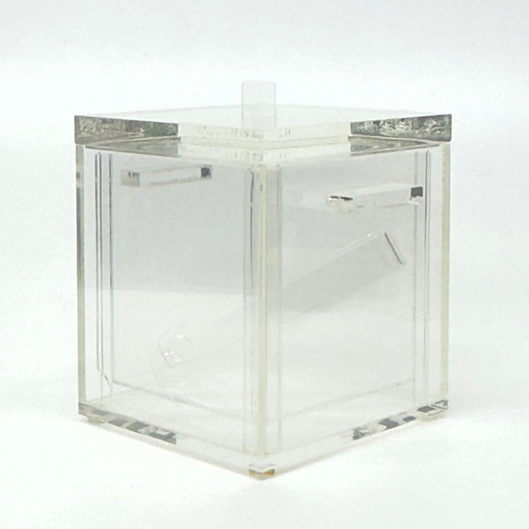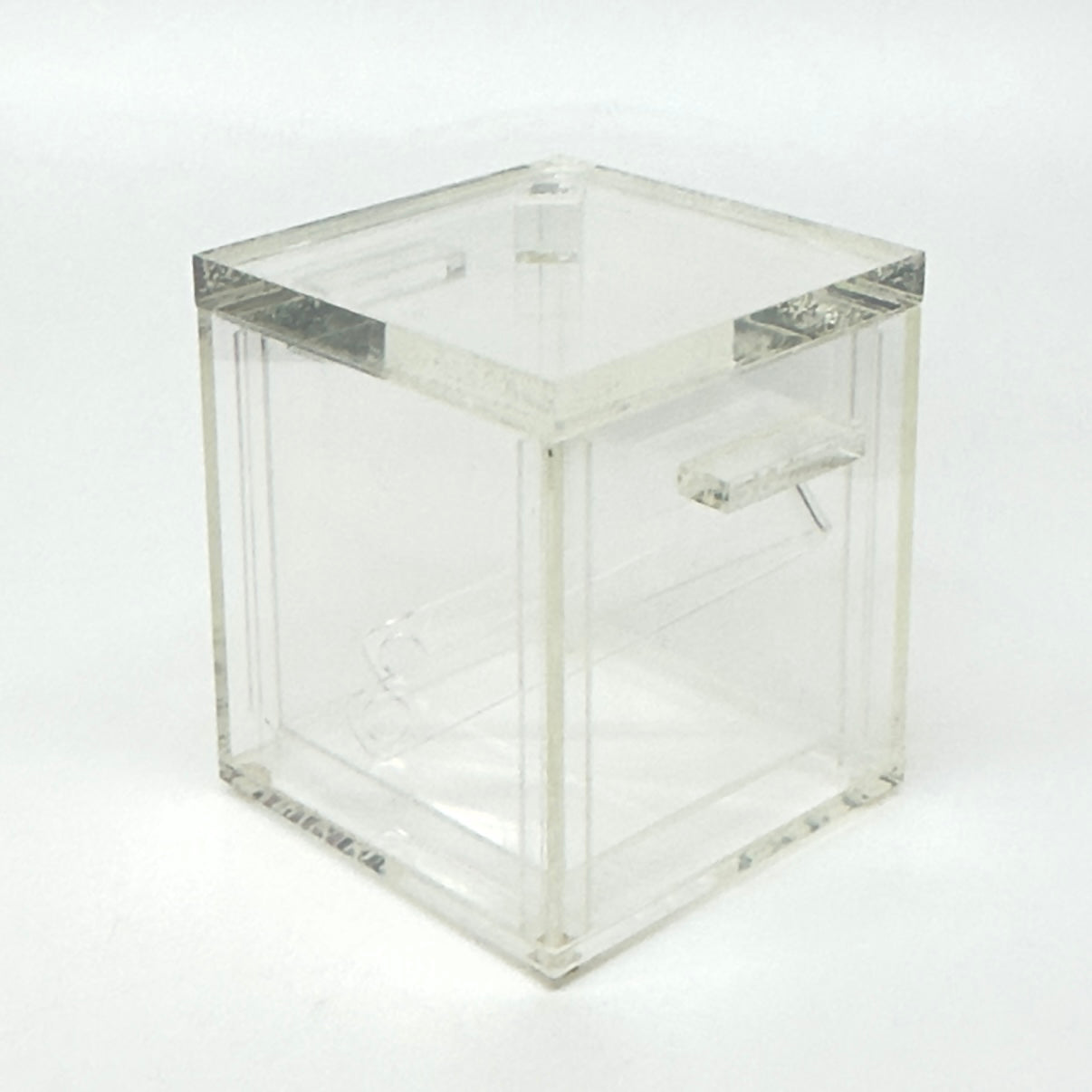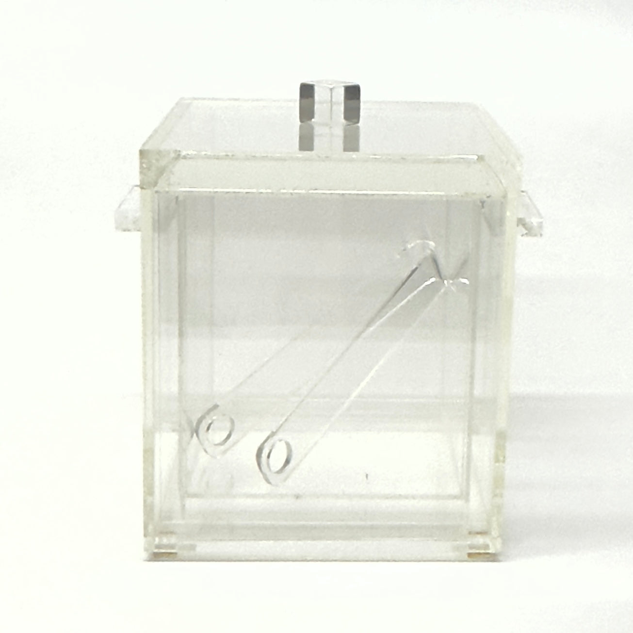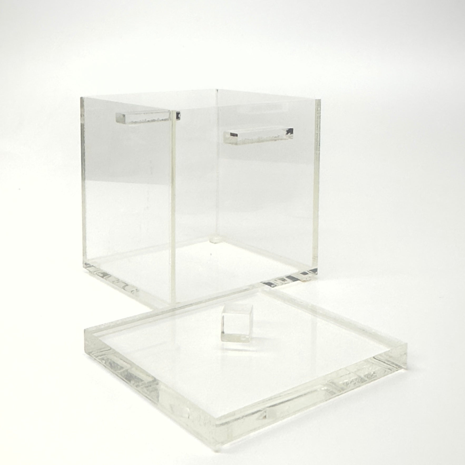 This beautiful mid-century cube-shaped lidded ice bucket is crafted from thick, transparent lucite and features side handles. It includes a matching lid, tongs, and liner.