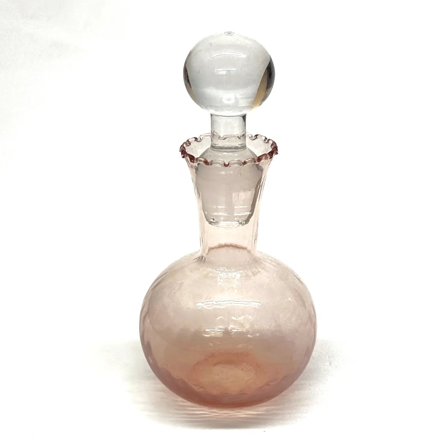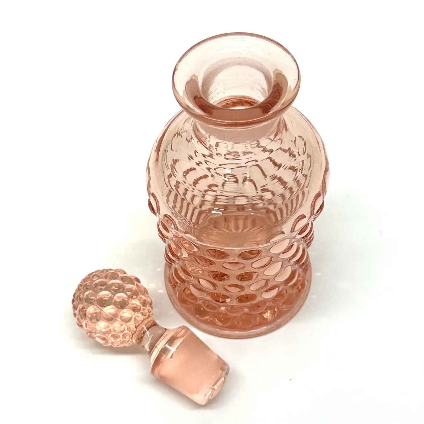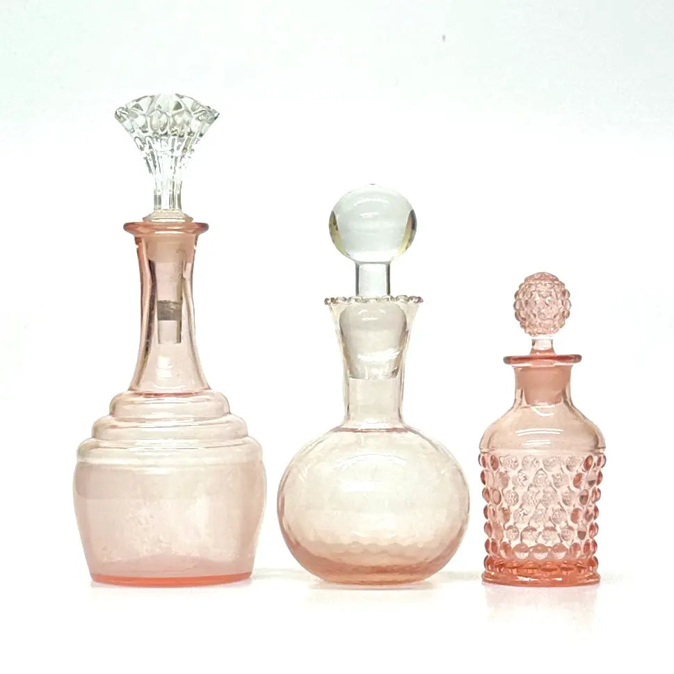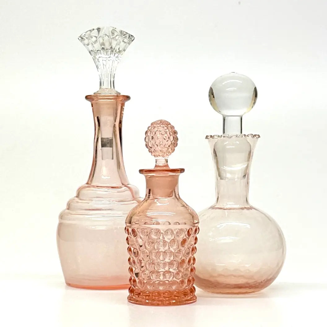 A delicate group of blush pink and clear perfume bottles with stoppers in a variety of patterns, shapes, and sizes.