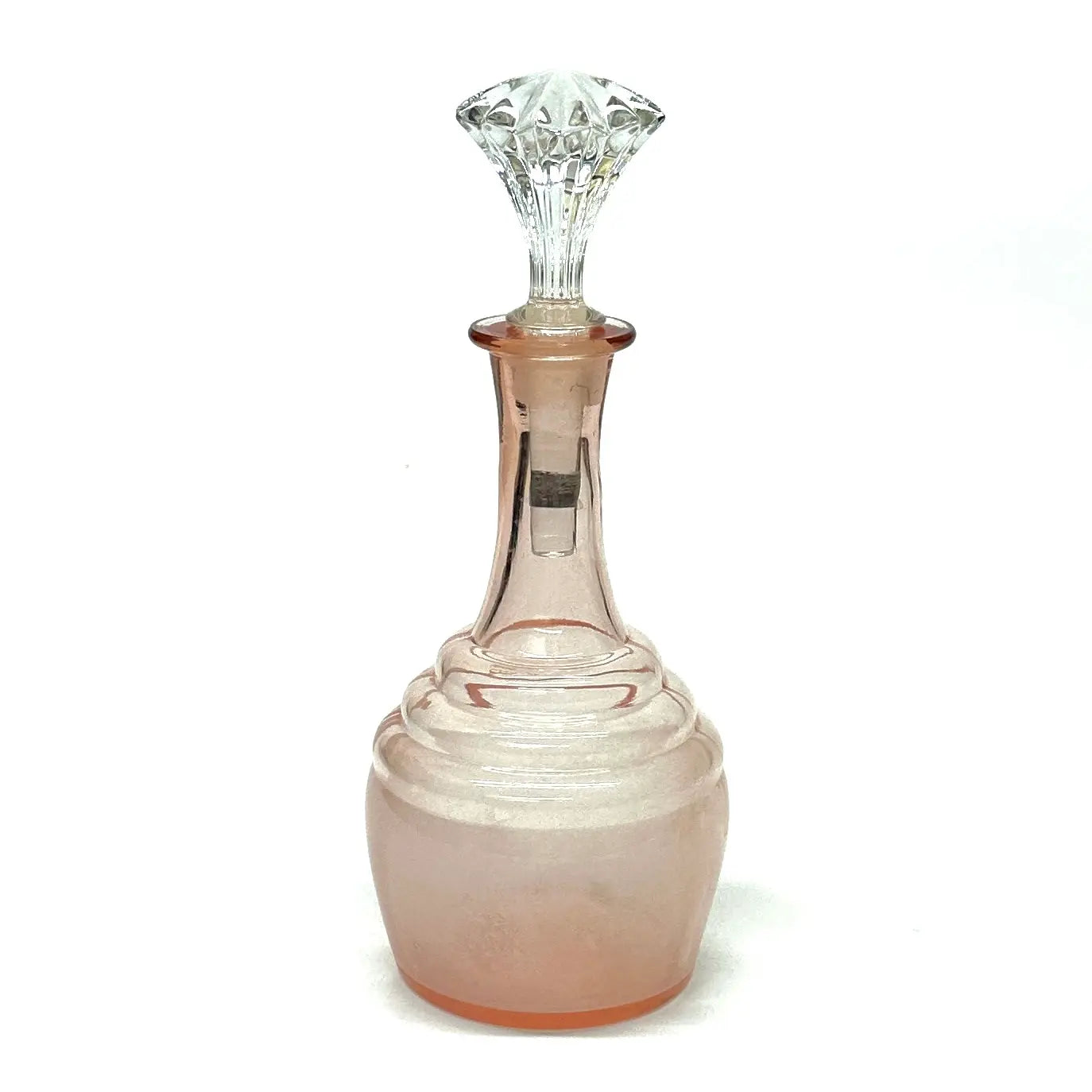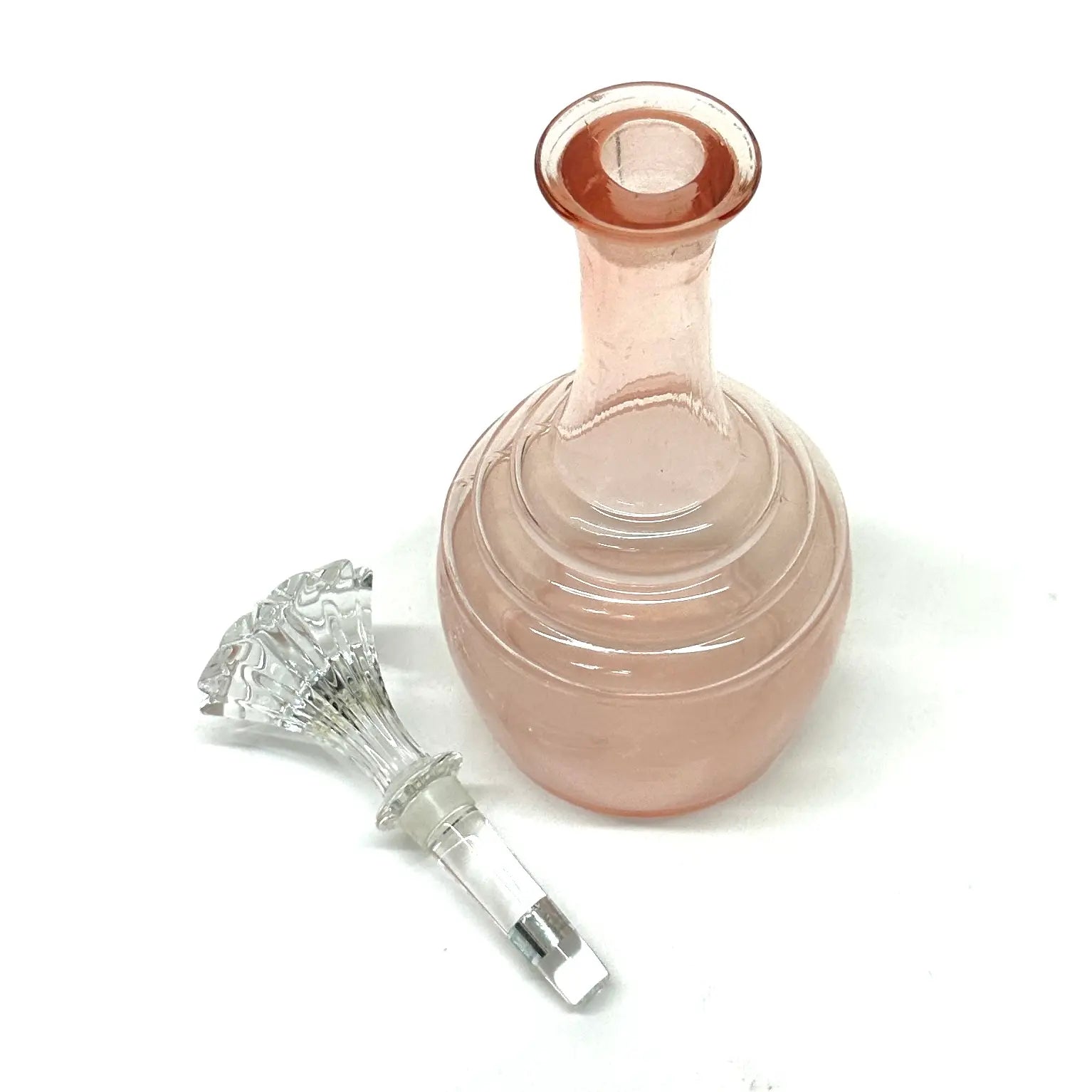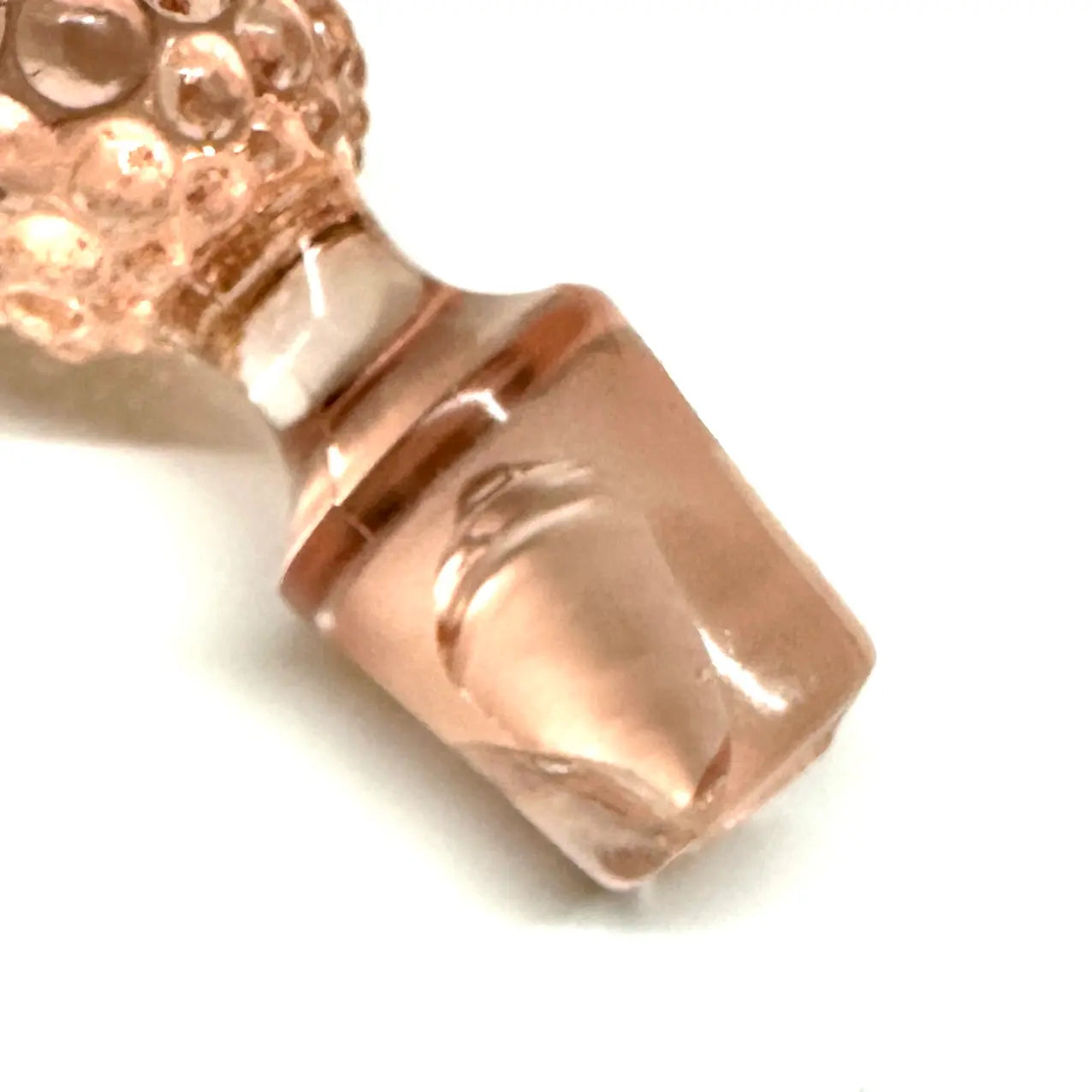 A delicate group of blush pink and clear perfume bottles with stoppers in a variety of patterns, shapes, and sizes.