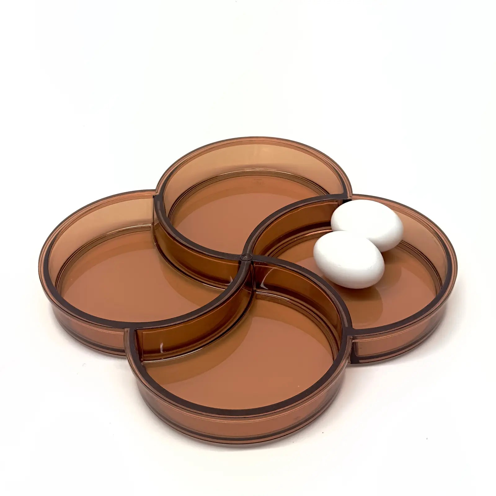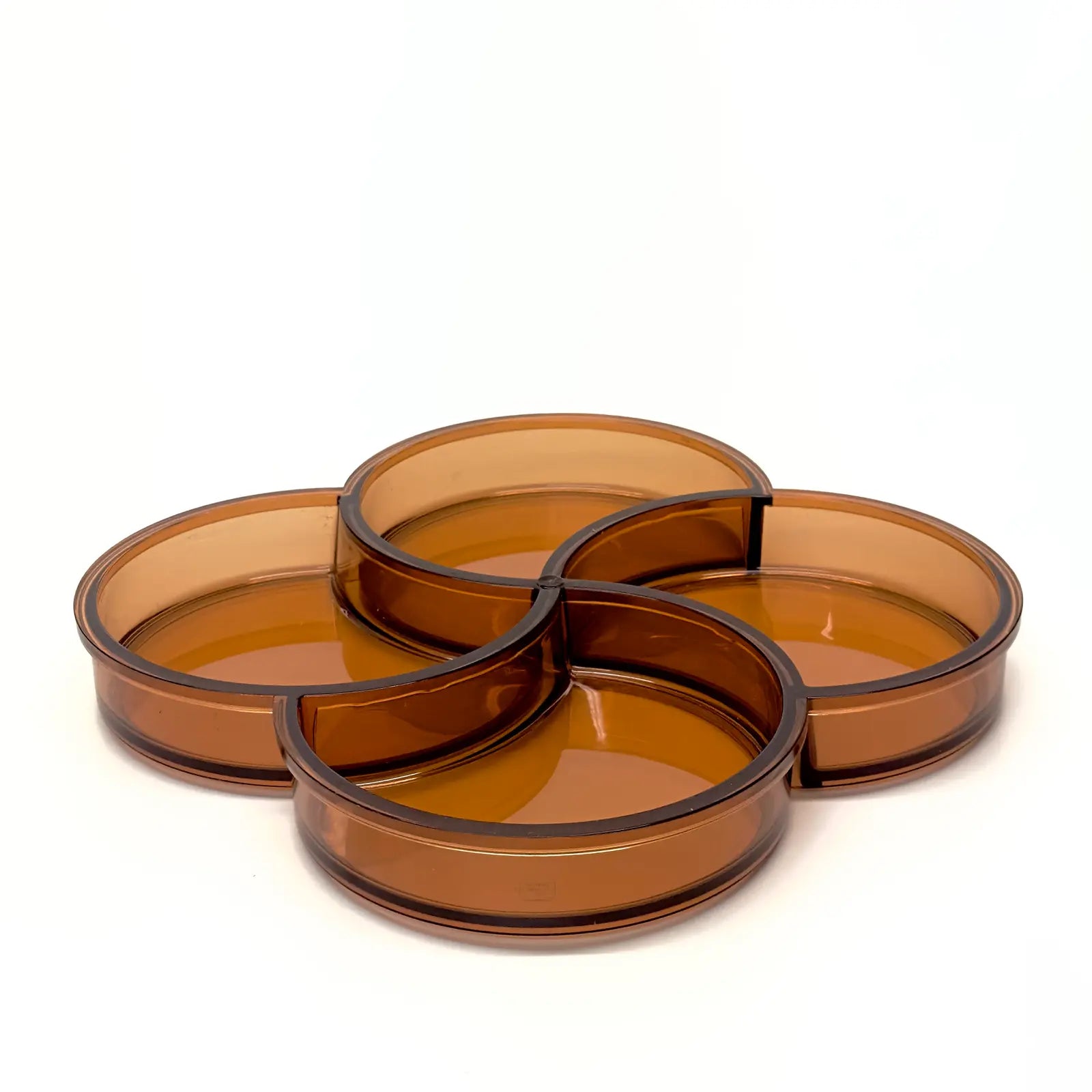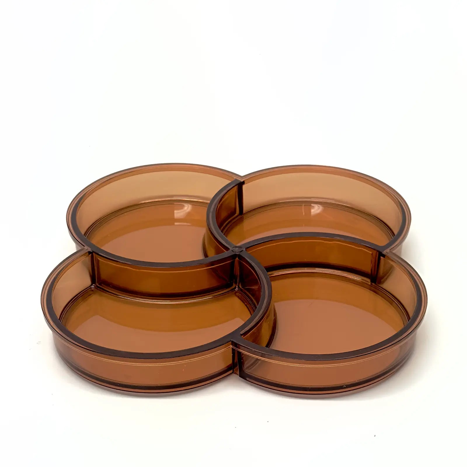 This vintage statement piece is an acrylic swirl serving tray in a burnt umber transparent brown with four sections by Gunnar Cyren for Dansk.