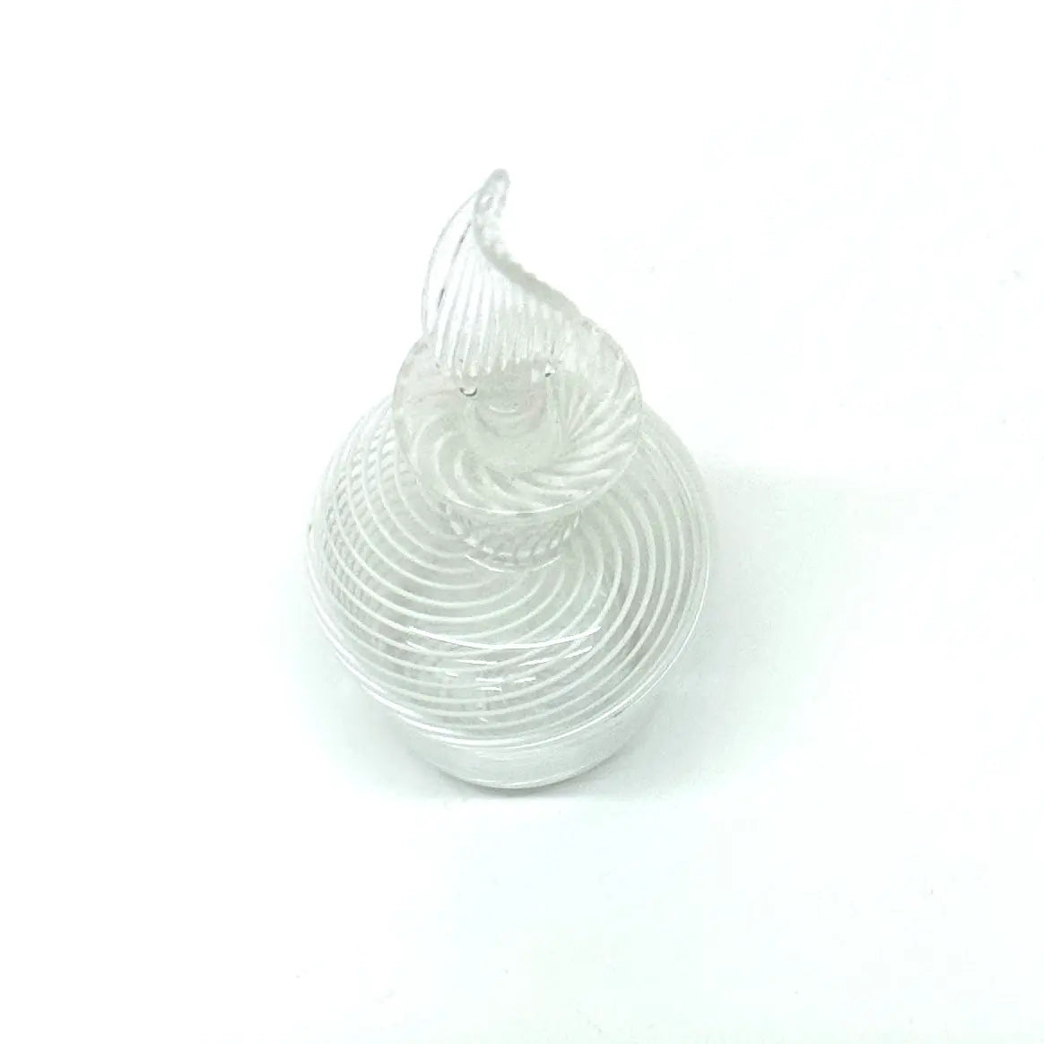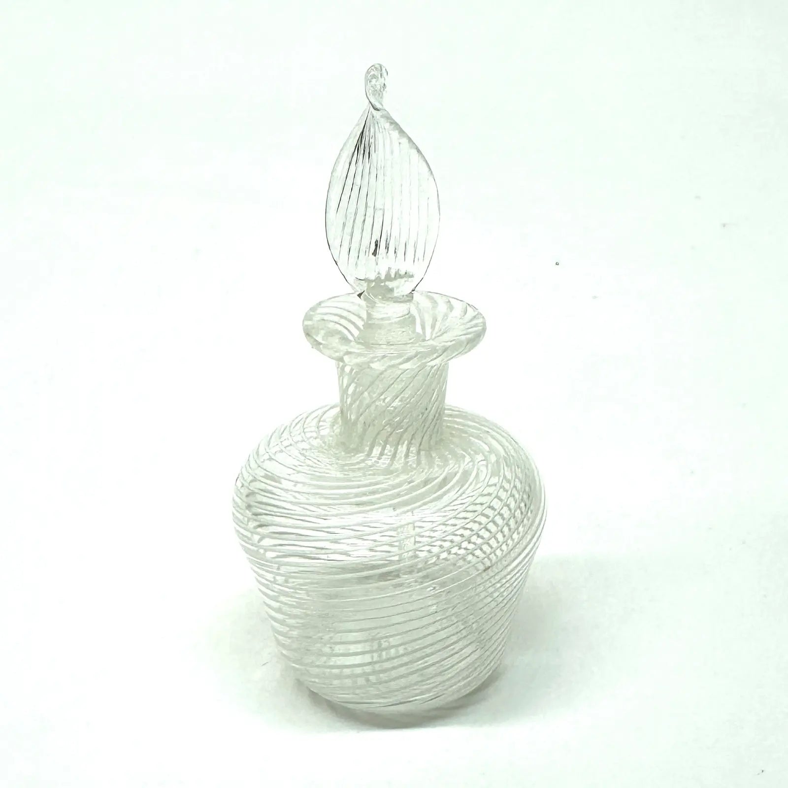 - White and clear twisted striped hand-blown art glass perfume bottle with a twisted stopper, by Murano. 4"H x 2"W