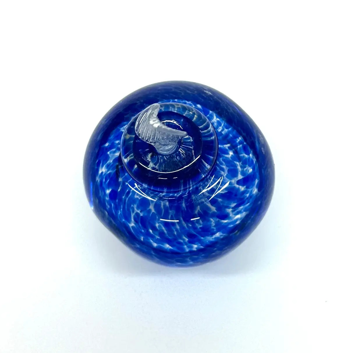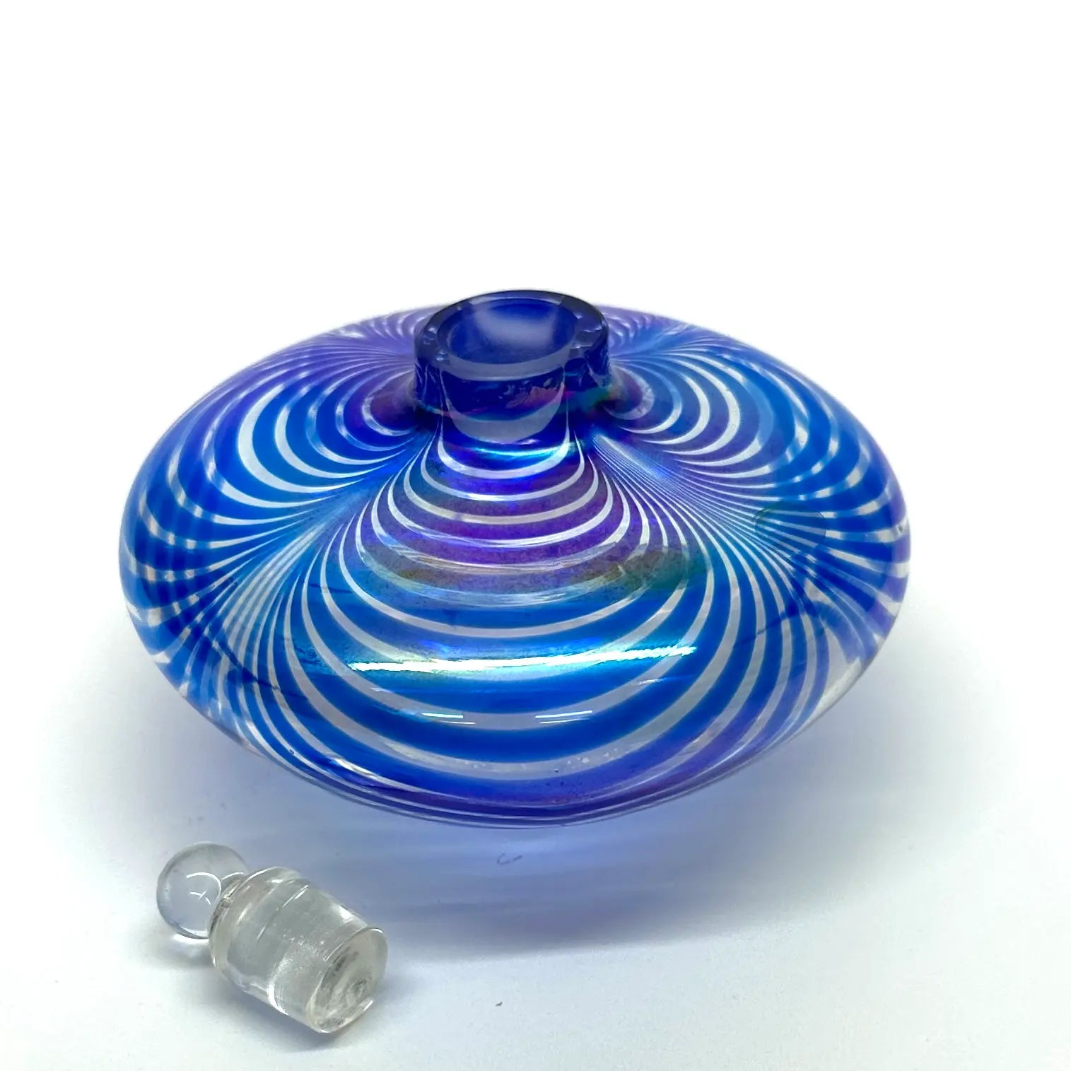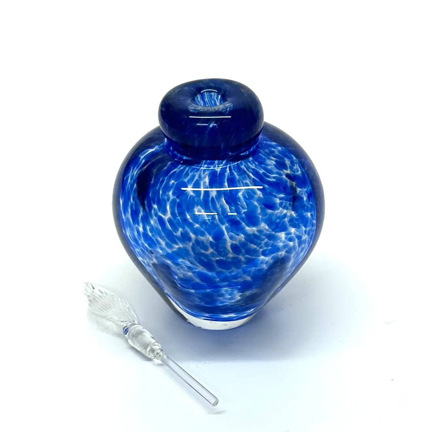 - Shiny cobalt blue and clear swirl hand-blown art glass perfume bottle with a rounded stopper; the stopper seems to have been broken off, which is why it is rounded. 3.5"H x 4.25"W